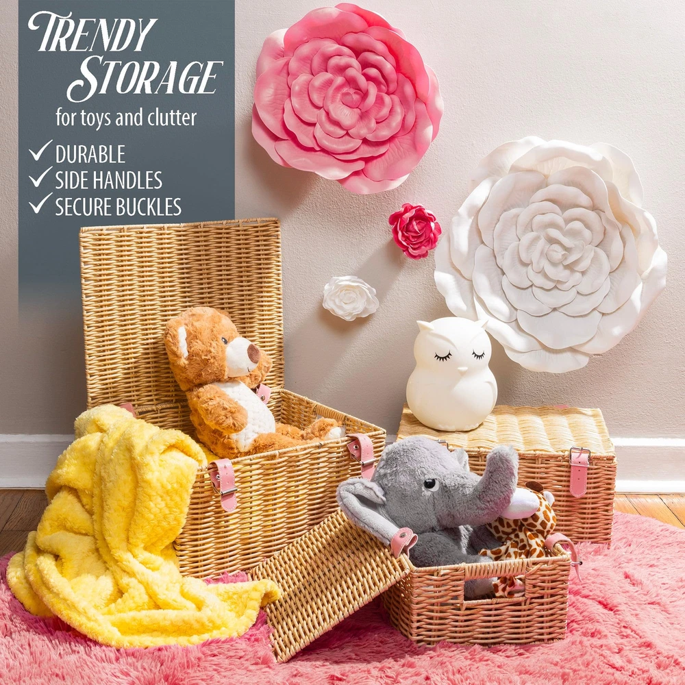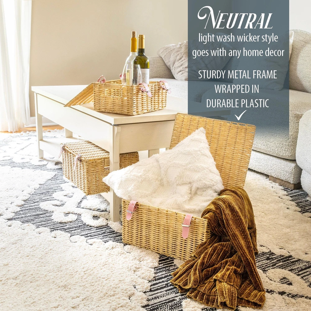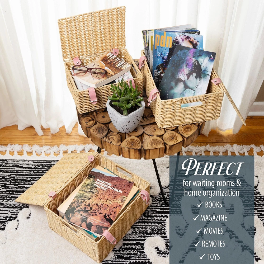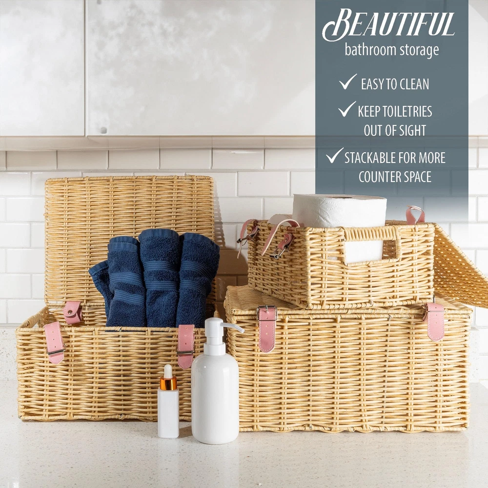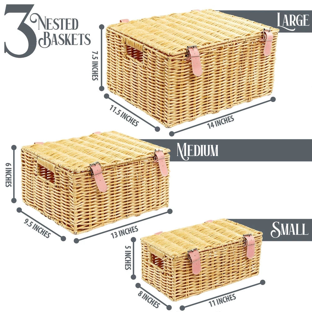 Introducing Milli’s Product, your trusted supplier of storage, organization and home decor solutions that innovation and style blend harmoniously to make everyday life easier! Committed to exceptional quality and driven by performance, Milli’s Product focuses on delivering reliable products that meet all your storage needs without sacrificing aesthetics and functionality. We are working with carefully selected materials and modern designs to bring to your doorstep amazing solutions that elevate your space while keeping it neat and tidy! Stackable Wicker Baskets – Stylish Solution for a Cozy and Tidy Space Whether you need more space to organize your essentials, want to add a boho touch to your home decor or both, the Milli’s Product wicker basket set is the way to go! This wicker basket with lid set comes with 3 organizer baskets in different sizes that adapt to all your storage and organization needs. The organization baskets have built-in handles and a chic strap as a lock, for more convenience with an elegant twist! Versatile and stylish, these wicker woven baskets blend beautifully into any decor while maximizing storage space to make your bathroom, nursery, bedroom or laundry look both tidy and modern! Use them for storing old baby clothes, toys, accessories, toiletries, blankets, or books and enjoy a comfortable living space that’s well-organized and cozy! Still not convinced? Here are some of the amazing features of our wicker baskets: 1. Set of 3 wicker storage baskets with lids; 2. Small, medium and large baskets per set; 3. Exquisite woven wicker design; 4. Ideal for kitchen, bathroom, bedroom, kitchen, living room, laundry room, nursery, and more; 5. Perfect for storing toiletries, makeup, personal care products, books, toys, baby clothes, diapers, and more; 6. Durable and sturdy; 7. Stackable and space-saving; Enjoy more storage space and an elegant touch with our wicker baskets! A Must for a Tidy Home: Make more storage room and keep your essentials well-organized while adding a boho touch to the decor with our covered woven baskets for storage with lid! An amazing blend of style and practicality, these stackable wicker storage cubes with cover organize and elevate your living space! High-End Wicker Design: These wicker storage baskets feature a tight woven construction that’s sturdy and durable, built to last for years to come. Our decorative baskets boxhave a strong metal frame covered in durable plastic to ensure long-lasting use and enhanced resistance over time. Incredibly Versatile: The wicker cube storage bins are spacious and versatile, blending effortlessly into any corner! You can use them in your bathroom, bedroom, kitchen, office, nursery or living room to organize, sort, and store your extra essentials, keeping everything neat and clean! Convenient and Practical Set: Available in Regtangular small, medium and large, these wicker storage bins with lid and lock meet all your storage needs! They are perfect for storing toiletries, makeup, personal care products, as well as books, toys, baby clothes, magazines and much more! A Chic Touch for Home Decor: Not only are space-saving thanks to their stackable lidded design but also modern and stylish! Featuring a natural color and beautiful craftsmanship, our woven storage baskets adorn your space with a boho touch while keeping everything organized and out of sight!