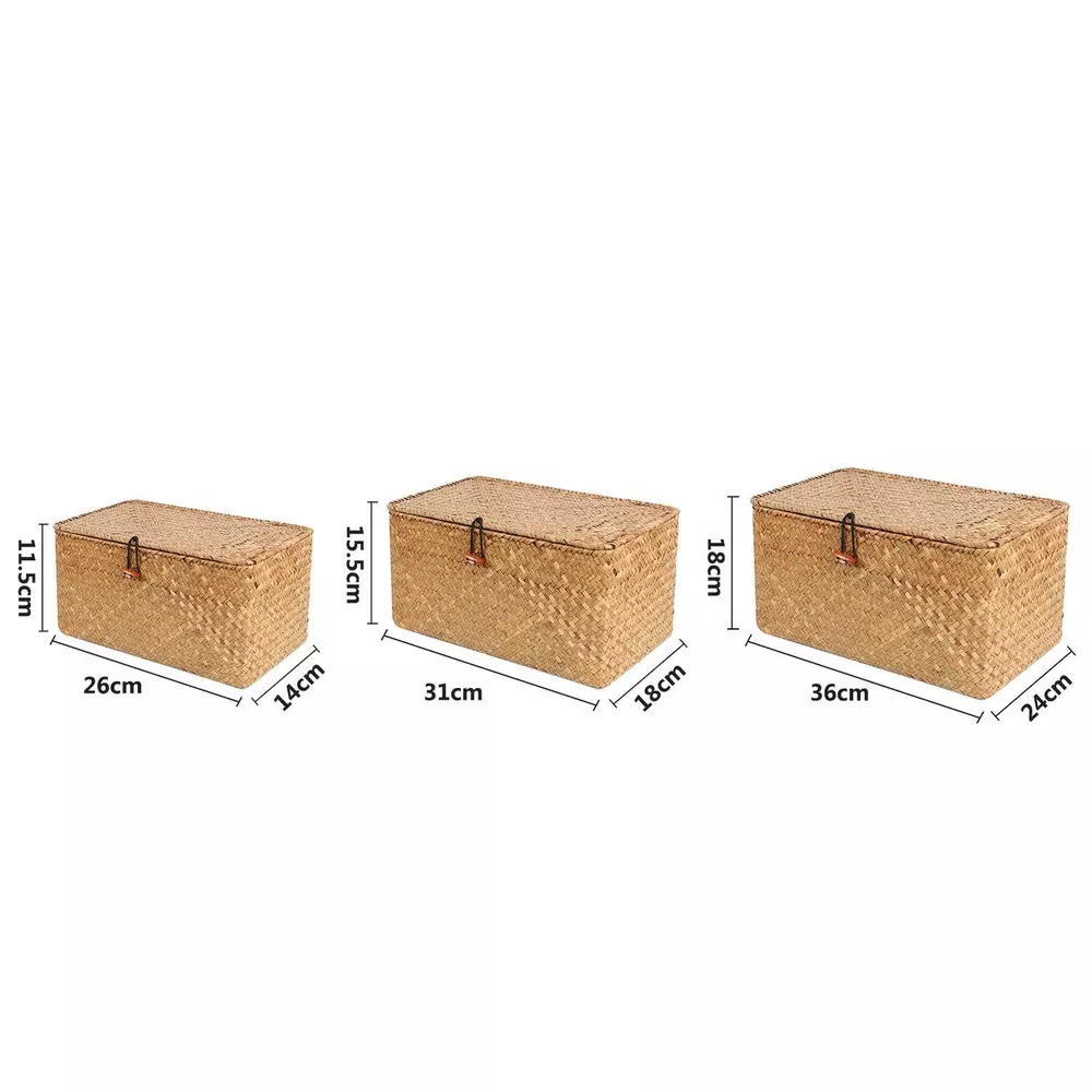 Set of 3 Wicker Basket - Multiple sizes are combined to meet daily storage needs.Large baksets:14.2"x9.4"x7.3", Medium Baskets:12.2"x7.1"5.9",Small Baskets:10.2"x5.5"x4.3" Premium Material - Woven storage basket is made of 100% natural wicker and metal frame with a light grass scent, perfect for storing nightstands. Storage basket with lid is closed by a buckle, which is dust-proof and prevents naughty babies or pets from opening the box, so that the items have a safe storage environment. Wicker baskets with lids add a boho style to home decor and are perfect for bathrooms, bedrooms, kitchens, living rooms and more. It is not only a stunning decorative boxes, but also a versatile storage boxes with a lock. Decorative Storage Bins are great for organizing Kids Toys, Snacks, Books, Make up and Hair Accessories and other small things.It can be displayed anywhere you want without taking up too much space.