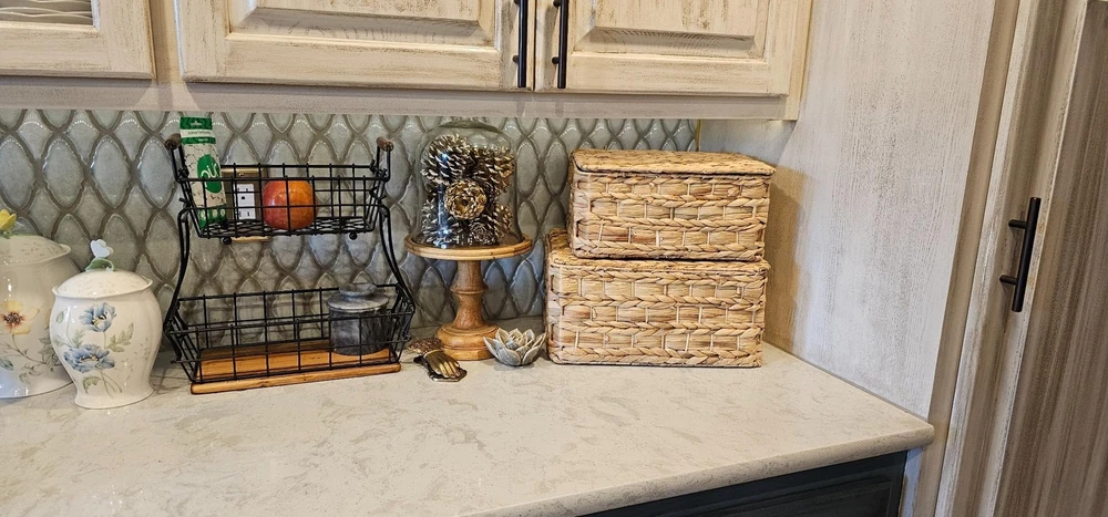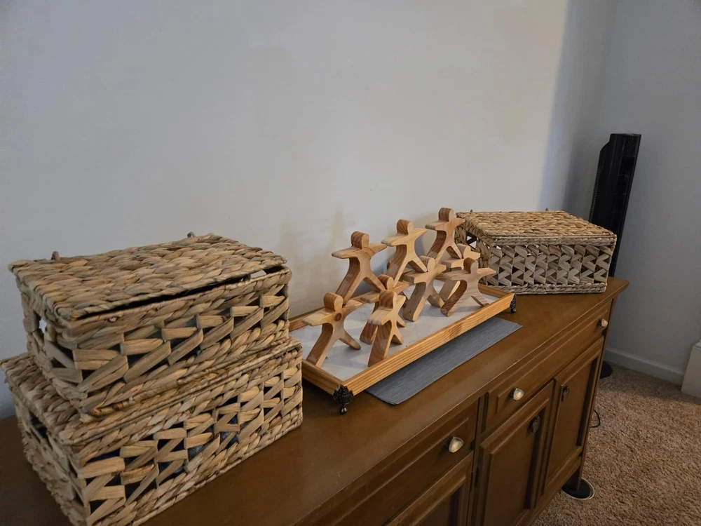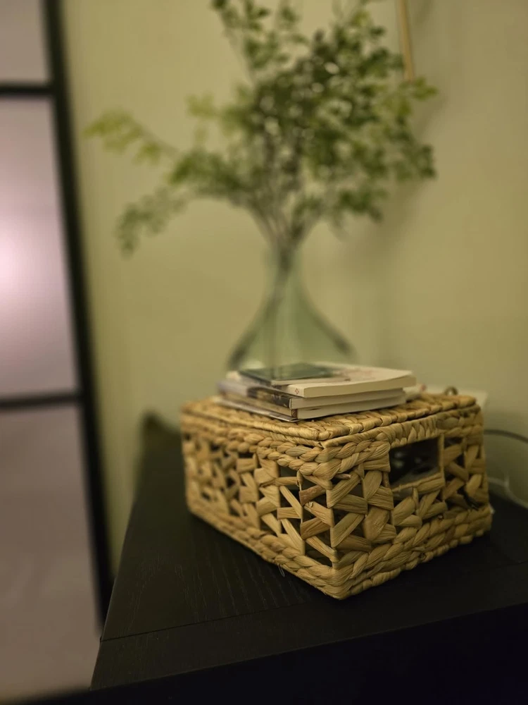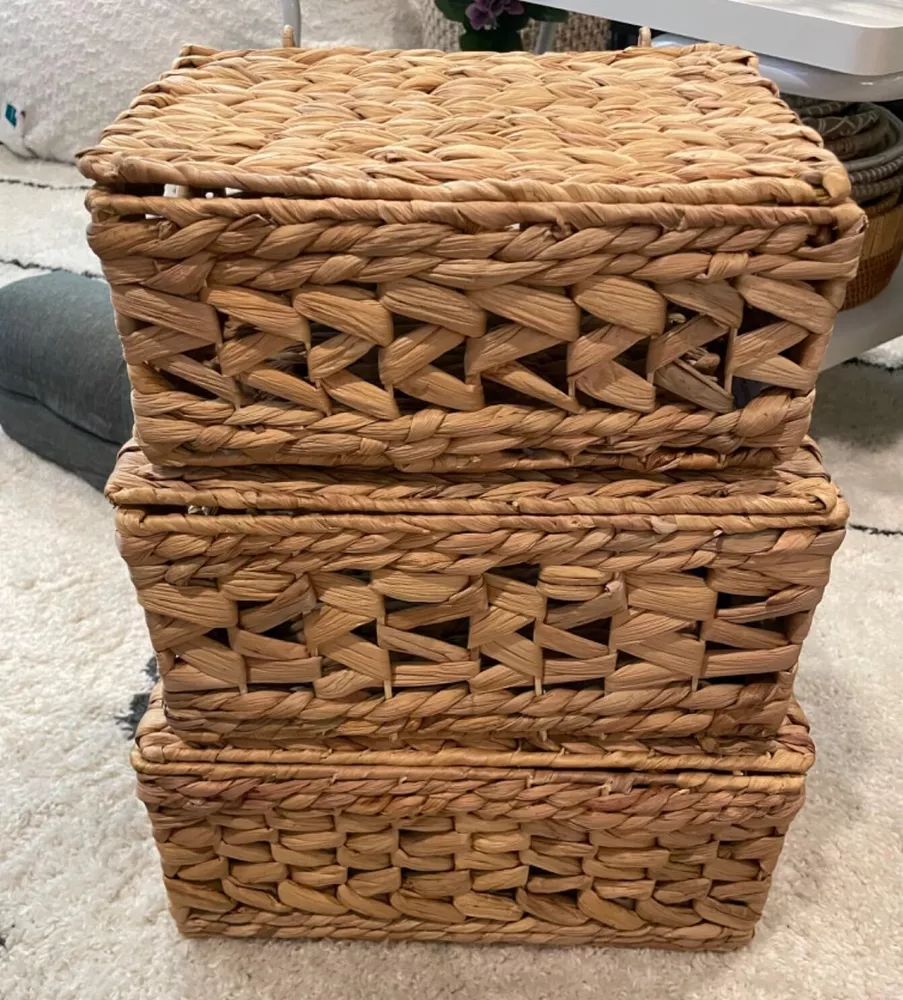 πΏ [πππππππ ππππππππ] Handwoven from water hyacinth, these lidded wicker baskets add a warm atmosphere to your home. Durable fibers and chemical-free, they will accompany your home for a long time! π§‘ [ππππππ πππππππππ πππππππ] Designed with a wavy open-weave pattern, these woven baskets are an irresistible item to mix and match with your furniture. Its appearance is suitable for many home decor styles, from rustic to bohemian. π¦ [ππππππ π πππππ] Our wicker baskets with lids are woven around a sturdy metal wireframe that reinforce their structure under any weight. Not only do they add a touch of style to your home, their flexible strands with steel frame can reliably withstand everyday use. Store up to 12 pounds in the large-size basket! π― [ππππππππ ππππππππ] These versatile baskets serve multiple purposes, including closet organization, toy storage π§Έ, bathroom tidying π§», pantry organization πΏ, book & magazine storage π, under-bed storage, and more. π§° [πππππ-ππ πππππππ] With our built-in handles, you can easily move these baskets everywhere in your home. The handles are specially crafted by water hyacinth which is softer than other natural material to make sure that there is no splinter that can piercing your skin. β [ππππ] Each square hyacinth basket is handcrafted, which may result in slight variations in shape, size, and color. This set includes three sizes: L14" x W11" x H7", L12.5" x W9" x H6", and L11" x W8" x H5". Suitable for indoor use only; All new wicker storage baskets have a particular natural smell of fibers that gradually disappears.