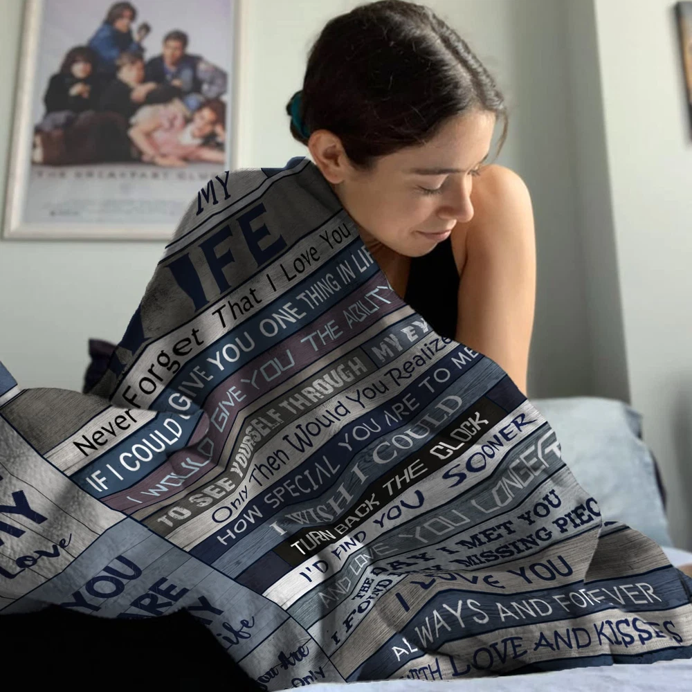 【MATERIAL DESCRIPTION】: Made Of Non-Pilling Fleece, More Comfortable And Warm. Does Not Absorb Any Moisture. Lightweight, And Can Be Folded Compactly. Super Soft And Completely Resist Shrinkage And Wrinkles. 【SIZE DESCRIPTION】: There Are 60x50 Inches for Wife from Husband. 【TO MY WIFE】:Never Forget That I Love You. If I Could Give You One Thing In Life, I Would Give You The Ability To See Yourself Through My Eyes. Only Then Would You Realize How Special You Are To Me. I Wish I Could Turn Back The Clock. I'd Find You Sooner And Love You Longer. The Day I Met You, I Found My Missing Piece. I Love You Always And Forever. 【APPLICABLE SCENE】: The Blanket Easy To Carry, It Is Very Suitable For Indoor And Outdoor Use In Cold Weather (Especially During Camping And Picnic) To Provide Continuous Warmth, And It Is Also Very Suitable For Lying On A Bed, Sofa, Car, And Office, Etc. Whether Summer Or Winter. 【PERFECT GIFT】: When You Bring The Blanket For Your Wife, It Will Be A Perfect Gift For Wedding Anniversary, Birthday, Christmas, New Year's Day, Valentine's Day, Mother's Day, Wife Appreciation Day, Family Gathering, Party And Other Festivals. It Will Be A Great Gift!