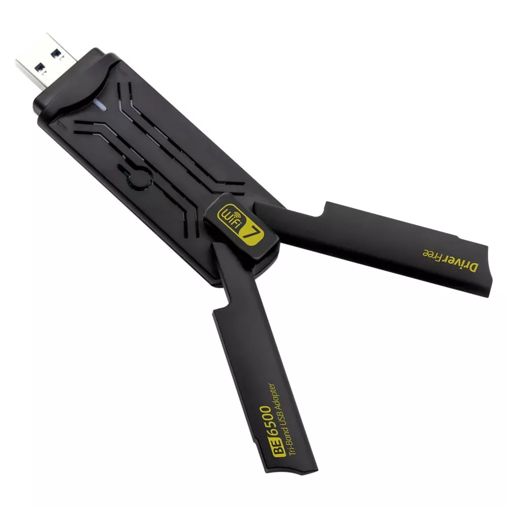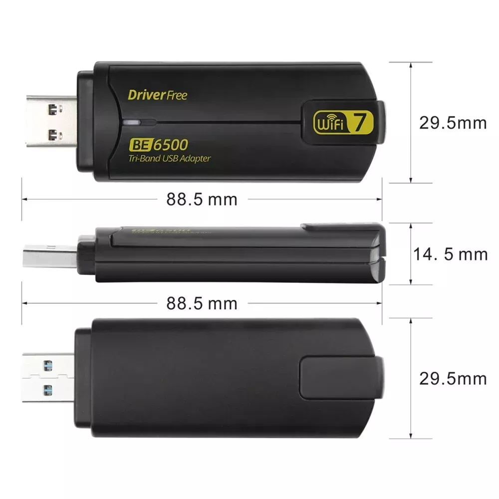 KEY FEATURES 1.Tri-Band 6500Mbps wireless transmission rate 2.Dual band frequency: 2.4GHz 688Mbps 5.8GHz 2882Mbp 6 GHz 2882Mbps 3.Driver Free 4.Built-in FEM (PA + LNA) module, creates stronger signal and wider signal receiving range. 5.4096-QAM high data rate Modulation delivers powerful, continuous Wi-Fi to fully unlock the potential of Wi-Fi 7 router. 6.Supports Windows Windows10 (32/64bits), Windows 11(32/64bits). 7.Seamlessly compatible with 802.11be/ax/ac/a/b/g/n devices Specifications: Chipset:Realtek RTL8912AU Interface:USB3.2 Hi-Speed connector Wireless Speed:2.4GHz: Up to 688Mbps / 5GHz: Up to 2882Mbps / 6Ghz: Up to 2882Mbps Frequency Range:2.4GHz& 5 GHz&6 GHZ Wireless TransmitPower:20dBm(MAX EIRP) Modulation Technique:DSSS / DBPSK / DQPSK / CCK / OFDM / OFDMA / BPSK / QPSK / 16-QAM / 64-QAM / 256-QAM / 1024-QAMA/ 4096-QAMA Wireless Security:64/128 bits WEP, WPA/WPA2, WPA-PSK/WPA2-PSK (TKIP/AES) /WPA3 HumiditDimensions (H x W x D):88.5x29.5x14.5mm
