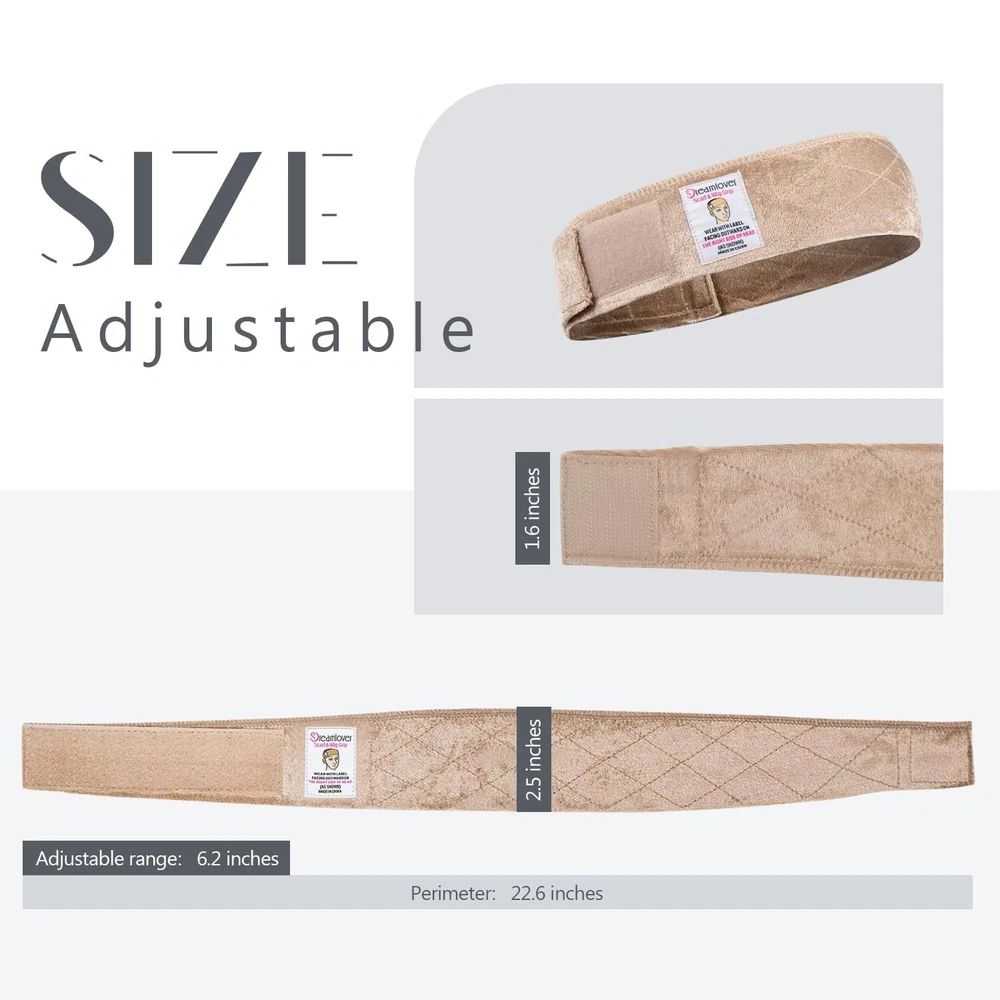 About this item Dreamlover wig grip band is made of thinner and soft velour fabric to make it super breathable, especially in summer. Lengthened hook and loop fastener design of the wig grip allows you to adjust the most comfortable tightness on your hairline, which is good for fitting different head sizes. A row of precise stitches sewed on the top of the wig grip headband ensures durable use. Stylish and neat rhombus lines are more attractive. Widened frontal band and narrowed backside of the wig grip band can cover the most-slipping area to reinforce its friction. So it can brings you more security. Warm Tips: Please wear the wig grip headband with Dreamlover Logo facing outward on the right side of head to make sure no slippage. The tan color looks lighter when being viewed from a reflective angle, and looks a bit darker when there’s no direct light on.