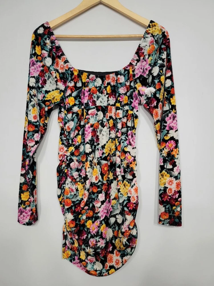Wild Fable Velvet Floral Ruched Off Shoulder Dress Women's Medium Polyester Spandex Stretchy material Pre-owned great condition 30 inches long 15 inches across E1F