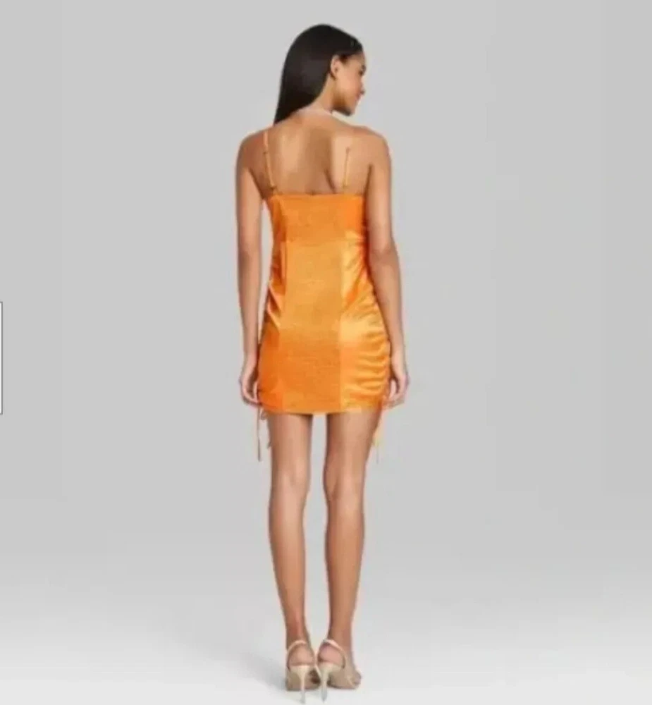Elevate your wardrobe with this stunning Wild Fable Women's Satin Sleeveless Dress in a beautiful orange hue. The dress features a bodycon style with a side ruched detail that flatters your figure. The pullover closure and stretchy fabric make it comfortable to wear, while the short length adds a touch of playfulness. Perfect for a night out or a special occasion, this dress is a must-have for any fashion-forward woman. Available in size small, this dress is a great addition to your collection.