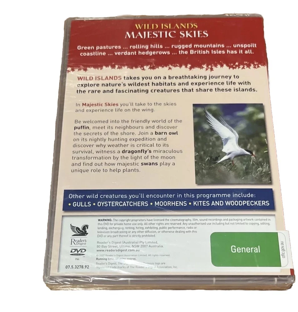 Wild Islands Majestic Skies DVD showcases the breathtaking beauty of nature in all its glory. With a running time of 60 minutes, this documentary takes viewers on a captivating journey through wild islands, featuring majestic skies and stunning landscapes. The DVD is in PAL video format, suitable for regions 4 (AU, NZ, Latin America...), and comes in a tall/DVD case for easy storage. Rated G, this nature documentary is a perfect addition to any wildlife enthusiast's collection.