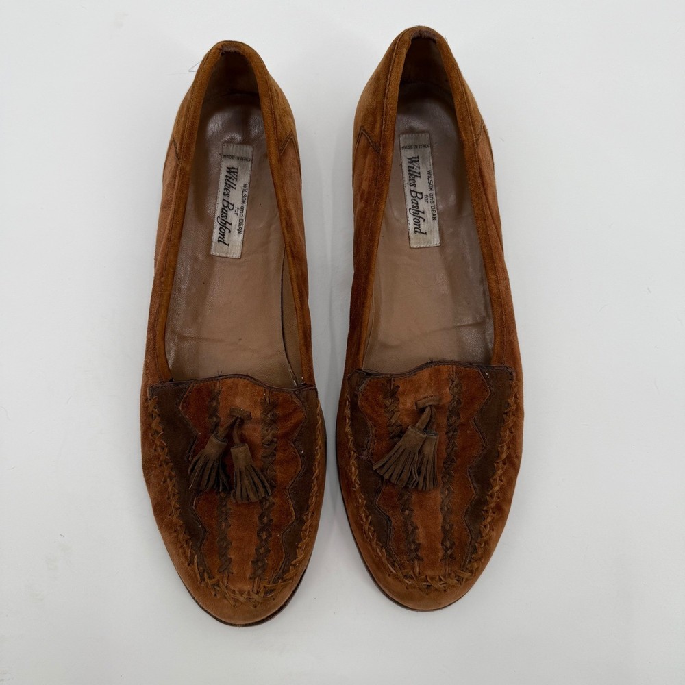 Please see photos for condition. Handsome suede leather loafers featuring a classic tassel design. These stylish shoes showcase a rich brown hue and intricate detailing along the upper. Crafted with quality and attention to detail, these loafers offer both comfort and sophistication. The design includes a traditional slip-on style, making them easy to wear for various occasions. Made in Italy, these shoes reflect a commitment to superior craftsmanship and timeless style. Color: Brown Department: Men Style: Loafer Upper Material: Suede Pattern: Solid Features: Comfort, Slip-On, Tassel, Made in Italy, Leather Lining Shoe Width: D Type: Dress Outsole Material: Leather Insole Material: Leather Model: Tassel Loafer Keywords: Wilkes Bashford, Wilson and Dean, Mens Loafers, Suede Loafers, Tassel Loafers, Brown Shoes, Leather Shoes, Slip On Shoes, Mens Footwear, Made in Italy, Designer Shoes, Classic Loafers, Vintage Loafers