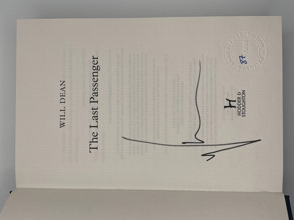 THE LAST PASSENGER [Signed] Author: Dean, Will Title: THE LAST PASSENGER [Signed] Publication: London, UK: Hodder & Stoughton, 2023 Edition: Limited Edition #87/250 Description: Octavo, 486 pages. In Very Good condition with Very Good condition dust jacket. Spine is navy with white and red lettering. Dust jacket protected by mylar covering, price uncut: "£16.99" on front flap, and has mild shelving wear along spine tail. Boards have mild shelving wear along spine head and tail, small surface tear from publisher’s binding glue (pictured). Signed flat by Will Dean on title page. Shelved in hallway. Seller ID: 1388344 Subject: Literature Welcome to the eBay store of Second Story Books! DC's Oldest Rare and Used Bookstore, Second Story Books operates two open shops in the Washington D.C. metropolitan area. We have an extensive internet presence and provide accredited appraisals member ASA. This listing was created by Bibliopolis.
