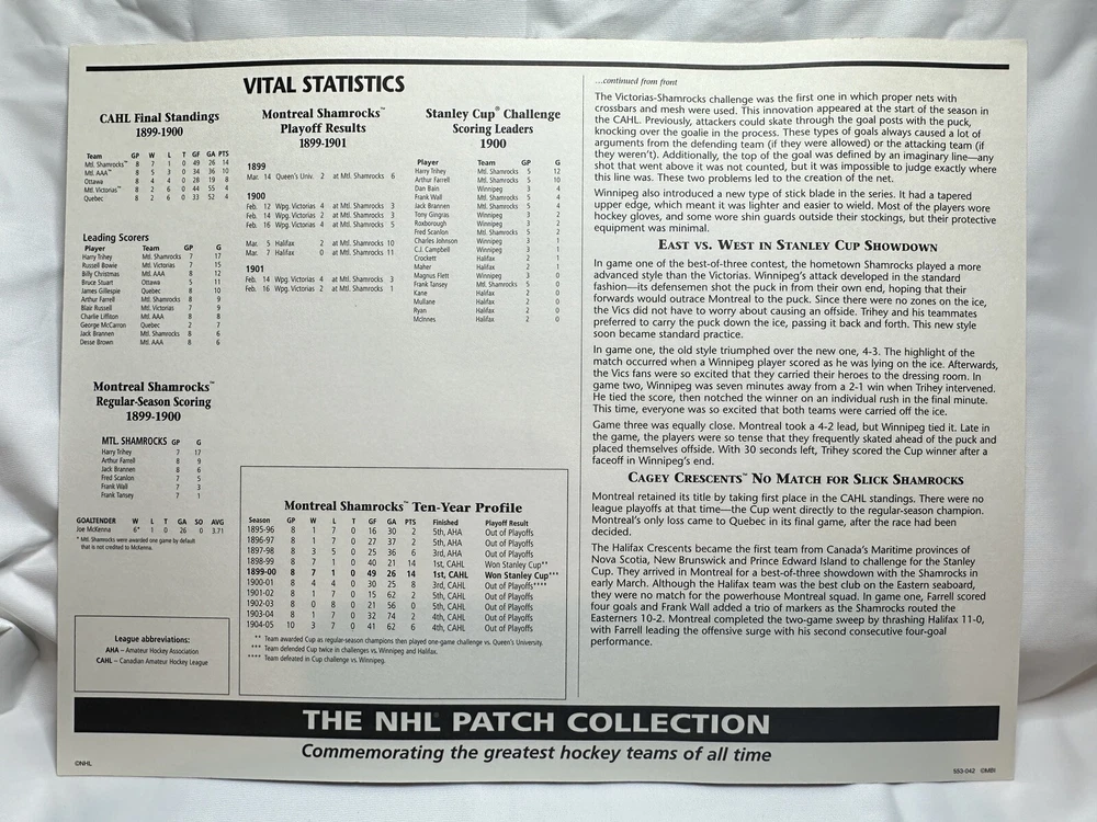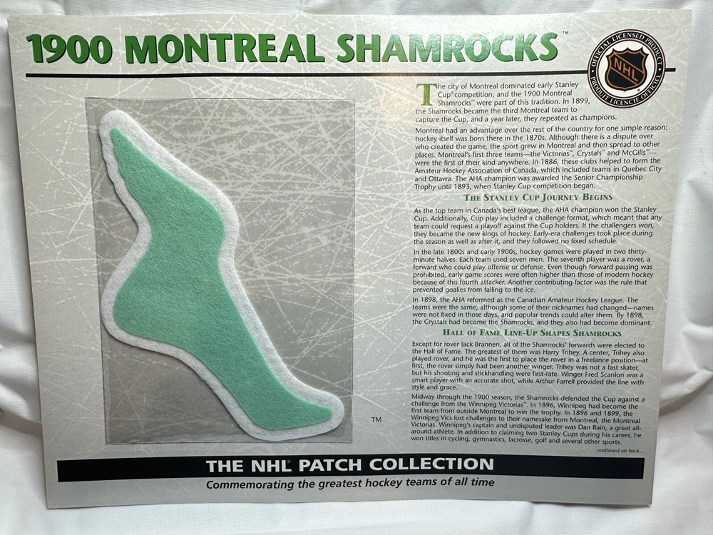 Willabee & Ward 1900 Montreal Shamrocks NHL Hockey Patch Reproduction. Beautifully crafted and officially licensed. Released in the 1990s as part of the 50 Patch Collection by Willabee & Ward. See our other NHL Patch auctions. Single Patch & 10”x13” Stat Sheet in Excellent Condition.