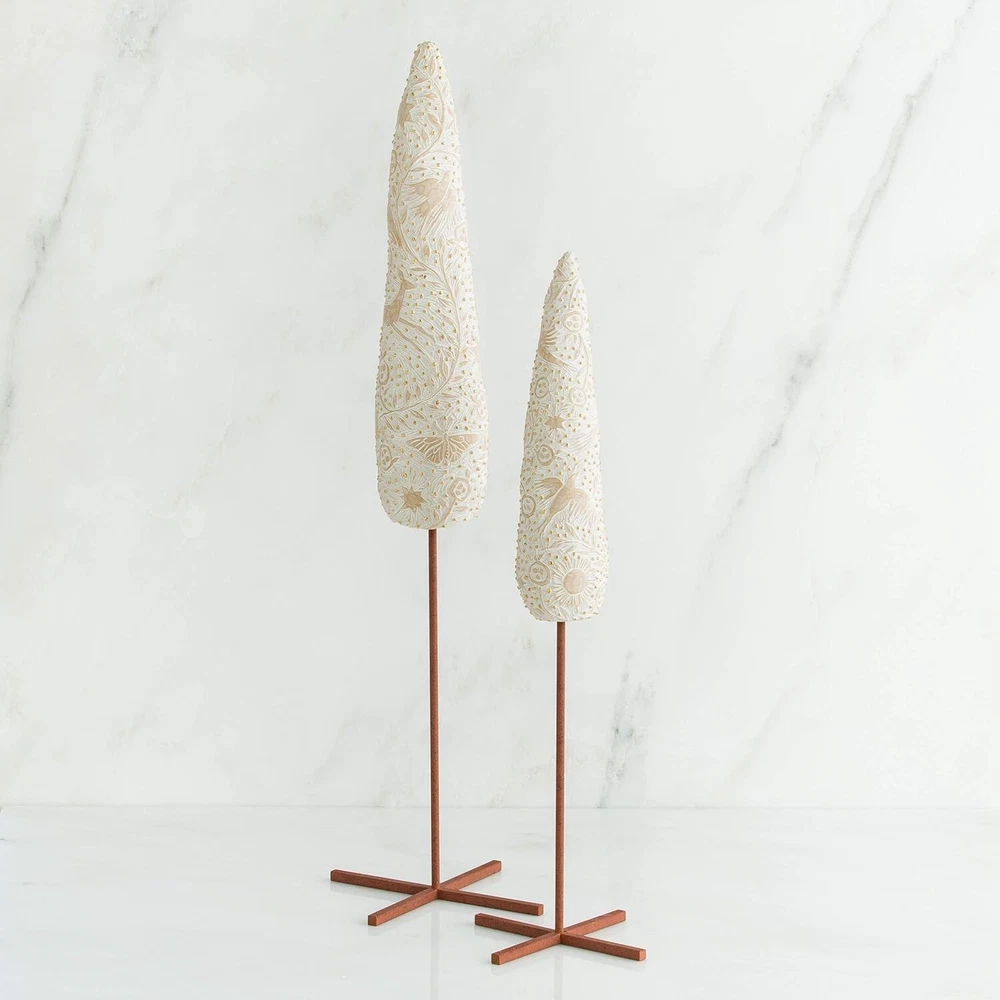 Sentiment: ”Rooted in the earth, reaching toward the sky” written on Enclosure Card Two hand-painted resin trees, tallest is 16.5”h. Cream-colored, slender, vertical sculptures; one taller, one shorter. Surfaces extensively carved with symbols of nature and dotted with gold leaf. Trees elevated on metal rods with stable base, sized to complement the Willow Tree Nativity collection. The two-piece set of Cypress Trees is designed to enhance the Willow Tree Nativity. The elegant architecture of these majestic yet simple trees creates a visually uplifting form in the nativity collection. Each tree is uniquely carved with symbols of nature. Pinpoints of gold leaf reflect light and create interest. Packaged in fitted box ready for gift-giving. Artist Susan Lordi hand carves the original of each Willow Tree piece from her studio in Kansas City, MO. These pieces are cast from Susan's original carvings and painted by hand. Ready to display on a shelf, table or mantel. To clean, dust with soft brush or cloth.
