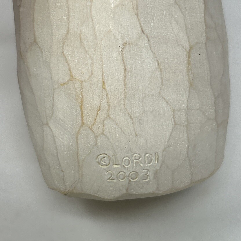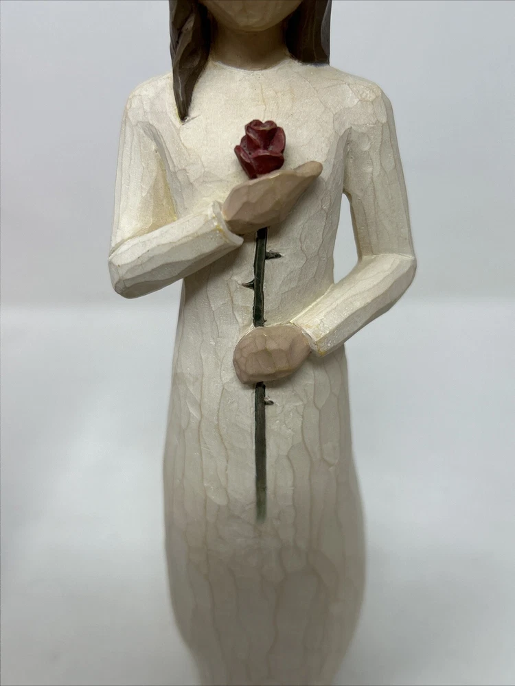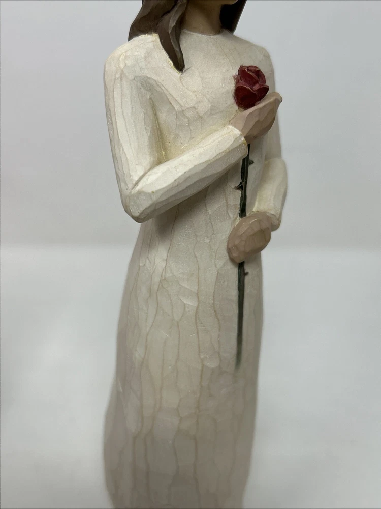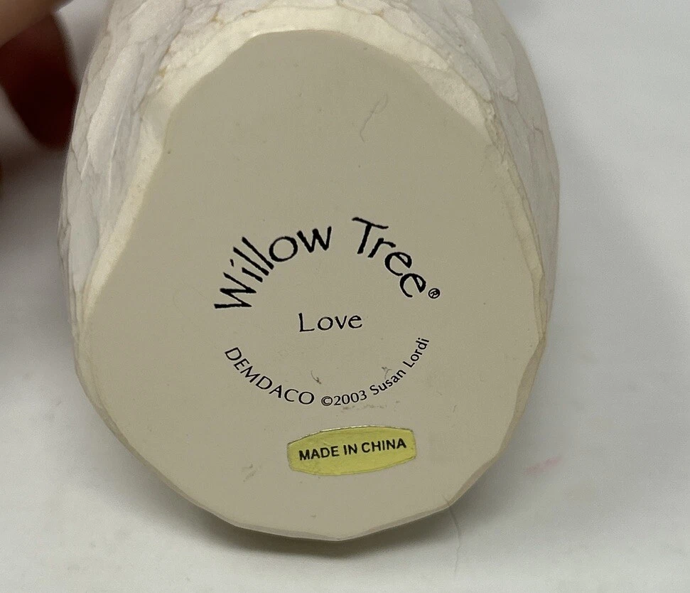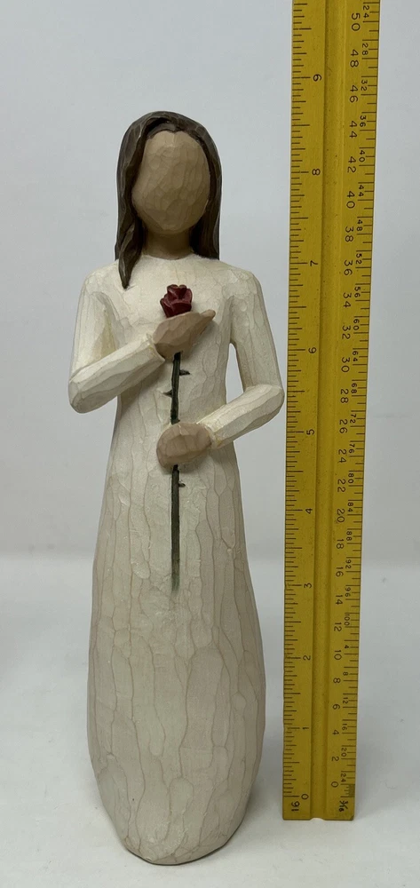 This beautiful Willow Tree figurine by Susan Lordi is a must-have for any collector. Titled "Love," it features a stunning abstract design with a single rose and a tan color finish. Measuring 9 inches in both height and length, it is the perfect size for display on any shelf or table. This figurine was manufactured in 2003 by DEMDACO and is part of the Willow Tree collection. It is an original piece and not a reproduction. The figurine is made of clay and has a matte finish. It is not handmade and was produced using job production techniques. This piece is perfect for all occasions and is a great addition to any decorative collection. Check pictures for condition and measurements for size.