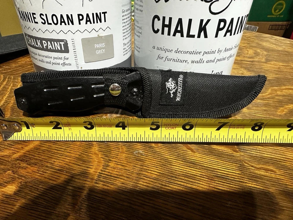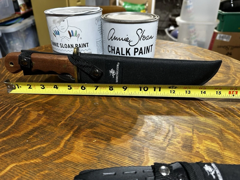 Winchester Knife Lot Lot includes Bowie knife with sheath, knife with sheath. Wooden handle with 2 blades and a 3 blade knife. No nicks or nothing broken. Great for gifts!