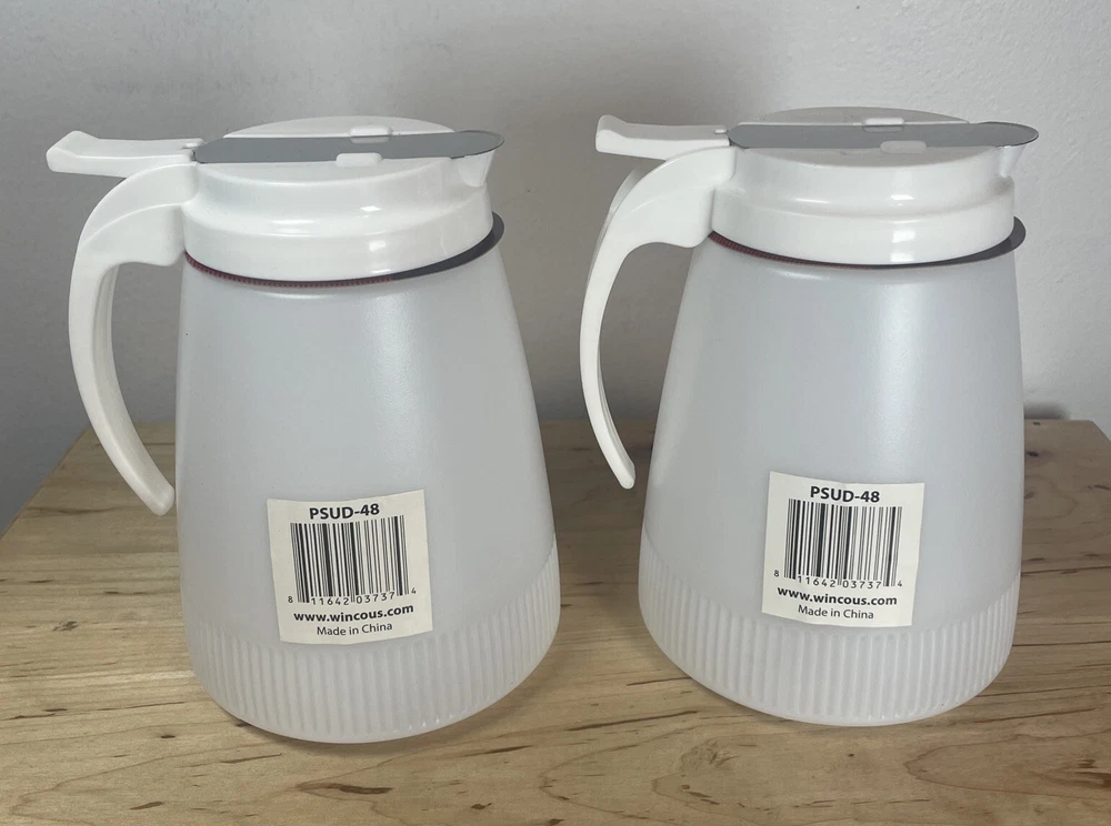 This Winco PSUD-48 Plastic Syrup Dispenser set is perfect for your restaurant or food service business. The set includes two 48 oz syrup dispensers made of durable plastic that can withstand regular use. The brand name Winco ensures quality and reliability for your customers. The unit type is in fluid ounces and the model number is PSUD-48. This set is ideal for serving syrup or other beverages and is a great addition to your tabletop and serving equipment. Order now and enjoy the convenience of these durable and practical syrup dispensers.