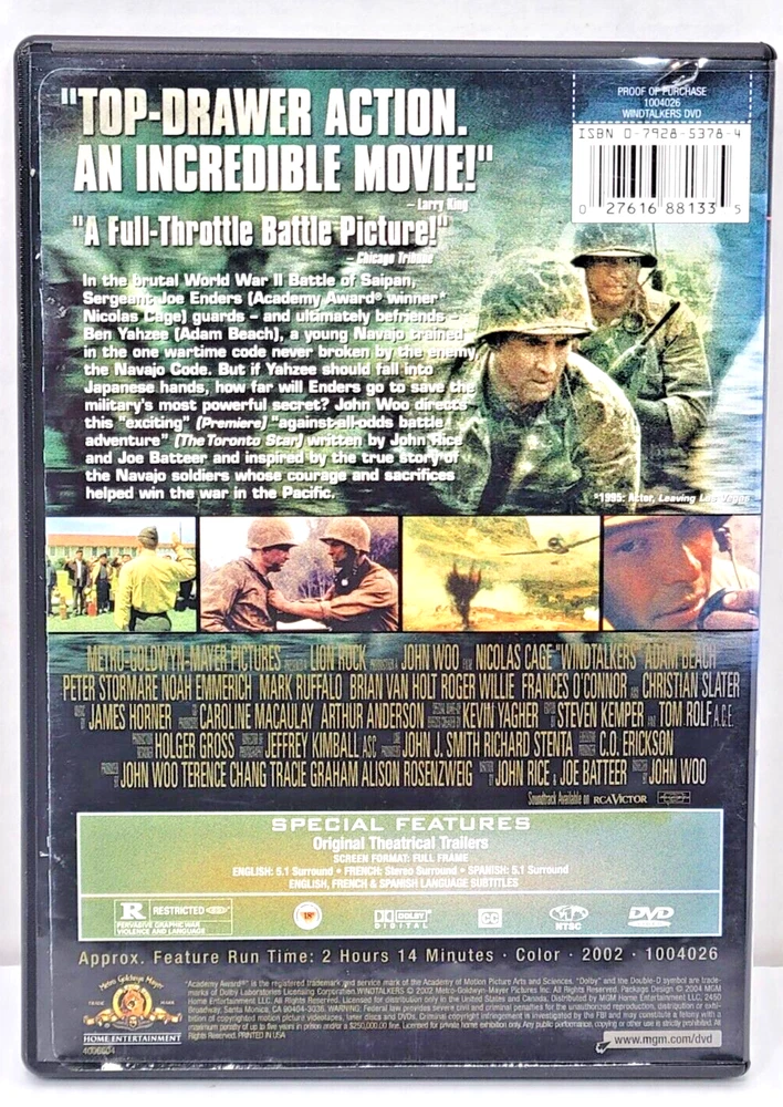 Here's a bit about the movie: Set during World War II, focuses on the Navajo code talkers Nicolas Cage plays a U.S. Marine ordered to protect a Navajo code talker The Navajo soldiers transmit secret tactical messages over radio using their native language Also stars Adam Beach as the young Navajo recruit assigned to Cage Directed by John Woo in his first American war film Tense battlefield sequences and ambush attacks in the South Pacific Dramatizes the vital role of the Navajo code that the Japanese could not decipher Explores the prejudice the Native American code talkers faced from fellow Marines Christian Slater co-stars as a skeptical Marine struggling to trust his Navajo counterpart Peter Stormare plays a sadistic Japanese commander trying to break the code The film received mixed reviews but was praised for battle scenes and visuals Rated R for graphic war violence Each item is carefully packaged to prevent any damage and is shipped immediately with tracking.