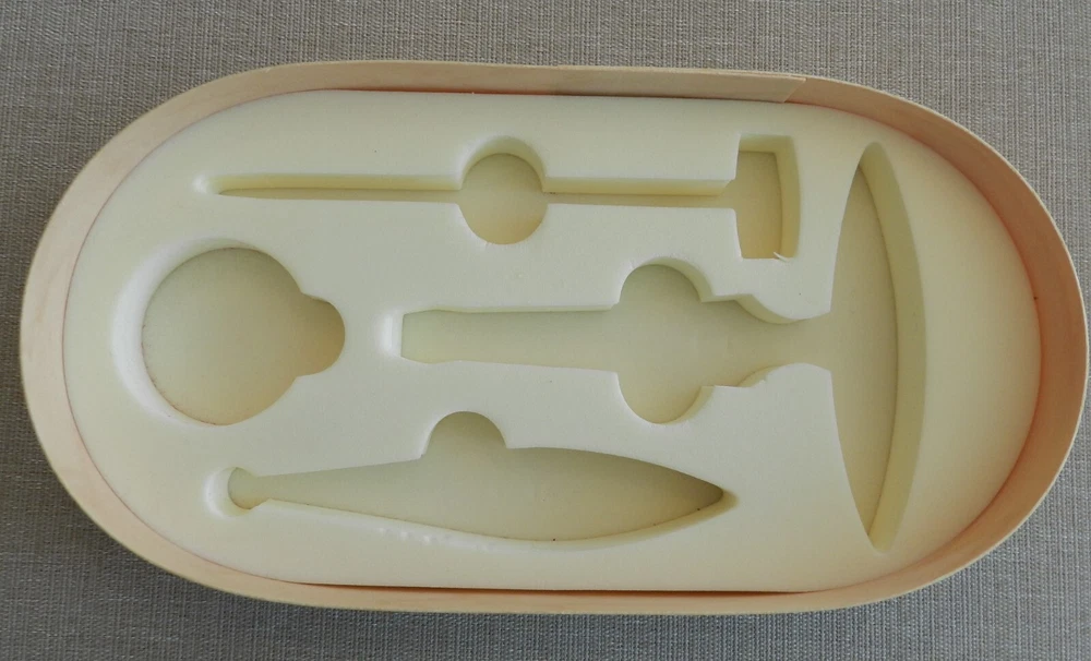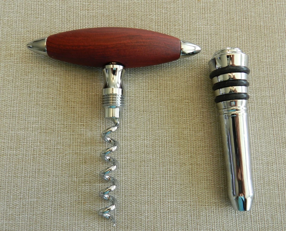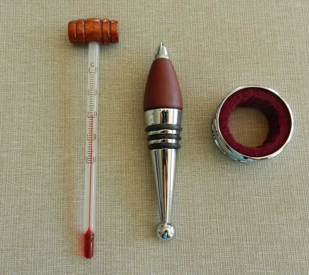 4 piece wine opening and serving set in beautiful storage box. New, never used, purchased in Portugal, This set includes corkscrew bottle opener, wine thermometer (C), wine bottle drip prevention collar, and bottler stopper. Cork screw and stopper made of highly polished steel and wood. The oval storage box measures about 8-1/4" x 4-1/4" x 1-1/2". The corkscrew/bottle opener measures about 4-1/2" long overall while it's handle is about 3-1/4" wide. It is heavy and has a good feel. The thermometer is about 5" long overall. See pictures for details. This item makes a great gift for any wine enthusiast.