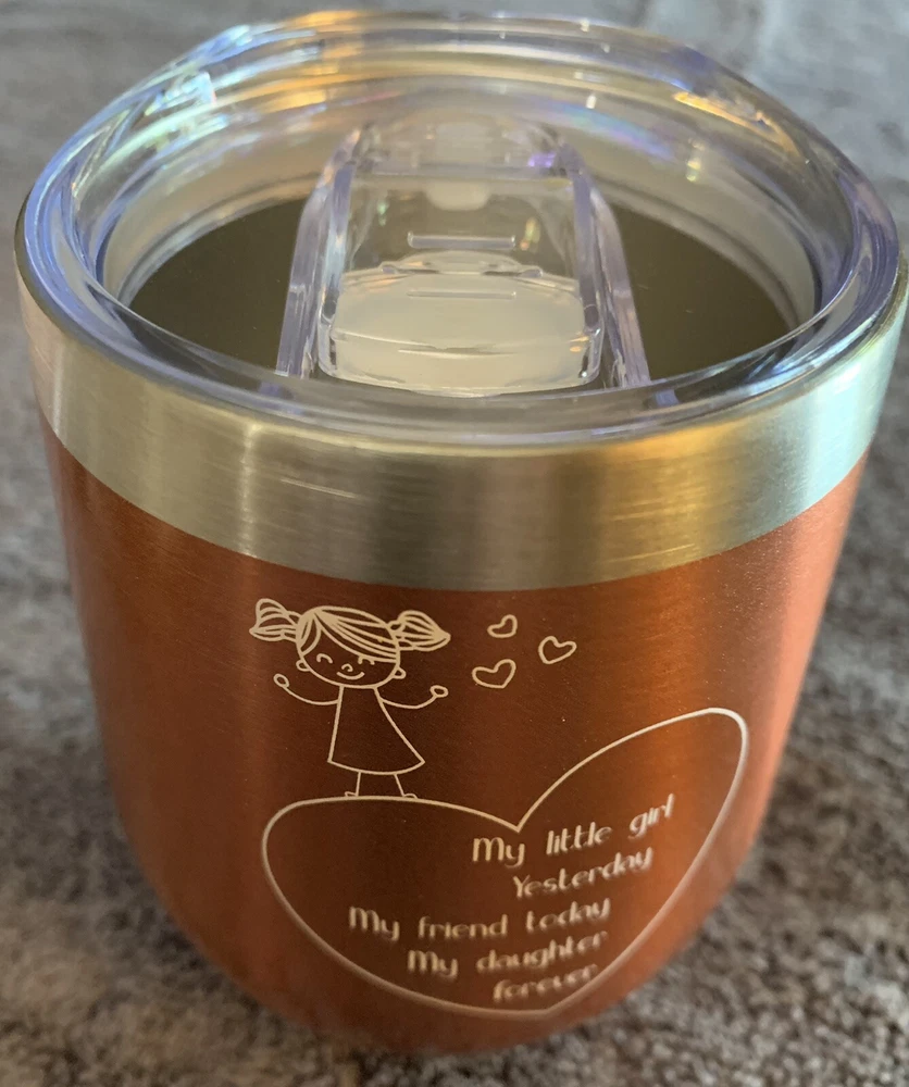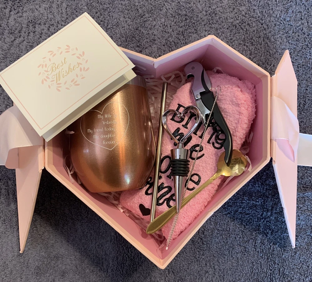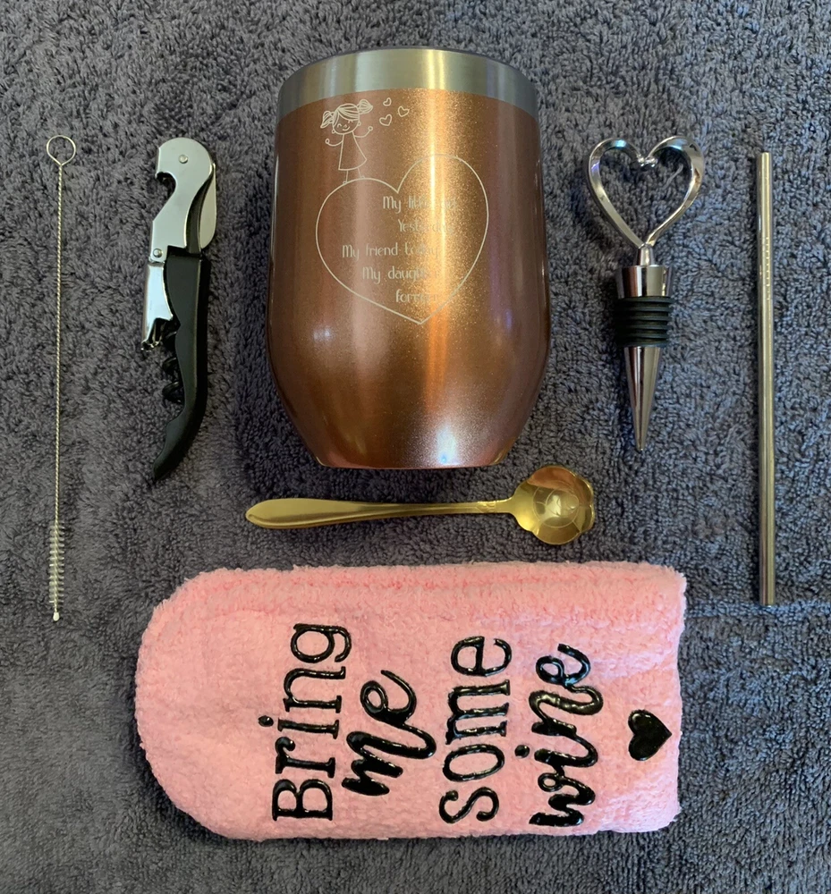 🎁WINE CUP GIFT SET: Gift box contains an insulated stainless steel tumbler with lid , straw, straw brush, bottle stopper, spoon, socks, wine knife and a greeting card. You can write your best wishes on it. This is definitely a gift box full of new ideas and feelings. Stainless Steel Tumbler " My little girl yesterday My friend today My daughter forever"