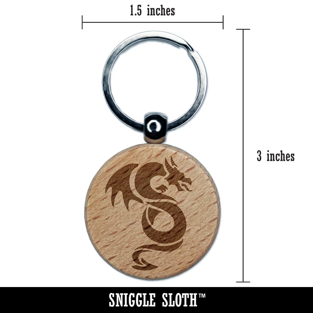 Winged Serpent Dragon Engraved Wood Round Keychain Tag Charm