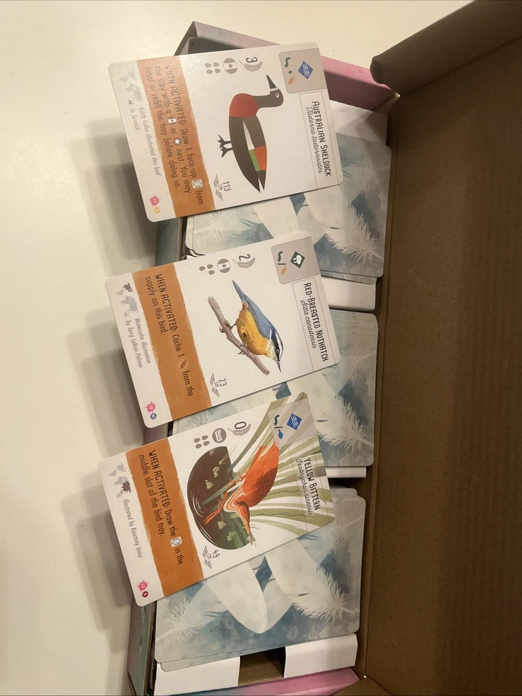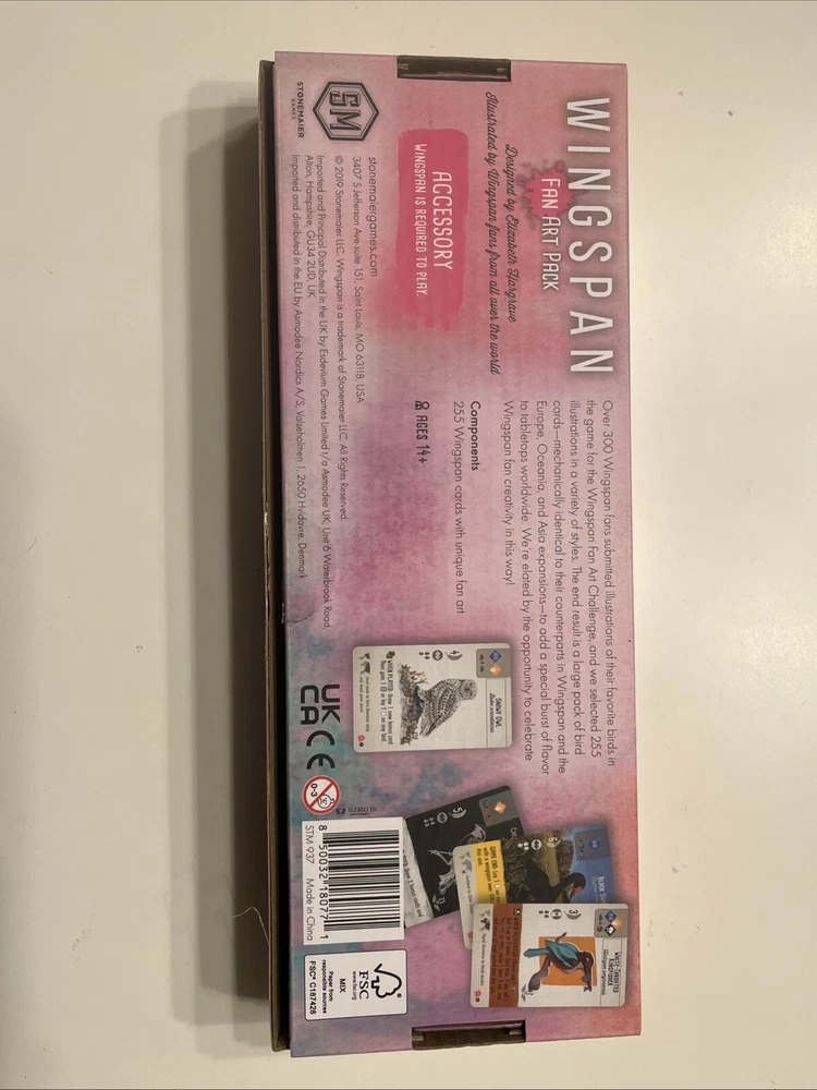 Expansion pack of fan art bird cards, functionally identical to original Wingspan cards but with new artwork! The box is open but the set is complete and all cards are in new condition. Features & Details BIRD COLLECTING: You are bird enthusiasts - researchers, bird watchers, ornithologists, and collectors - seeking to discover and attract a beautiful and diverse network of birds to your wildlife preserve. BEAUTIFUL SUBMITTED ARTWORK: This is a 255-card pack of bird cards with art made by Wingspan fans from around the world. Unique illustrations and creations out of watercolors, origami, digital art, crotchet, pastels, colored pencil, ahnd embroidery, acyrlic paint, and even a board game pieces collage! ADD, REPLACE, OR USE THESE ONLY: You can shuffle the cards into your standard Wingspan set, only select some cards to replace the cards you have, or play games only with these birds.