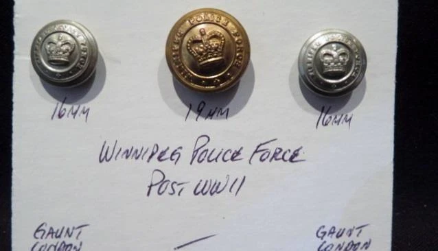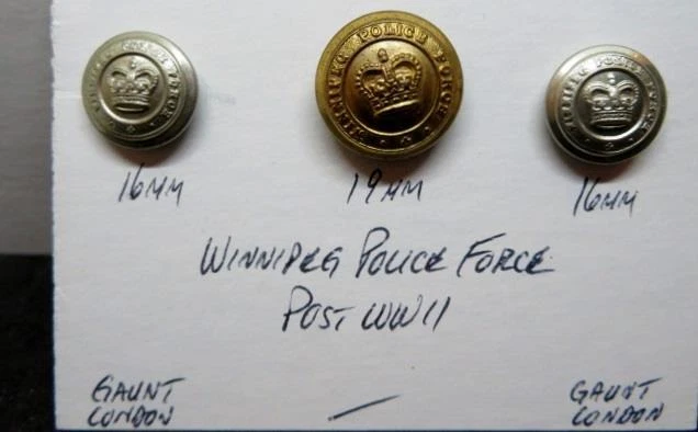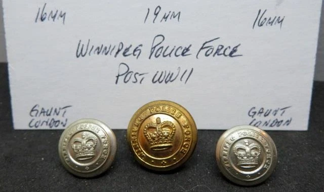 Please review all 10 photos & complete description before bidding Prices are in CAD.Tracking NOT included but available at the buyer's request & expense and recommended for our mutual peace of mind. If you don't see a shipping cost please confirm with us whether we can ship to you. Some buyers may be charged sales tax. Buyers outside Canada/US confirm shipping costs, we may be able to ship for less Includes a pair of 16mm silver-tone buttons with central Queen's Crown inscribed Winnipeg Police Force made by Gaunt London plus a 19mm brass button with central Queen's Crown and same inscription. No maker's name As always we offer our Military items with the greatest respect and gratitude for those who serve Winnipeg Police Force 3 Brass/Silvertone Post-WWII Uniform Buttons Queens Crown Winnipeg Police Force 3 Brass/Silvertone Post-WWII Uniform Buttons Queens Crown Click images to enlarge Description Includes a pair of 16mm silver-tone buttons with central Queen's Crown inscribed Winnipeg Police Force made by Gaunt London plus a 19mm brass button with central Queen's Crown and same inscription. No maker's name As always we offer our Military items with the greatest respect and gratitude for those who serve Please note: unless otherwise indicated the items we offer are vintage/pre-owned. We do our best to point out any condition issues in our photos and descriptions. Please carefully review both and contact us with any questions or concerns before you bid. Pre-owned/vintage items are not always in absolutely pristine, perfect condition. TERMS OF SALE We are always open to reasonable offers on our buy it now items. Please contact us before you bid if you have any questions. Once you have placed a bid, we consider any concerns to have been addressed. Payment is appreciated on receipt of your invoice - if you do not intend to submit payment at the time of purchase please contact us before you bid. Some buyers may be charged sales tax. Prices are in CAD RETURNS If your parcel appears to have been damaged in transit, please take photos prior to opening. If you wish to return your item you must contact us within 7 days of receiving it. Refunds are not issued until the returned item has been received and inspected by us. SHIPPING We ship by Canada Post calculated shipping with the purchaser paying the cost of shipping. If you are purchasing more than one item please don't pay for each item individually. Wait for an invoice, we combine shipping whenever possible. INTERNATIONAL BUYERS (OUTSIDE CANADA/US) PLEASE CONTACT US BEFORE BIDDING TO CONFIRM SHIPPING COST AS THE SHIPPING CALCULATOR ISN'T ALWAYS ACCURATE AND WE MAY BE ABLE TO SHIP TO YOU FOR LESS. Tracking is NOT included in the shipping cost but is available at the buyer's request and expense and strongly recommended for our mutual peace of mind. We do our best to ship within 3 postal business days of receiving payment. If you don't see a shipping cost please contact us before bidding to confirm whether we are able to ship to your location. Delivery date estimates are just that, factors beyond our control can cause parcels to arrive later than estimated FEEDBACK We have been serving the eBay community for over 20 years, and have worked very hard to maintain a high level of customer satisfaction. If for any reason you feel you cannot leave five star feedback, please contact us directly first. We appreciate your business and thank you for choosing our eBay store for your purchase. Images sell! Get Supersized Images & Free Image Hosting Create your brand with Auctiva's Customizable Templates. Attention Sellers - Get Templates Image Hosting, Scheduling at Auctiva.com. Track Page Views With Auctiva's Counter