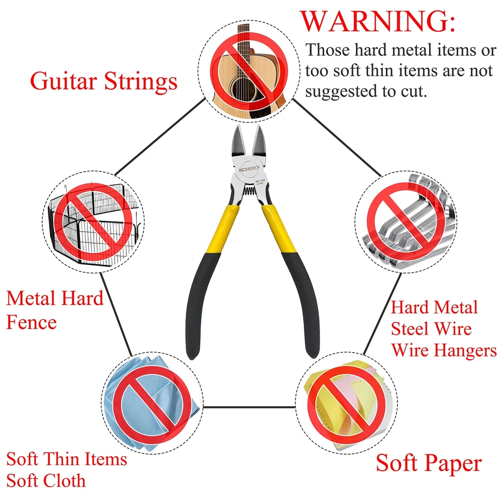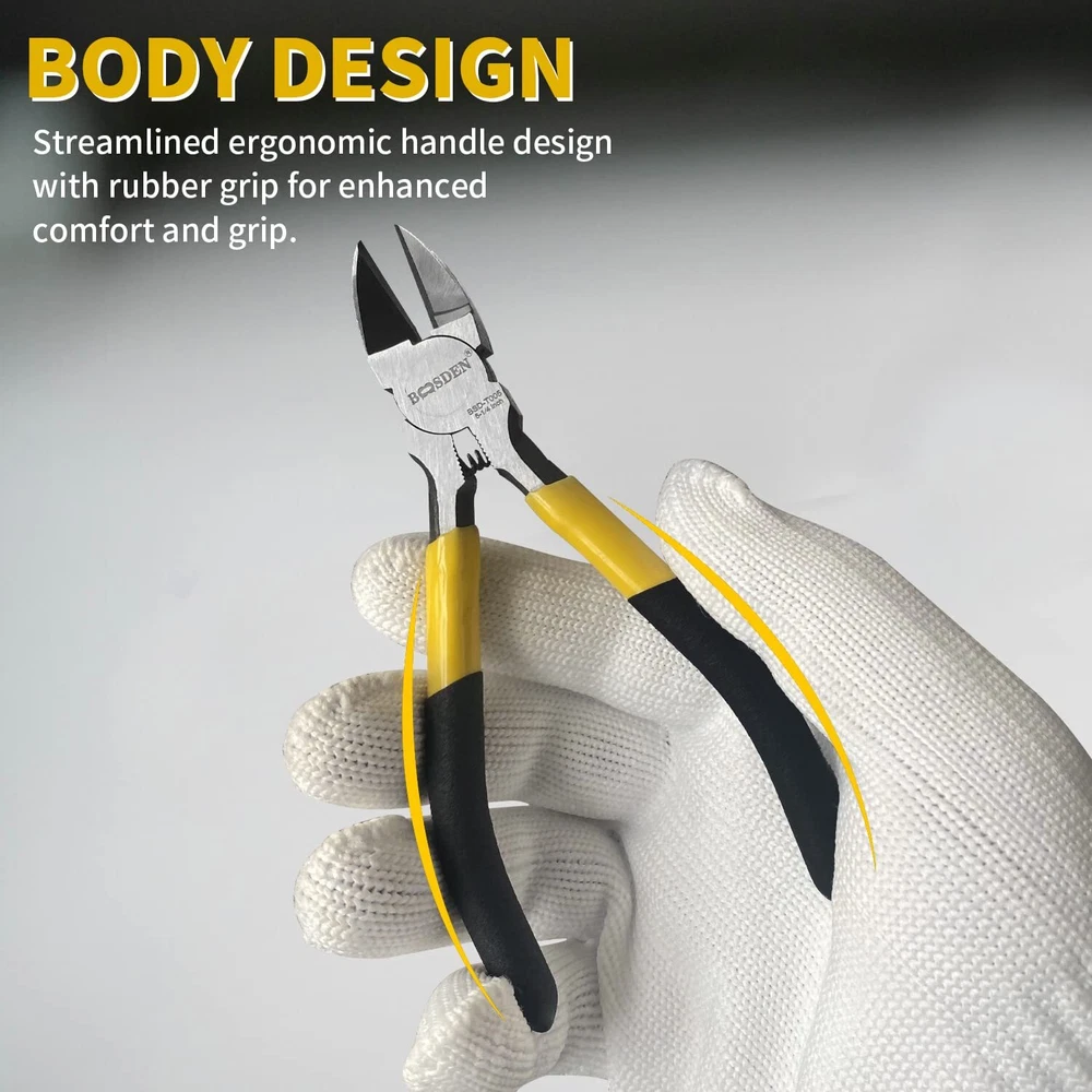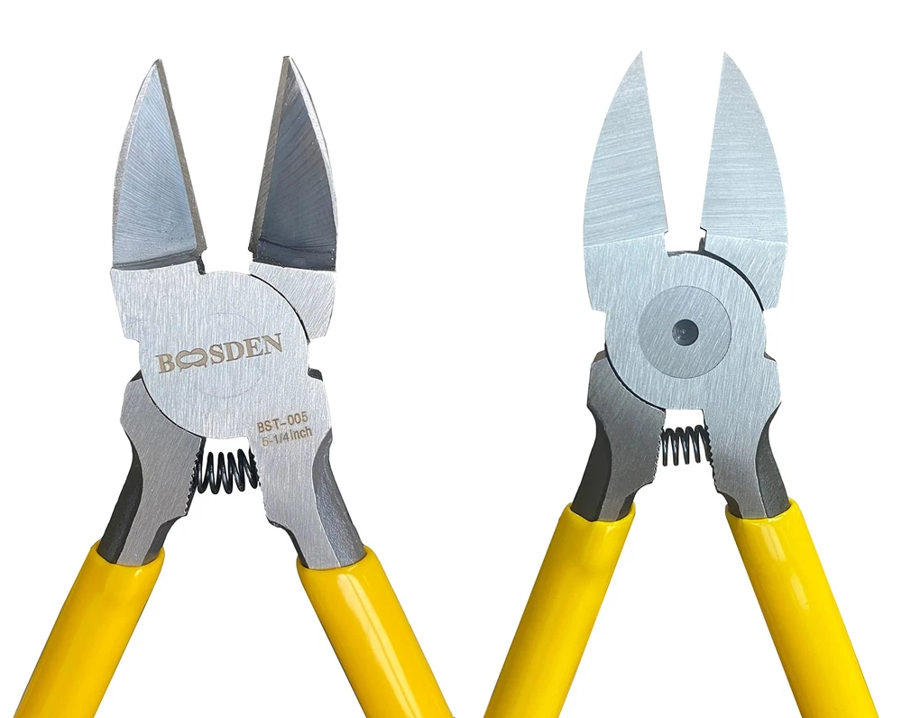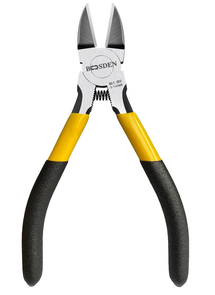 BOOSDEN 5-Inch Wire Cutters – Ultra Sharp Diagonal Cutting Pliers for Jewelry Making, Crafting, and Electronics Experience precision and durability with the BOOSDEN 5-inch Wire Cutters – designed to meet the needs of professionals and hobbyists alike. These ultra-sharp diagonal cutters offer superior performance for a variety of applications, from jewelry making to crafting and electronics. Key Features: Premium Construction: Crafted from Chrome Vanadium Steel , these wire cutters are engineered for long-lasting sharpness and durability. The blades are high-frequency hardened , ensuring clean and precise cuts every time. Ergonomic and Comfortable Design: Featuring a non-slip rubber handle based on an ergonomic design, these cutters provide a comfortable and secure grip , reducing hand strain during extended use. The spring-loaded mechanism ensures effortless operation, allowing the tool to bounce back automatically, minimizing fatigue. Versatile Cutting Power: These diagonal wire cutters can effortlessly cut through soft copper wire , plastic wire , aluminum wire , small cables , and other soft materials up to 14 AWG in thickness. Perfect for jewelry making , electronics , crafting , flower arrangement , and miniature bonsai pruning . Wide Range of Applications: Ideal for professionals and hobbyists alike, these wire cutters are perfect for tasks such as edge banding , soft alloy wire cutting , and general wire snipping . Their compact size makes them easy to maneuver, even in tight spaces. Important Reminder: These wire cutters are non-insulated . For safety, please ensure that power is disconnected before use, especially when working with wires that may be electrically live. Not suitable for cutting steel wire or other hard metal materials.