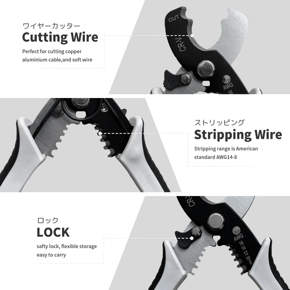 【Material 】Cable cutters are manufactured from 65# manganese steel with precision dual ground cutting blades. 【2-in-1 hand tool】Wire cutters,multi-function wire strippers and stripper 2-in-1 electrician's tool that saves money,spring loaded refined craftsmanship handles can ensure pressure lasting balance, not easy to deform 【Feature】Wire cutters heavy duty,wire strippers has safty lock, flexible storage, easy to carry. 【Comfortable Plastic Handle】Cable cutter pliers,heavy duty cable cutters have smart plastic handles comfortable for hand when cutting cable and slip resistance for slicing cable sheath 【Application】Cable cutting pliers are perfect for stripping and cutting copper and aluminium cable,but it is a non-insulating product, please cut off the power before use Product Description Easy to Use BOOSDEN 8 inch Cable Cutters Wire cutters, multi-function wire strippers and stripper 2-in-1 electrician's tool that saves money, spring loaded refined craftsmanship handles can ensure pressure lasting balance, not easy to deform. The video showcases the product in use. The video guides you through product setup. The video compares multiple products. The video shows the product being unpacked. 1 Cutting Cooper Wire 2 Cutting Soft Wire 3 Cutting Electrical Wire 4 Stripping wires 5 Cutting Wire