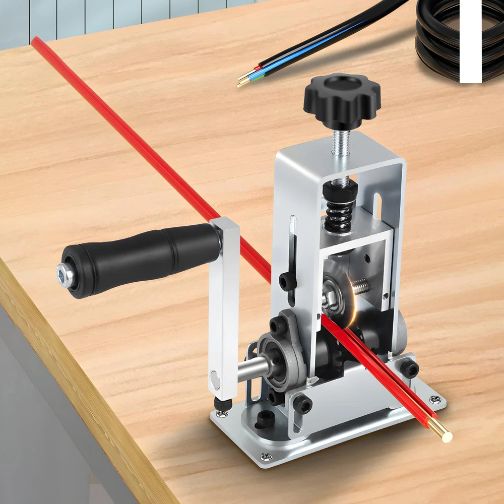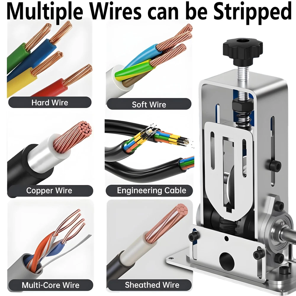 Precision Craftsmanship: Our Wire Stripper Machine is meticulously crafted from reinforced aluminum, while the blades are made of durable alloy steel, ensuring long-lasting wear resistance. Versatile Operation: This wire stripping tool can be operated manually with the ergonomic handle or connected to a power drill for faster and more effortless wire stripping, greatly improving efficiency Adjustable Wire Stripping Range: With a customizable entry panel height, our machine can easily strip cables ranging from 0.04inch to 1inch in diameter, making it suitable for a wide range of wire sizes Multi-Purpose Capability: Whether you are dealing with scrap wires, single-core cables, household wires, or industrial cables, this wire peeling machine is designed to efficiently strip and retrieve the wire cores Wide Application: Ideal for use at home, as well as in recycling centers and factories, our Wire Stripper Machine is a versatile tool that ensures precision and efficiency in wire-stripping tasks