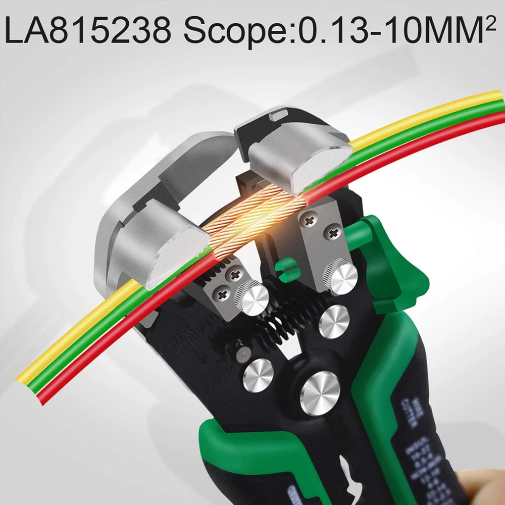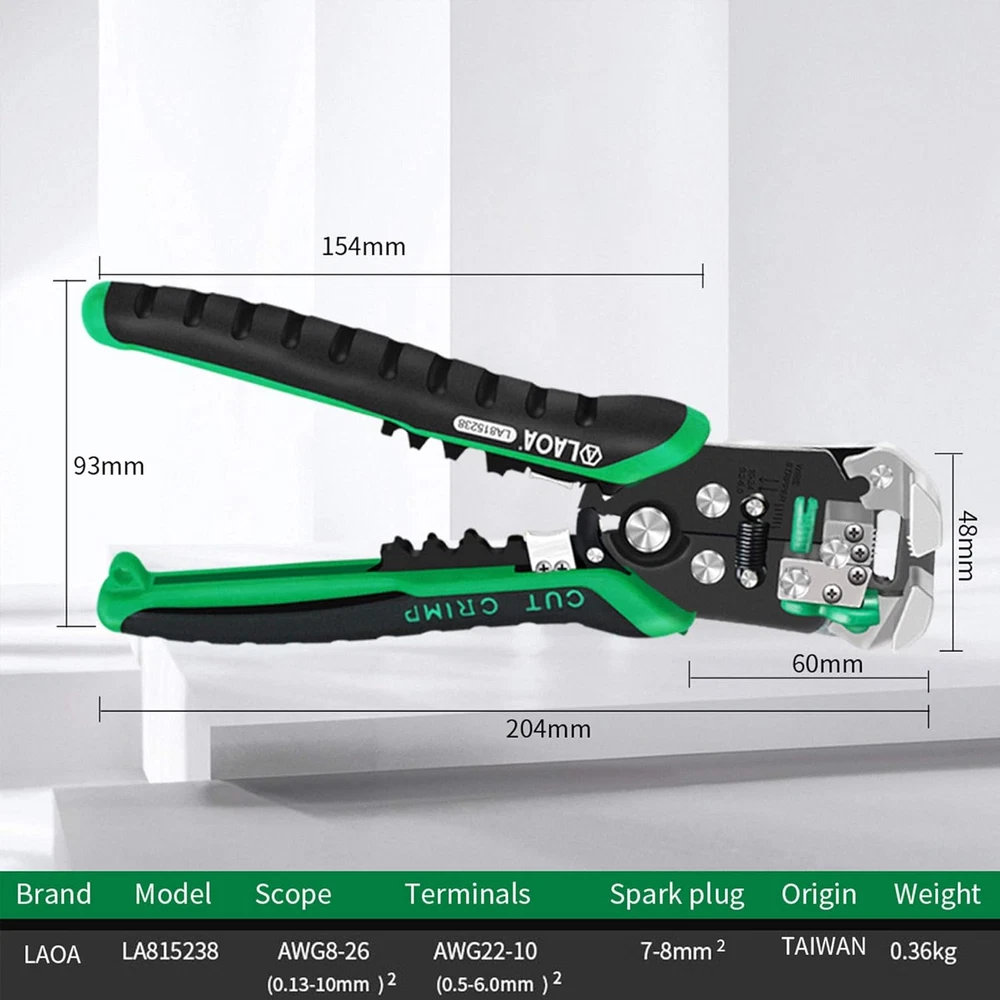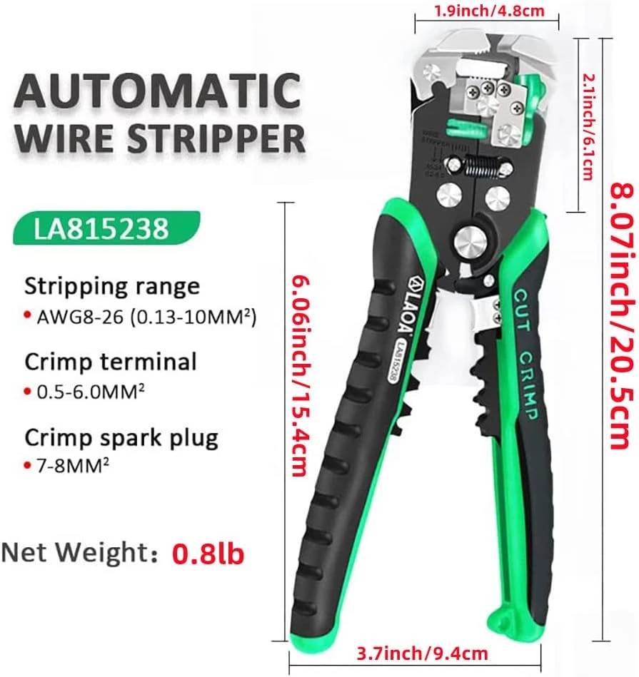 💓STRIPPING WIRE: Strip wire from 8 to 26 AWG (0.13-10.0mm²) with our self-adjusting mechanism. 💓CRIMPING: Crimp AWG 10-22 (0.5-6.0mm²) terminals, and 7-8mm ignition terminals(spark plug). 💓Strong steel spring. Steel spring with strong toughness, large tension and stripping powerful. 💓Chrome vanadium alloy steel jaw. With good hardness, strong toughness and large tension,suitable for AWG 8-26 wire. 💓Mainly apply to strip sheath wire, core wire and multiple strand sheath line. Also wire cutting, bare terminal and insulation terminal crimping. Product Description 3 in 1 Automatic Wire stripper Self-adjusting wire stripper Why you choose LAOA Wire Stripper ? Multi-functional Design(3 in 1 functions:Stripping, Cutting, Crimp terminal),meet your daily demands. Made in Taiwan.Carbon steel body with Cr-V blade and stainless cutting blade.Sturdy and durable. Stripping force knob and stripping length control knob can strip Multiple wires fastly and easily. Most daily wires can be stripped,with widely applications. Heavy duty made,to ensure high quality and long using life. Stripping adjusting knobs Stripping force adjusting Stripping strength adjusting knob can Increase and decrease stripping power to stripping different diameters wires Cr-V material stripping jaw,durable and sturdy. By adjusting stripping power,the stripper can strip most daily wires include round wire,flat wire and stranded wire. By adjusting stripping wire length,you can strip the length you want. Cr-V Stripping Jaw Stripping lenghth adjusting Strong spring Stripping length adjusting Set the stripping length you want Strong replaceable spring prlongs stripping plier using life Instructions Multi-functional
