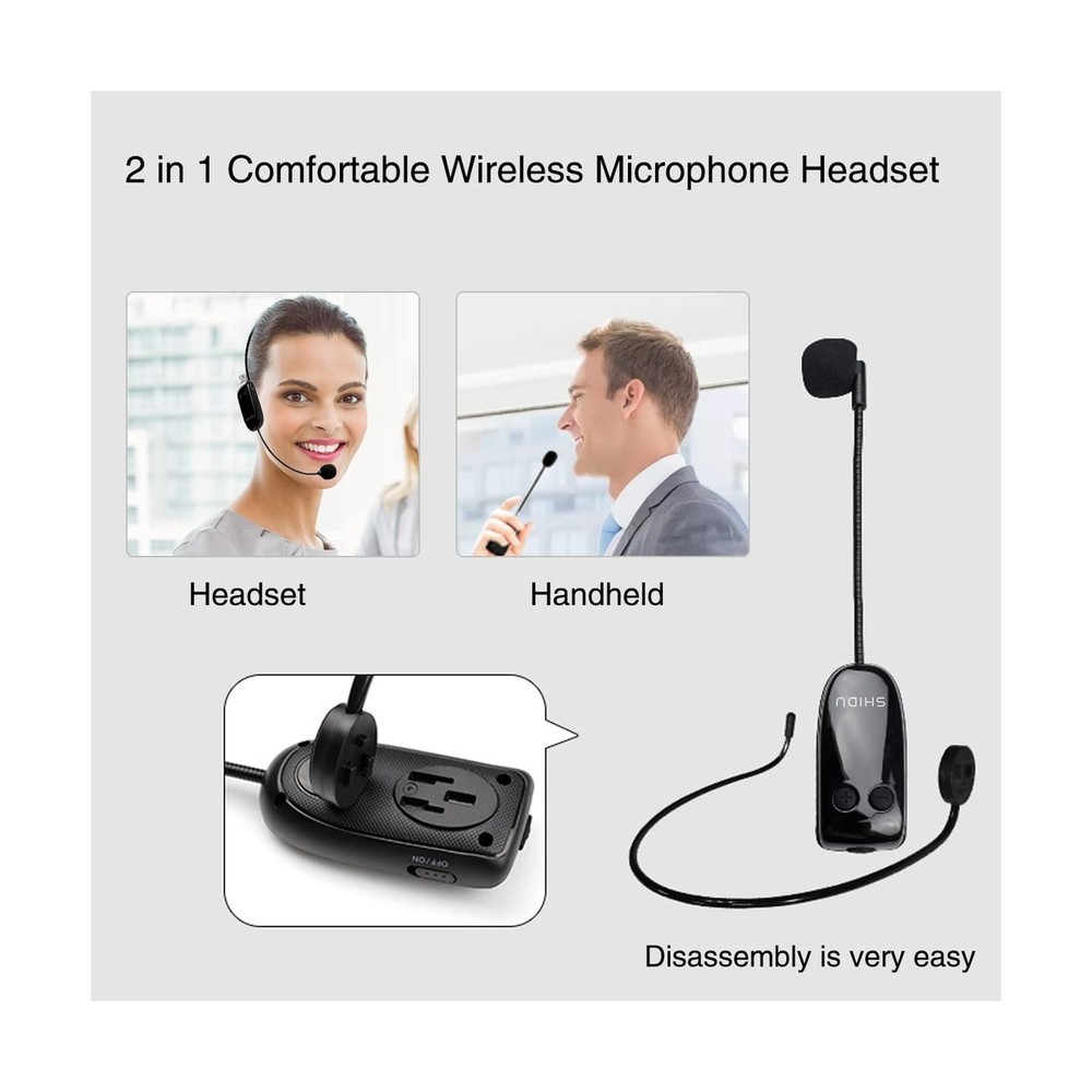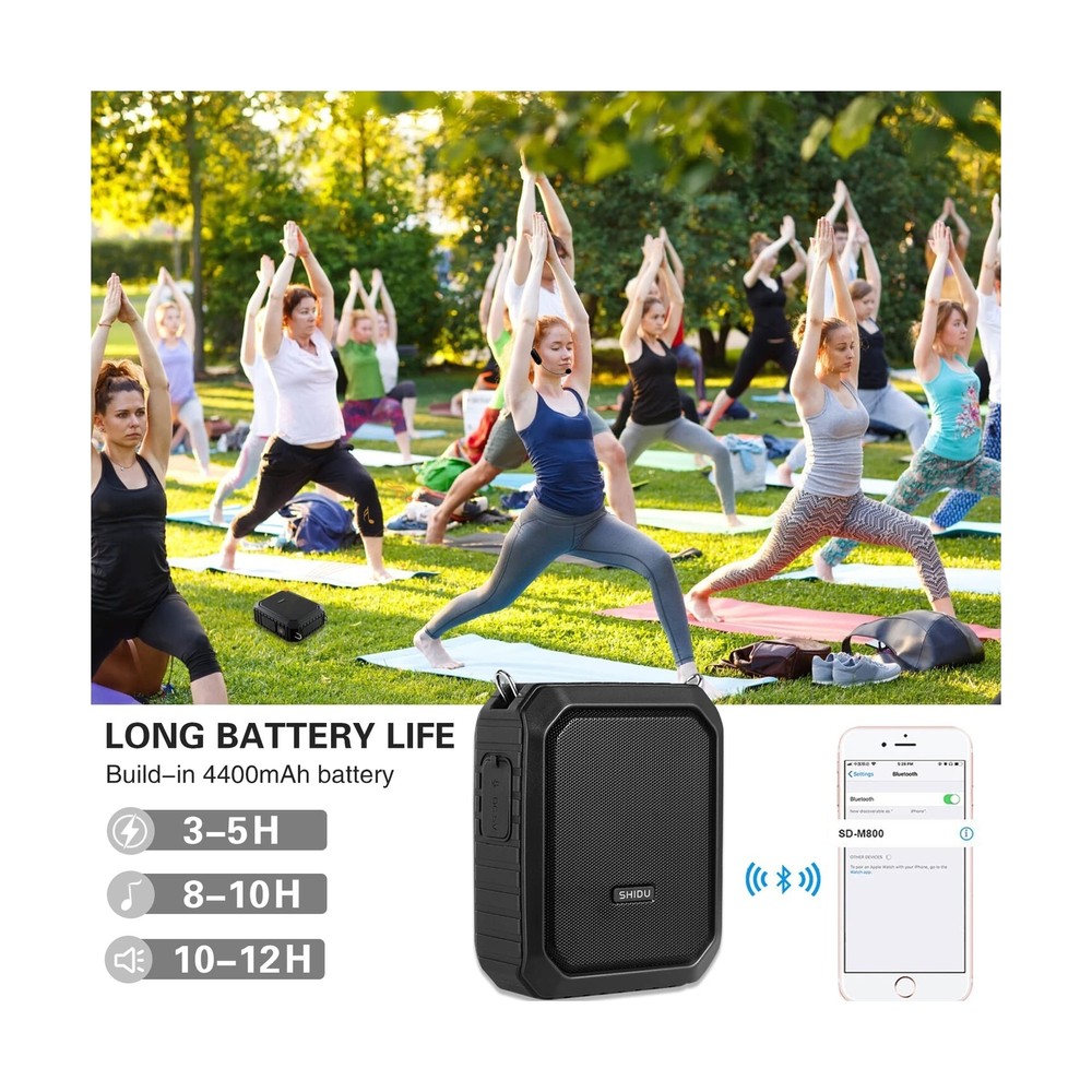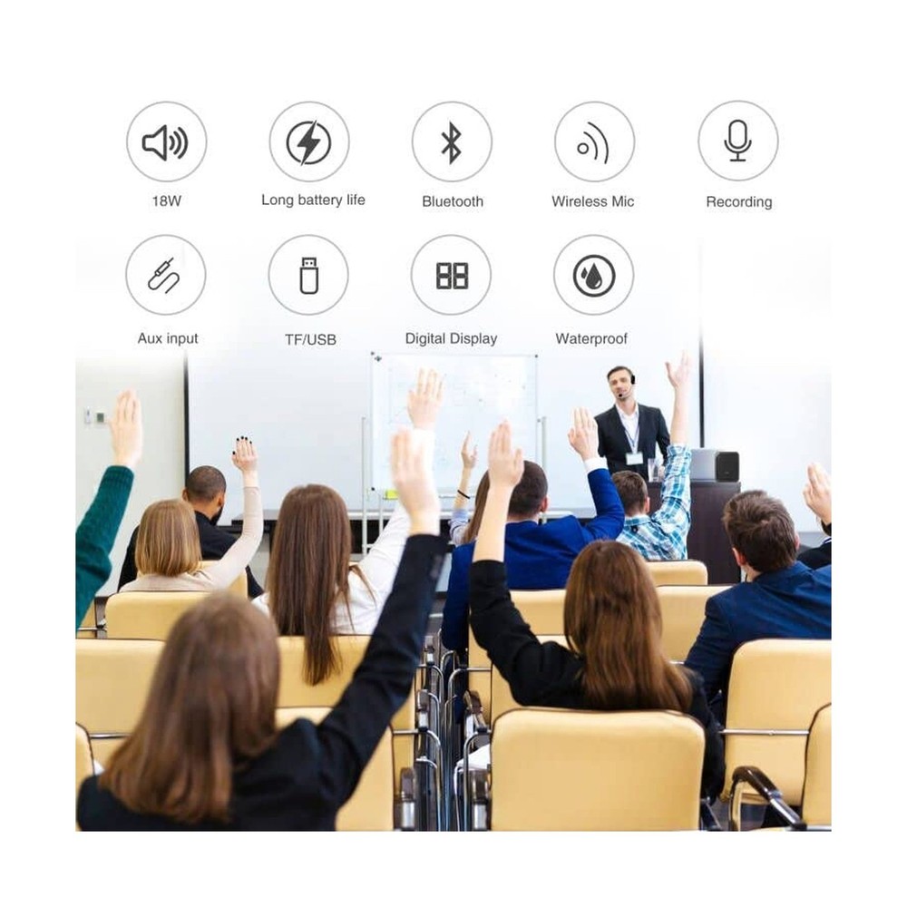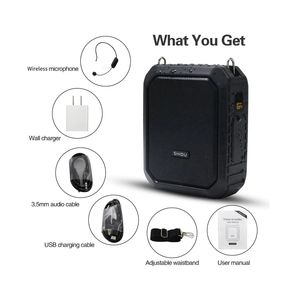 Voice Amplifier Wireless for Teachers, 18W Personal PA System Ultra-Portable Megaphone with Wireless Microphone Headset, IPX5 Waterproof 5.0 Bluetooth Voice Amplifier Speaker - Indoor & Outdoor Product Details Brand: ResponseBridge Connectivity Technology: Bluetooth Color: Black Compatible Devices: Amplifier, Headphone, Smartphone, Speaker Mounting Type: Tabletop Recommended Uses For Product: Singing Manufacturer: ResponseBridge Brand Name: ResponseBridge Model Number: 800UHF Material Type: Acrylonitrile Butadiene Styrene (ABS) Color: Black Number of Channels: 1 Audio Input: 3.5mm audio input Output Wattage: 18 Watts Mounting Type: Tabletop Power Source: Battery Powered Connector Type: Aux, USB Connectivity Technology: Bluetooth Compatible Devices: Amplifier, Headphone, Smartphone, Speaker Voice Amplifier with Wireless Microphone Headset: You can place your megaphone up to 30-35m away connect wireless microphone or other bluetooth device, and you can play music and use wireless microphone at the same time. This is powerful microphone wireless with speaker. Multifunction Personal Amplifier:Voice amplifier support 3.5mm audio input, just plug the USB cable into your device or plug the 3.5mm jack into your audio device and not need drives. It Compatible with PC, laptops,desktop and more devices.And Support one key to record. Waterproof Wireless Amplifier: Waterproof can resist gentle water spray and splash but cann't be partially or fully submerged.Featuring a smooth Anti-fingerprint fabric design rubber exterior that protects the pa speaker system from scratches and impact, Ultra-portable voice amplifer Loudspeaker for Teachers,Training, Coaches, Tour Guide, Yoga Fitness and all outdoor/indoor activities. Portable Microphone and Speaker: 18W handsfree microphone headset with speaker built in 4400mAh rechargeable battery can play up to 13 hours at 50% volume; LED digital display power technology can display the remaining power of the speaker. Recharge in just 3-5 hours with included charger. Handfree wireless microphone Speaker: Using advanced wireless transmission technology, the connection is more stable and fast. The microphone and speaker can amplify the sound through a wireless connection, cordless design means you can move freely and there is no cable. Package includes:Voice amplifer*1, Wireless mic*1, Charger*1, User Manual*1, 3.5mm audio cable*1, Adjustable waistband*1, Charging Cable*1 Helpful Tips:1)For the best audio pickup, position the microphone about 3-5cm (1.2-2 inches) away from your mouth. 2)To prevent feedback, it's advisable not to place the microphone directly in front of the voice amplifier. 3)Adjust the volume to your preference using the convenient controls on both the microphone and amplifier. 4)If you encounter any connection issues, re-pairing the devices often resolves the problem in the majority of cases. Payment Back to Top We accept Paypal and All Major Credit Cards. Shipping & Handling Back to Top Item will be shipped FREE standard shipping in 1 business day after payment is received. Express Shipping services are available. Tracking number will be provided. Return Policy Back to Top Items can be returned for exchange or full refund within 30 days from the date you receive your merchandise. Please contact us before starting a return request, so we can resolve any issues and provide free returns if needed. Return shipping is the responsibility of buyer unless the return is a result of our mistake (i.e., your receive the wrong item). Contact Us Back to Top If you have any questions please contact us. We will respond within 1 business day or less.