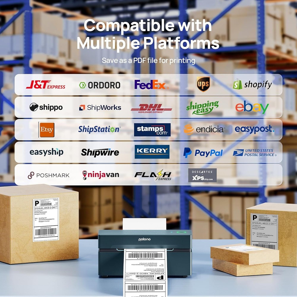 About this item 2025 New Version: This Bluetooth thermal printer offers faster and clearer printing. It is a high-speed shipping label printer, printing up to 72 labels/min for 4x6-inch labels. This thermal printer works with fanfold and roll labels (0.97"-4.25" width) and delivers 203 dpi high-resolution prints. An ideal choice for shipping and logistics, this shipping label printer ensures efficient, clear results. Note: Monochrome printing only. Printing via Bluetooth: The thermal printer supports Bluetooth printing via the "Labelnize" app. Download the app from Google Play or Apple App Store for Android and iOS 13 or above. For Windows 7+, connect the shipping label printer via Bluetooth. Always connect the thermal printer through the app; do not connect the shipping label printer directly via Bluetooth. Note: MAC OS does not support Bluetooth connection for the thermal printer. Printing via USB: For both Windows and Mac, you can connect the shipping label printer using a USB cable. This thermal printer is easy to set up and use, ideal for small businesses. Wide Compatibility 4x6 inch Thermal Printer for Shipping Packages. You can refer to the operation video and manual to set it up. Note: The shipping label printer doesn't support Chrome OS. Wide Usage: The thermal printer is widely used for printing labels from various marketplaces and shipping platforms, such as Amazon, eBay, ShipStation, ShippingEasy, Shopify, UPS, FedEx, USPS, Shippo, etc. (Note: Please remember to download the 4×6 inch label to be printed on the corresponding platform before printing, then upload it to the editor app "Labelnize" for printing). Use this Bluetooth shipping label printer to print shipping labels, warehouse labels, helping you increase productivity. Product Dimensions: 7.91 x 3.27 x 3.66 inches