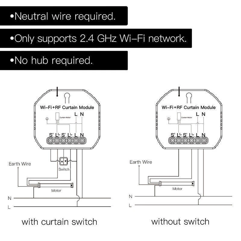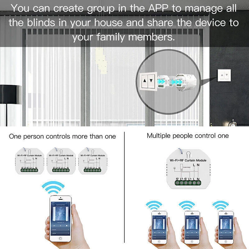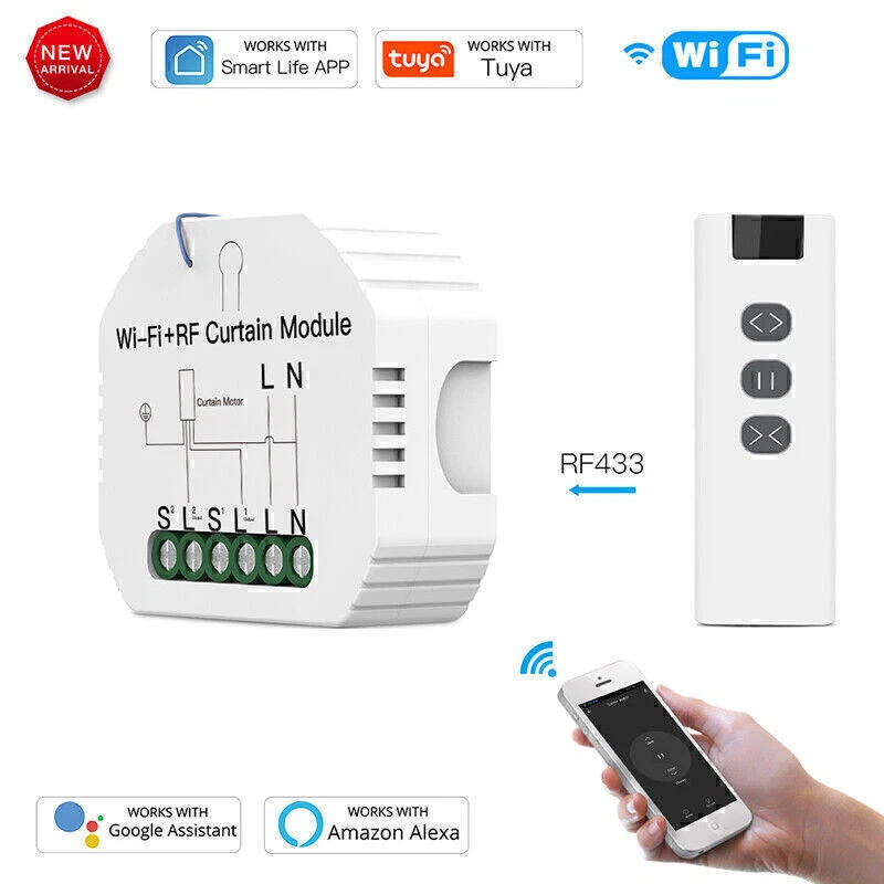 Features: 1. Use with Much More Convenience: A really good substitution for one more new smart roller blinds switch to work with your traditional curtain switch to realize intelligence. Also, it can be connected with your roller blinds shutter motor to smartly control your curtains. 2. RF and Wireless Remote Control: Enable to remotely control your connected appliances on your smart phone wherever you are. 2.4 b/g/n Networks provides the needed connection to the DIY Switch Module without the need of a separate HUB. (Compatible with for Android & iOS.) More importantly, this curtain switch module features built-in RF433 frequency, so it can be controlled with remote control switch with encoding 1527. 3. Hands-free Voice Control: Compatible with for Amazon Alexa and Google Home for easy voice control, providing your smart life for controlling roller blinds with much more convenience. 4. Timer Setting: Take full control of your roller blinds intelligently with the timer feature on your APP, which enables to open / close them at a specific time automatically. Automate your home roller blinds via 3 timing types: schedule timing, countdown timing and loop timing. 5. Family Sharing: One device can be shared to different family members that means one ID is able to control multiple curtains, or multiple users can control one curtain. Control your smart home with your family members or friends together. Note before order: 1. Please check your motor is with 4 wires before make your order. (Note: Motor is not included.) 2. This roller blinds shutter switch module can not work with DC motor. 3. Please use this module with RF433 remote control switch(only encoding 1527 required.) Specifications: Product type: WiFi Curtain Module Voltage: 90-250V AC 50/60Hz Current: 2A Power Load: 500W(Max.) WiFi frequency: 2.4GHz-2.4835GHz WiFi RF frequency:433MHz,encoding 1527 Operation temp: -10℃-+40℃ Case temp: Tc +80℃(Max.) Operation range:≤200m Dims(W*D*H): about 58*49*29mm IP rating: IP20 Warranty: 1 year Package List: 1* WiFi Curtain Module (with mounting clip) 1* Instruction Manual 1* Remote Control Switch Batteries are not included in the package,you need to buy them by yourself Q&A: 1.Q:Does this work with Google Home? A:Yes,it does.And it's also compatible with Alexa. 2.Q:Do I need to buy a hub to work with the curtain module. A:No,there is no need for you to buy a hub and no hub required for the module. 3.Q:Can I control the module with my own remote control switch? A:This curtain switch module is RF433 built in and it can only work with RF433 remote control switch with encoding 1527. 4.Q:Shall I buy a smart curtain switch to work with this module? A:No,you can just connect the module to your traditional curtain switch to realize intelligence. 5.Q:What should I do if I can't configure the curtain module? A:a:Please check whether device is powered on. b:Make sure your mobile and curtain module are under the same 2.4GHz wifi network. c:Whether it's in good internet conditions. d:Make sure the password entered in App is correct. e:Make sure the wiring is correct. 6.Q:Which products can I control with the device? A: Curtains,shutter,blind... 7.Q:What happens if the wifi goes off? A:You can still control the device connected to the curtain module with your traditional curtain switch and once wifi is active again the device connected to the curtain module will connect automatically to your wifi network. 8.Q:What should I do if I change the wifi network or change the password? A:You can connect the module to the wifi network according to the App User Manual.