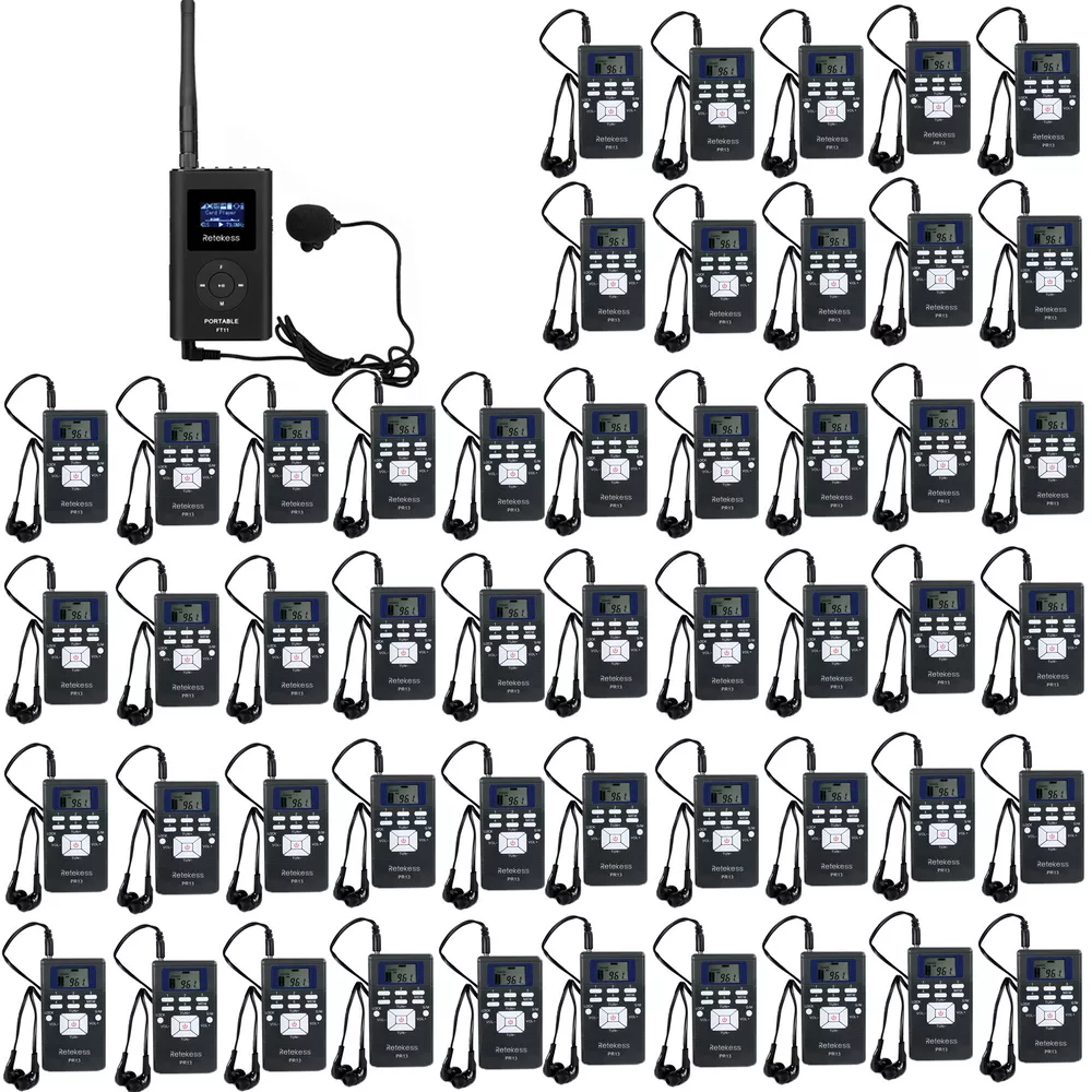 Shipping Service:Priority DHL Express Service when items ship from China.(2-7 business days) Solution Introduction: This simultaneous interpretation solution is achieved as follow: the voices are transmitted via transmitter's(FT11) microphone to interpreters and corresponding listeners equipped with receiver( PR13). Then they are interpreted into different languages and transferred to receiving apparatus(PR13) by means of transmitter's microphones outfitted for relative audience's listening. Application Scene: This simultaneous interpretation solution caters for following event: forum speech, academic exchange, product launch, business celebration and so on, depending on product specifications and features. Solution Features : To recommend utilization on a small meeting Operating range: max. 100 m (indoor) Portable apparatus, making it convenient to carry and conserve very easy to set and operate Slim, making it comfortable to wear Composition of simultaneous interpretation solution: transmitter + receiver Note: If this solution cannot meet your demand, please contact our Customer Care Center and we will customize your product according to your requirements. Reminder: Please inform us of your application scene, environment, product quantity and other relative information in order to provide better service for you. Main Product Specifications : Transmitter Channel Number 5 CH Frequency increase 0.1MHz Pre-emphasis 50us/75us Output impedance 50 ohm SNR >=70dB Frequency response 30Hz~15000Hz Support mp3 format FLAC, WAV, WMA, MP3 Support memory card Max 32GB Power Built-in 2000mAh polymer lithium battery Working hours 6-8 hours Charge DC 5V 1A, Micro USB jack Size 99 x 58 x 15mm / 3.9 x 2.2 x 0.6 in Weight 80g / 0.17lb Radio Sensitivity <3.5uV Signal to noise ratio 45db Stereo separation 32dB Power supply 2 x AAA batteries (not included) Earphone jack 3.5mm Tuning increase 0.1MHz Built-in speaker No Dimension 92 x 54 x 15mm / 3.6 x 2.1x 0.6in Weight 40g / 0.09lb Package Include: 1X Transmitter 50X Receiver 50X In-ear earphone 51X Lanyard 1X USB charging cable 1X Wired microphone Hand strip English manual Adjustable FM Frequency Range The frequency range of the transmitter is 76~108MHz. The frequency range of the receiver is 60~108MHz. You can adjust it according to your need when you listen to music or talk show. 5 Preset Stations With 5 stations preset, you can save stations that you like. You can easily use the TUN button to manually or automatically search stations. It is convenient to immediately reach and listen to the preset station you like with the number key. Adjustable Volume(PR13) The volume is adjustable. In a worship or a conference, you can adjust the proper volume with button to ensure you can clearly hear the sound. AUX & TF Card(FT11) You can save some anecdotes of tourist attractions on your phone or TF card in advance. When travelling, you can share them with tourists through the AUX cable and TF card. (Note: The AUX cable and TF card are not included). 50/80m Transmission Distance(FT11) The transmission distance of the transmitter is 50-80m. You can clearly hear the introduction of the tour guide, even you fall behind the team. (Note: The actual transmission distance is affected by the environment and the battery status). Two Microphone Input Modes(FT11) With built-in microphone, the pastor can walk freely in the church when speaking. The external microphone can be clipped to the collar to free your hands. (Note: The wired microphone is included). Long Working Time(FT11) With built-in 1500mAh battery, the transmitter can continually work for 6-8 hours. No frequent charging matter, it is efficient to support a long-time conference. Battery Powered (PR13) The battery powered receiver is convenient to use and can be easily taken with you anywhere. (Note: 2×AAA battery is not included). Mono & Stereo Sound(PR13) The receiver supports mono sound and stereo sound. Mono sound offers you a louder sound. Stereo sound brings you an immersive listening experience. You can select as needed. Excellent Reception (PR13) The earphones are used as the antenna. Adopting DSP technology, the receiver is efficient to reduce noise and transmit clear audios, offering an enjoyable listening experience. Lock Switch It is efficient to prevent the receiver from changing current frequency and volume with the lock switch. You don’t need to worry about affecting worship or meetings. Compact and Portable The transmitter and the receiver are compact and lightweight. You can easily hang the transmitter on your wrist and the receiver on your neck, and don’t suffer pain even for a long-time wearing. Adopting DSP technology, visitors can hear the clear sound transmission when machine are working. Prayers can easily finish a-long-time worship and don ’ t feel tired with lightweight and portable radio. Falling behind the team, tourists can clearly hear the sound. Wherever attenders sit, they can clearly hear the meeting contents through their earphones About Us