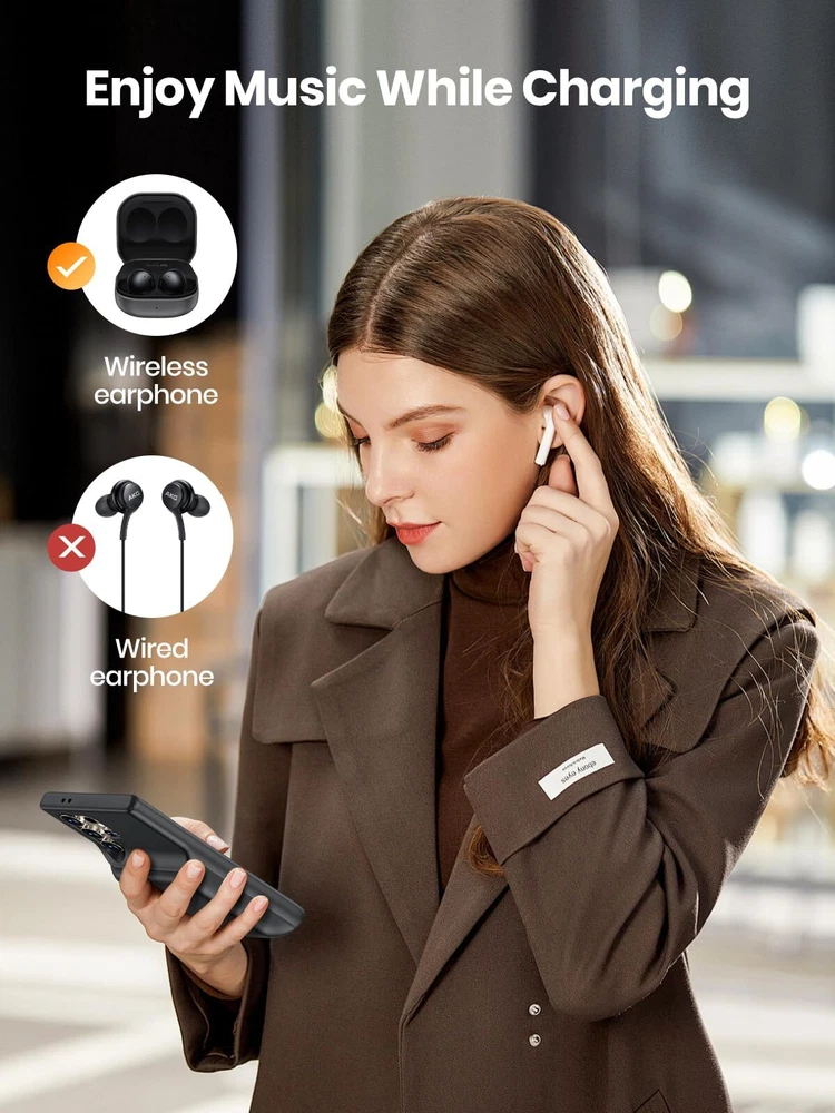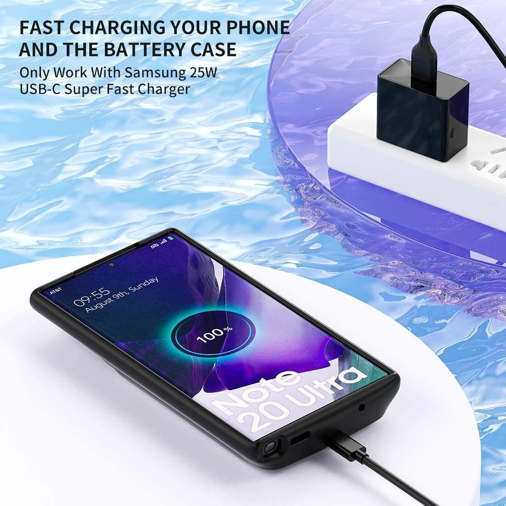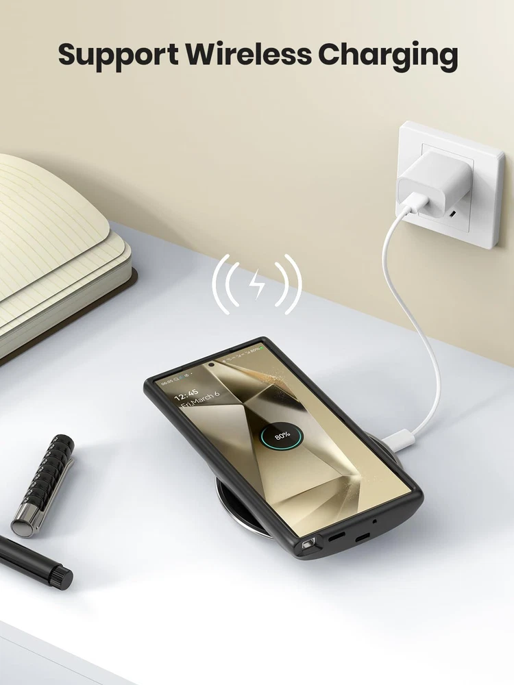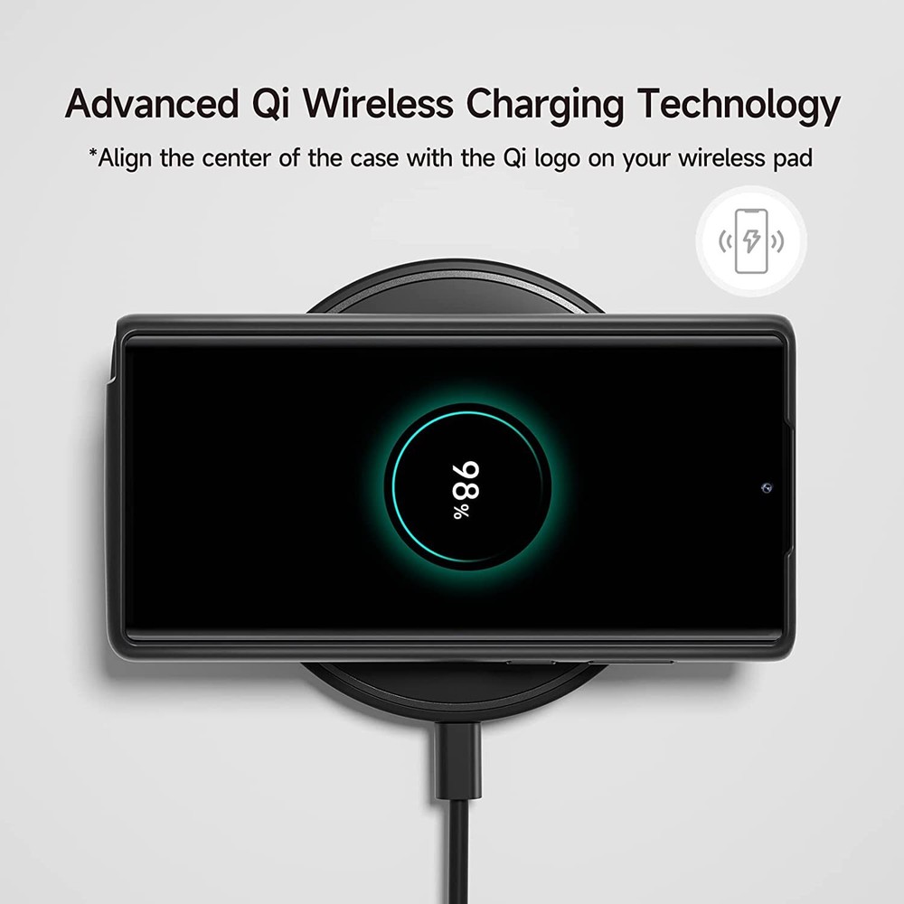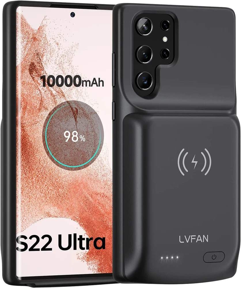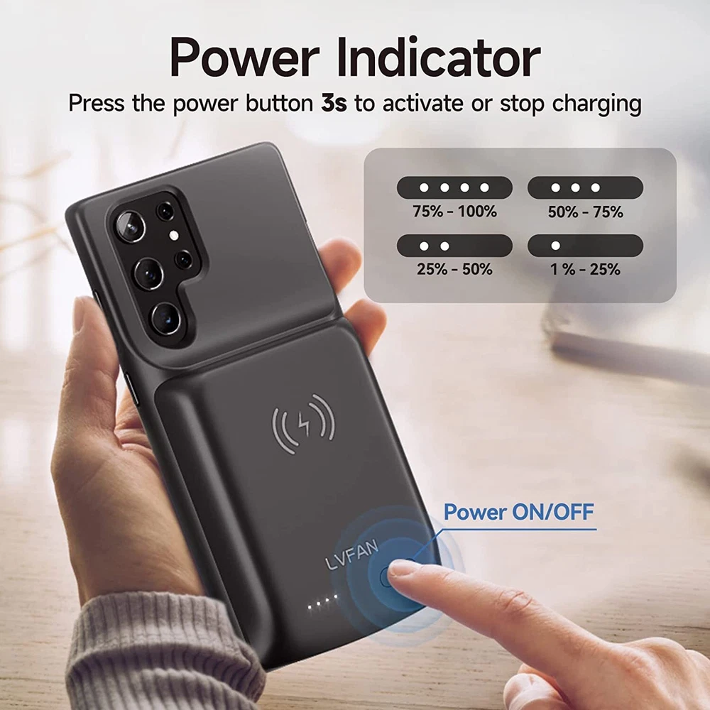 Easy to Use Slide your phone in slowly, make sure the connector of the S22 Ultra S23 Ultra S24 Ultra charger case with phone properly. Press the button for 3s to begin/stop charging your phone If you need to take it off, bend the top soft rubber of the case, then push your phone up slowly. NEWDERY Powerful 10000mAh Qi Wireless Battery Charging Case For Samsung Galaxy S22 Ultra 5G 6.8” (2022 Release) 1. Capacity: 10000mAh 2. Input: DC5V/2A(MAX); Output: DC 5V/3A (MAX); Wireless Input/Output: 5W (MAX) 3. Compatibility: Only fit for Galaxy S22 Ultra/S23 Ultra/S24 Ultra 4. NOTE: Don't use any E-marker cables and the cable coming with Samsung 45W PPS charger to charge the battery case. It will cause no charge or slow charge. 5. Battery case support Qi Wireless Charging & Sync-data & Android Auto & Samsung Pay. And the case is compatible with the Samsung Dex function. 6. Doesn’t support any Wired Headphone. 7. Note: The galaxy ultra battery case can't support data-sync and android auto when connect with a Hub. 8. Don't use any E-marker cables and the cable coming with Samsung 45W PPS charger to charge the battery case. It will cause no charge or slow charge. 9. Please use the USB-A To USB-C cable when you transfer data via the case. 10. The charger case can be charged via the 18W fast charger(Max). And please remove the phone and use the USB A to USB C cable. 11 . The battery case DOES NOT fast charge the phone, and the fast charger can't fast charging your phone if the phone in the case. Important Note 1. Compatibility: Only fit for Galaxy S22 Ultra S23 Ultra S24 Ultra 5G 6.8 inches. 2. Support Qi wireless charging. 2. Support Bluetooth earphones. Doesn't support wired headphone! 3. The s24 ultra charger case support 18W QC 3.0 adapter. the battery case alone can be fast charged via USB-A To USB-C cable. 4. NOTE: The battery case CAN NOT fast charge Galaxy S24 Ultra, and your phone can't be fast charged by the fast charger when the phone is in the case. 5. Don't use any E-marker cables and the cable coming with Samsung 45W PPS charger to charge the battery case. It will cause no charge or slow charge. 6. The case is NOT waterproof. 8. The led will flash when charging the galaxy 22 23 24 ultra battery case via the cable, When the charging case is fully charged, the four led indicators will be on. 9. The led flash will flash when the charger case charges your phone. 10. Please press the button for 3s to start or stop charging your phone.