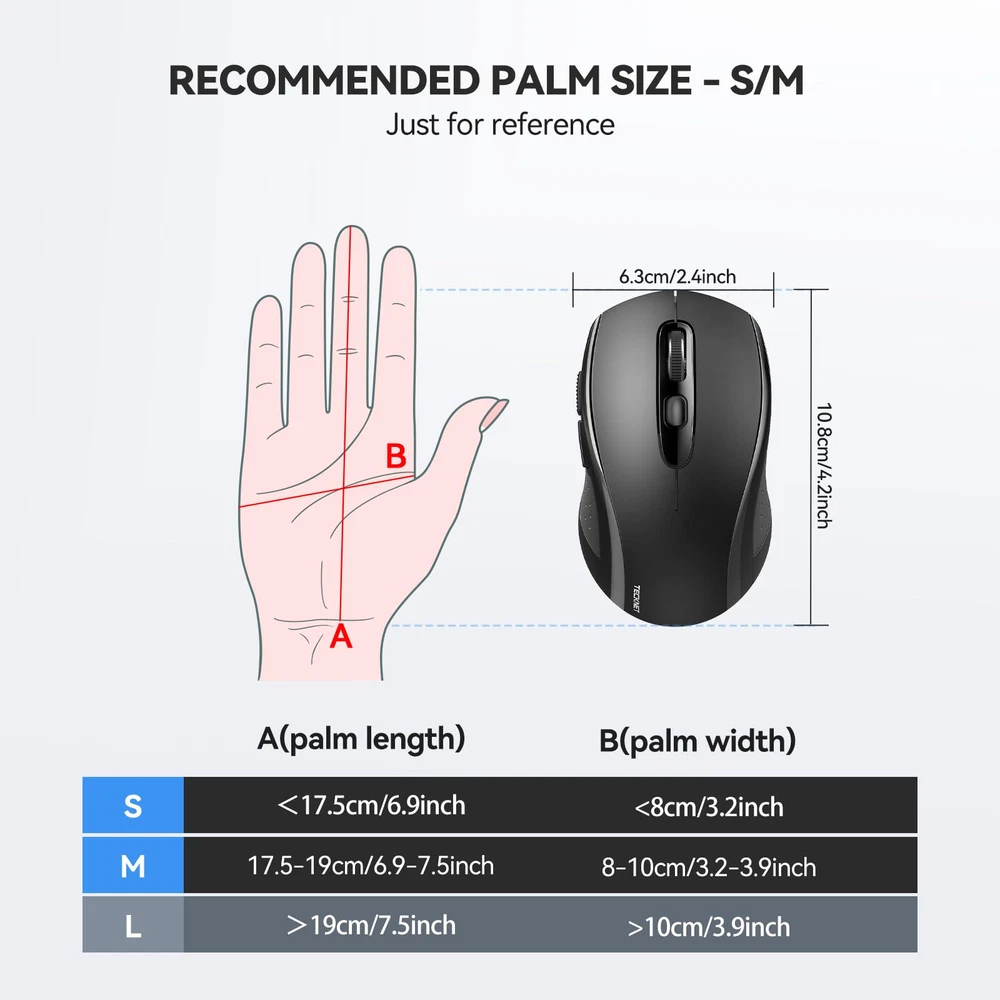 2 in 1 (Bluetooth+2.4Ghz USB) Bluetooth Mouse: Bluetooth mode works with Windows/ Android/ Mac OS system, bluetooth mouse with BT5.0 to choose from; 2.4Ghz USB mode works with laptop, desktop, or any device with USB-A port, simply plug in the receiver, use as a usb wireless mouse. Or put away the adapter, use it as a Bluetooth mouse for Mac. Also support both connection methods at the same time.(Can not connect through WiFi) Comfortable & Durable Design: With ergonomic design with an elegant profile, this Bluetooth mouse for Mac is perfect to fit your hands, providing a comfortable user experience. Bluetooth mouse tested over 10 million times click lifespan ensures long-term stable use. The wireless mouse is medium-sized and is very convenient to carry on trips or outings, note, If your palms are larger and like an oversized wireless mouse, please consider carefully Multiple Adjustable DPI Levels: To meet the needs of different groups, wireless mouse for MacBook Air with 4 levels of DPI, 800/1200/1600/2400/4000, and comes with a Nano receiver (stored in the back of the mouse for laptop). No need for any driver, and you can plug and play the computer bluetooth mouse directly, advanced Tru-Wave optical tracking technology ensures precise tracking on most surfaces Enable High-Efficiency Multiple Working Modes: Wireless mouse supports switches between 2 devices (with Bluetooth mode and 2.4G mode) simultaneously with just one bluetooth mouse, without plugging and pairing. Bluetooth mouse for macbook air according to the adaptation method of your device with two connectivity options to choose from: one USB-A and another Bluetooth connection, note: Macbook without a USB-a port can be connected with Bluetooth. Hassle-free Design: Bluetooth mouse for mac with smart auto-sleep mode, battery life up to 18 months(NOTE: batteries not included, battery life may vary); Compatible with Windows 11/10/8/7/XP/Vista and Mac OS X/Linux/Android/iOS(13+). Moving quickly forward or back between documents or browsing websites is a breeze with Back/Forward buttons(NOTE: not suitable for Mac System) on the left side of the bluetooth mouse, which may affect left-handed use, please understand Convenient Connection Steps: 2.4G mode, insert battery, toggle the switch to select the 2.4G wireless mode, then plug the receiver into the USB-a port of the device, press any button to confirm the connection successfully; Bluetooth mode, insert battery, toggle the switch to select the Bluetooth mode. Long press the Bluetooth pairing button for 3s to enable pairing. Turn on the computer's Bluetooth and search for Bluetooth signal, at last connect is ok Warm Notice: 2-in-1 wireless bluetooth mouse switching Bluetooth and USB is supported, but it is not possible to operate on two devices at the same time (this prompt is to avoid misunderstanding by some customers). It is not rechargeable and requires AA batteries. If your device only has USB-C port, USB-A receiver cannot be used. However, you can still connect the computer mouse wireless via Bluetooth. On Mac systems, the side buttons (forward/backward) are not functional