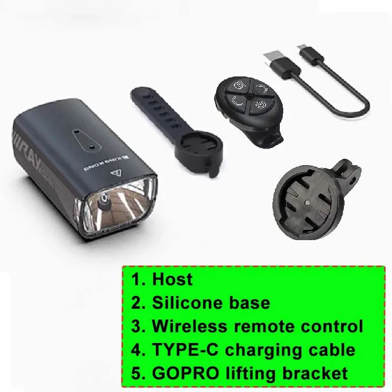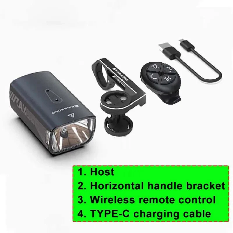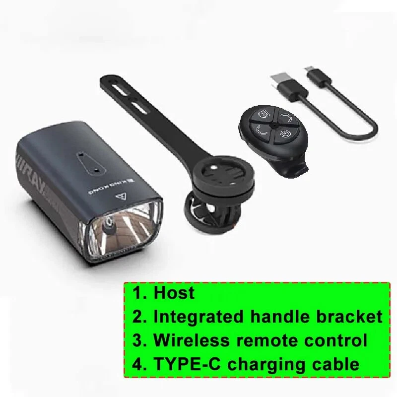 wireless remote control bicycle lighting, multifunctional bracket reverse high beam light, cut-off line, anti glare bicycle light, bicycle glare flashlight, waterproof bicycle lighting and bicycle accessories suitable for various road conditions. Product specification: Waterproof grade: IP65 (light rain, splashing water) Product material: aluminum alloy Exposure distance: over 300 meters LED: Flat car lamp beads Bracket: Multifunctional extension bracket (4 bracket options) Charging and discharge protection: built-in overcharge and discharge ICs. Extending battery life Working voltage: 3.7V Product color: black Lighting mode: strong light lighting; Medium light; Weak light; Burst flash Intelligent mode: automatic start stop function LED color temperature: 7500K Charging type: TYPE-C 2A fast charging - USB charging Battery: Built-in 5000 mA/h rechargeable lithium battery Switch settings: wireless remote control Lens type: cu