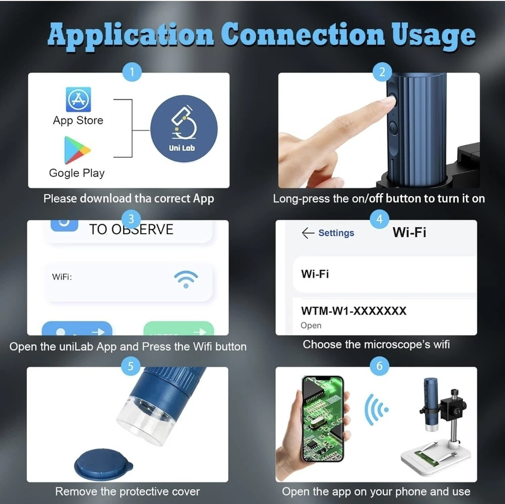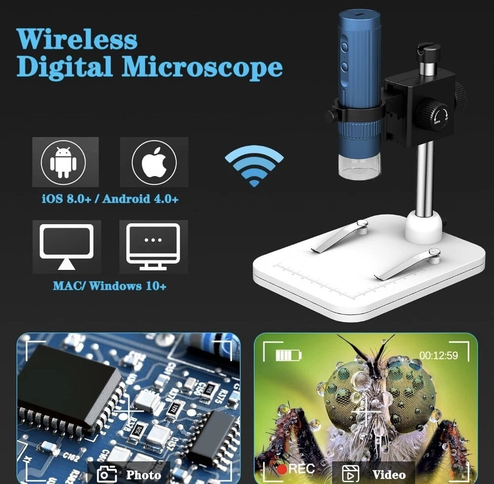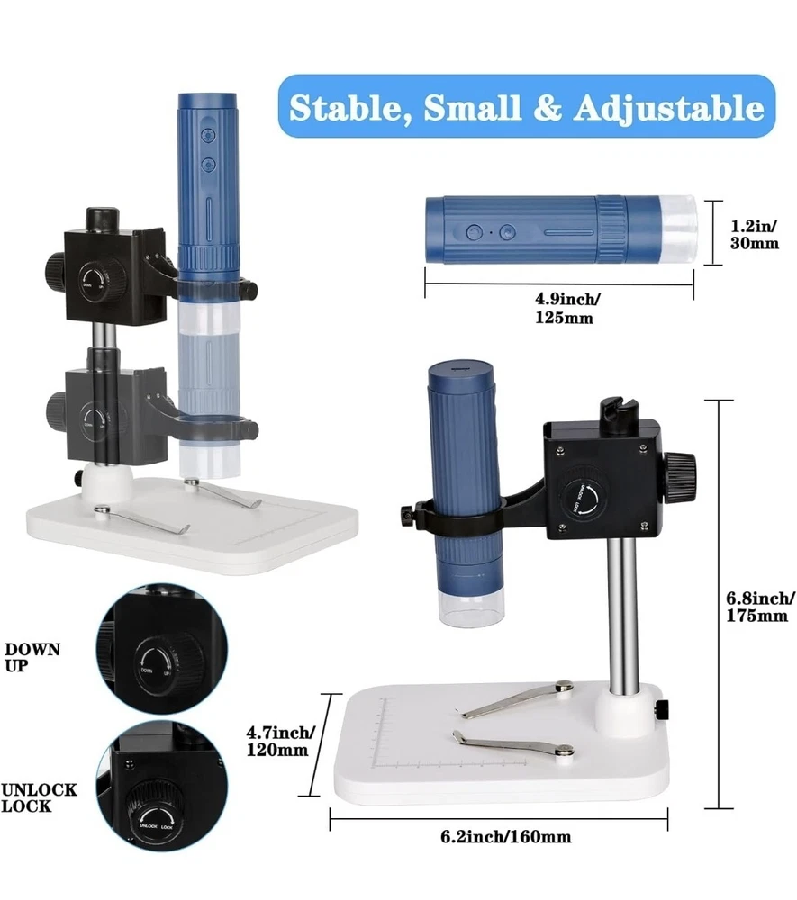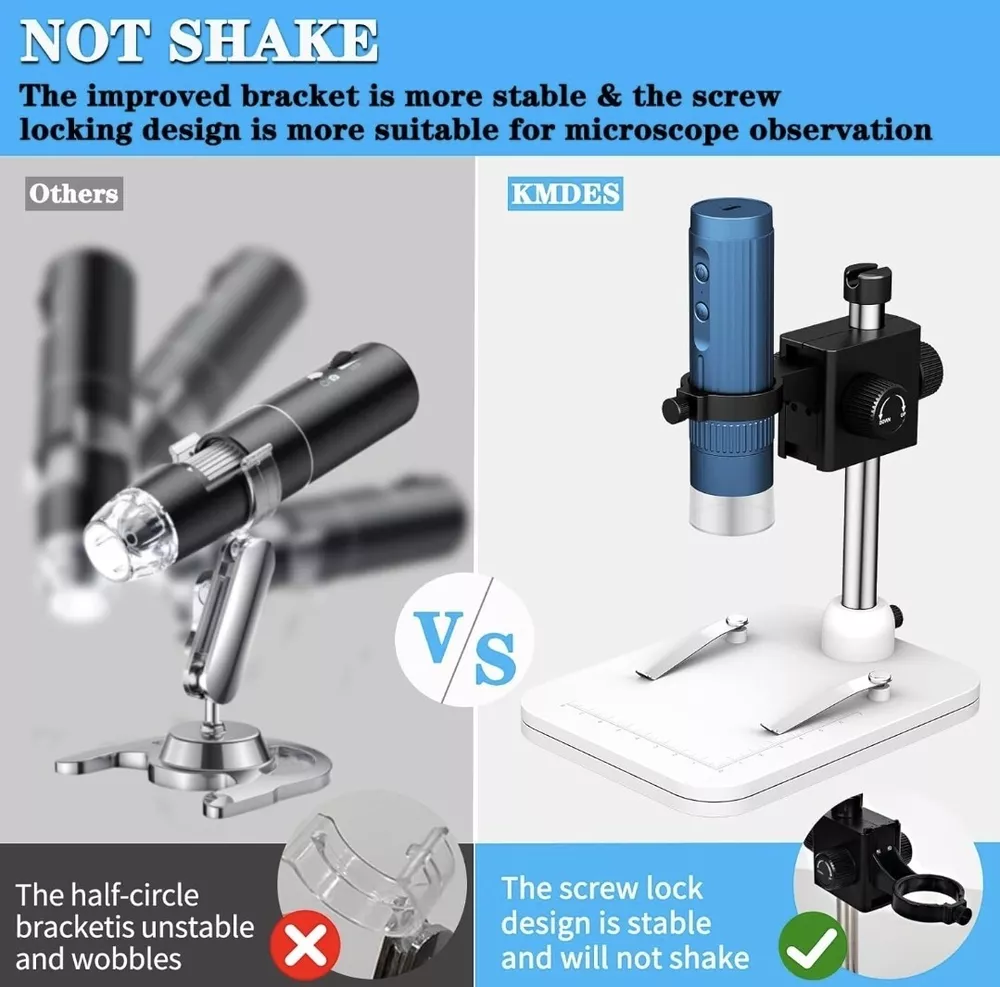 NO Shaking Upgrade Bracket: We have improved and upgraded the design to match a more stable USB digital microscope, which will not affect the focus of the microscope when shaking at any time during use. The base is equipped with a fixer to make the observation object difficult to move, which solves the problem of shaking for you. Roller adjustment precision focus, super easy to use. 50X-1000X Magnification Digital Microscope : Wireless digital microscope With 50X to 1000X magnification, you can easily and accurately examine small objects such as coins and hair. The actual magnification varies depending on the distance between the object and the camera and the observation. This electron microscope can also take pictures and record videos to record your wonderful journey! Adjustable 8 LED Lights: Eight adjustable LED lights are built into the wireless microscope to provide adequate lighting at three levels of brightness. You can easily use the dimmer button to control the brightness from dark to light. With superior detail and optimum sharpness, users' images and videos can improve the quality of sharpness. LED lights radiated by a diffuser are soft and do not startle the subject being observed. KMDES WiFi and USB Microscopes: Electron microscopes have 1000x magnification and resolution of 1080p/720p. Using either USB or WiFi, the microscope adjusts the object to the lens and turns the focus wheel to see fine details. It is portable and independent, with a rechargeable lithium battery inside, and can be observed outdoors for 4-5 hours, which is convenient and accurate. Microscope for Adults and Kids: This digital microscope is suitable for circuit board soldering, clock repair, textile industry, error coin identification, children's educational testing, biological observation (not suitable for cells), researchers, jewelry, stamps, plants, Qc inspection, etc. It is a popular and meaningful gift for children, students and amateurs. (Note: Not for serious professional biologists!) PC/Android Download: Mobile phone first scan the QR code of the user manual, enter the page are ios, Android (Mainland China), Android (Google Play), according to your cell phone system to choose to download. For IOS system, you can search for UniLab in the Apple Store. Computer download is to enter the URL https://www.weetool.net download, select UniLab for Windows.exe zip, and then unzip, and then install the UniLab software, after successful installation to connect the digital microscope