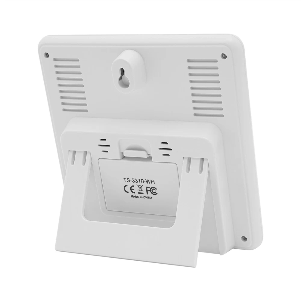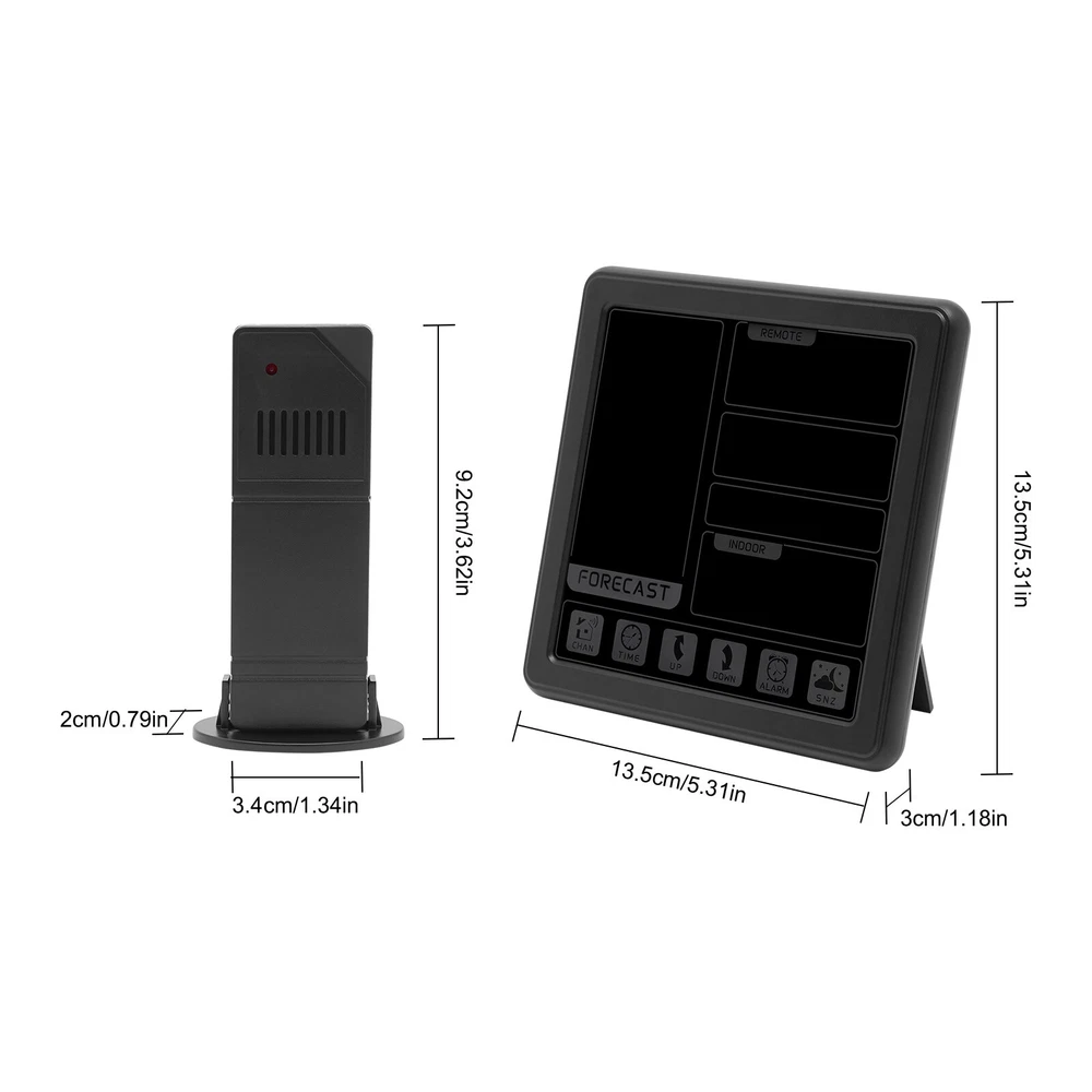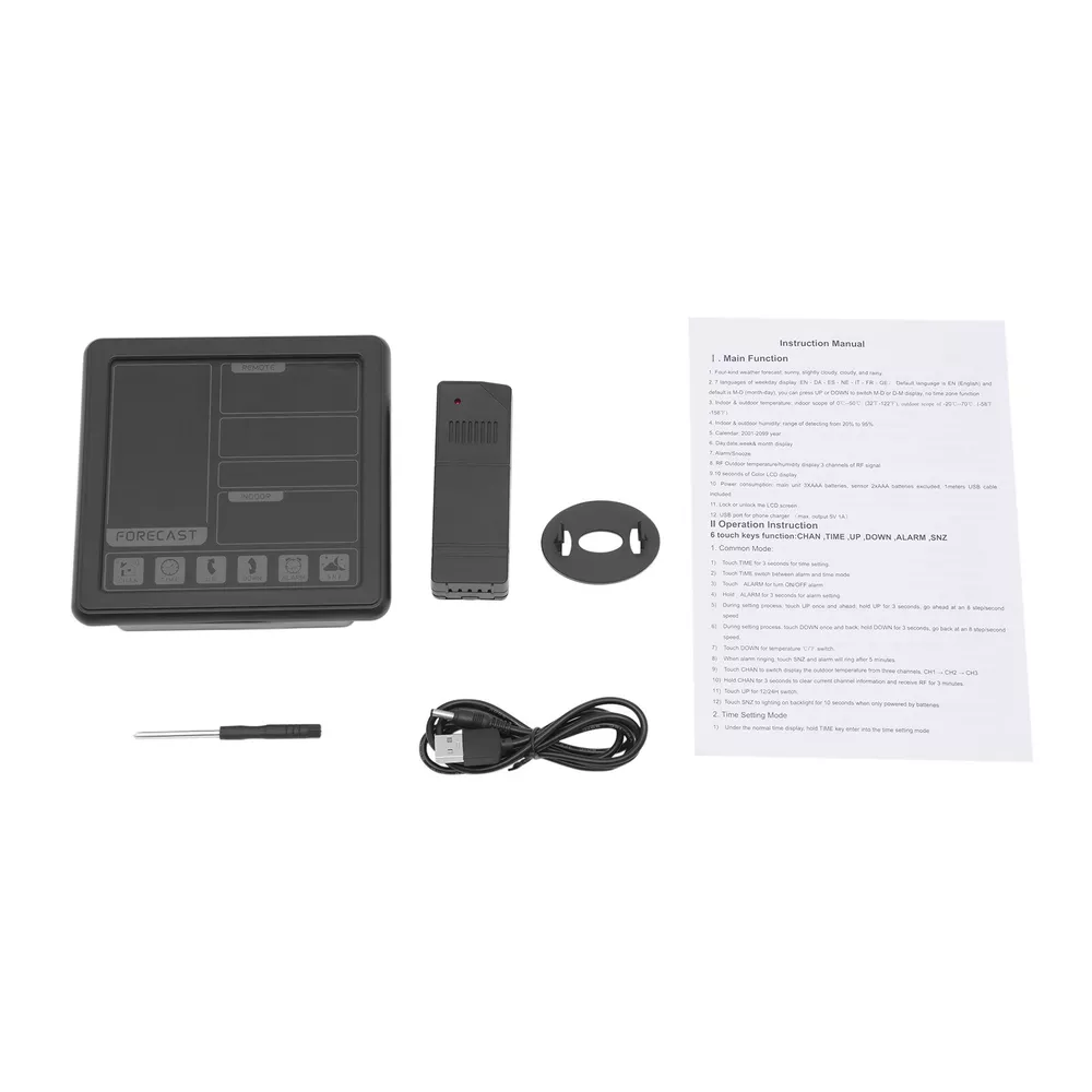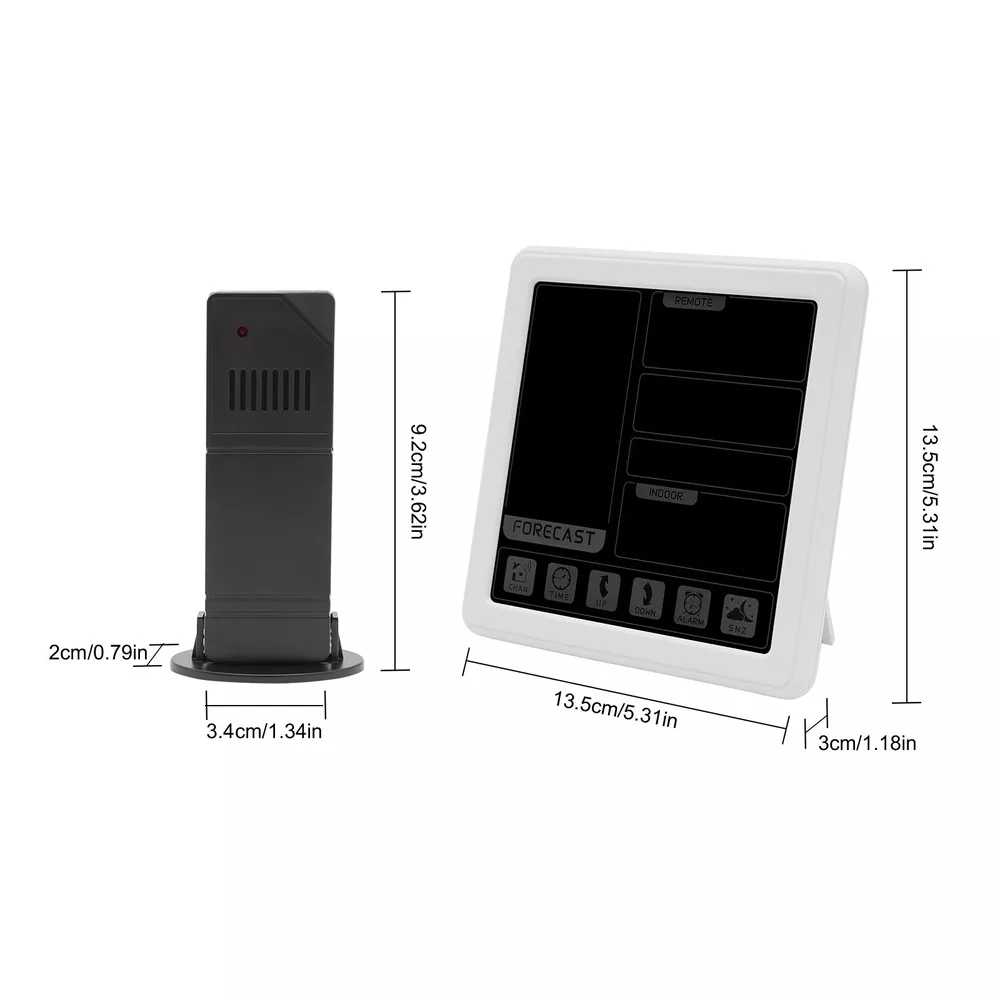 Specification Material: Plastic Color: Black / White Assembly Required: No Display Type: Digital USB Port Maximum Output: 5V 1A Sensor Battery Type: 2 * AAA ( Not Included ) Weather Station Battery Type: 3 * AAA ( Not Included ) Four-kind Weather Forecast: Sunny, Slightly Cloudy, Cloudy, and Rainy. 7 Languages of Weekday Display: EN - DA - ES - NE - IT - FR - GE Default Language: English Default Calendar: M-D (Month-Day) Cable Length: 1m/3.28ft Humidity Detection Range: 20%-95% Temperature Detection Range: Indoor Range: 0℃-50℃/32℉-122℉, Outdoor Range: -20℃-70℃/-58℉-158℉ RF Outdoor Temperature/Humidity Display: 3 Channels of RF Signal Package Included 1 * Weather Station 1 * Sensor 1 * Power Cable 1 * English Instruction Other Accessories for Assembly Digital Weather Station Indoor Outdoor Wireless Temperature Humidity Monitor LCD Digital Weather Station Indoor Outdoor Wireless Temperature Humidity Monitor LCD Description This weather station is designed with a touch screen to make it easier and faster to use. Its indoor and outdoor temperature format allows you to check all the weather information while lying in bed and know what to wear before you get up. With its calendar, alarm, and weather forecast, this product will be your caring butler! Specification Material: Plastic Color: Black / White Assembly Required: No Display Type: Digital USB Port Maximum Output: 5V 1A Sensor Battery Type: 2 * AAA ( Not Included ) Weather Station Battery Type: 3 * AAA ( Not Included ) Four-kind Weather Forecast: Sunny, Slightly Cloudy, Cloudy, and Rainy. 7 Languages of Weekday Display: EN - DA - ES - NE - IT - FR - GE Default Language: English Default Calendar: M-D (Month-Day) Cable Length: 1m/3.28ft Humidity Detection Range: 20%-95% Temperature Detection Range: Indoor Range: 0℃-50℃/32℉-122℉, Outdoor Range: -20℃-70℃/-58℉-158℉ RF Outdoor Temperature/Humidity Display: 3 Channels of RF Signal Calendar: 2001-2099 Year Display Type: LCD Sensor Transmission Distance: Open Distance: 100m/328.08ft; Effective Distance: 30m/98.43ft Gross Weight: 0.38kg/ 0.84 lbs Net Weight: 0.26kg/ 0.57 lbs Weather Station Size: 13.5*3*13.5cm/ 5.31*1.18*5.31 in Sensor size: 3.4*2*9.2cm/ 1.34*0.79*3.62in Package Size: 24*19*5cm/9.45*7.48*1.97 in Package Included 1 * Weather Station 1 * Sensor 1 * Power Cable 1 * English Instruction Other Accessories for Assembly Key Features High-quality Material: This product is made of high-quality plastic, with high hardness, corrosion resistance, anti-oxidation performance, and long service life. Wireless Sensors: The digital weather station with 3 channels, an effective transmission range of up to 98.43 feet and an open transmission range of up to 328.08 feet can monitor a wider range of weather. This high-tech RF sensing technology makes the measurement data more accurate. Multi-function: This product combines a calendar, alarm clock, weather forecast, temperature, and humidity detection functions into one. It also has a 5-minute nap function, making the alarm clock more humane. The child lock function prevents children from accidentally changing the setting. Flexible Installation: The hanging hole and foldable bracket on the back of the product make it placed directly on the desktop or hung on the wall. Multiple Charging Methods: The weather station can be powered by batteries (3*AAA) and a power cord (DC 5V), which provides more convenience for your work on the go. Easy to Use: The touch screen design allows you to adjust the data with just one click. The 1.34*0.79*3.62in weather station display with a backlight allows you to easily read data at all angles and distances, even at night. Ideal Gift: This product is an ideal gift for birthdays, Christmas, Mother's Day, Valentine's Day, Father's Day, or for people who love outdoor activities. Good Customer Service: Communication is the best way to solve problems. If you encounter any problem after purchase, please contact us in time before opening or unpacking the box. We will do our best to solve the problem for you. Details Tuyere: The multi-tuyere design makes the product's air intake area larger, thus making the measurement data more accurate. One-touch Conversion: This product can convert Celsius and Fahrenheit degrees and 12/24 hour system with one easy touch. Application This product is applicable to a nursery, office, incubator, greenhouse, garden, wine cellar, basement, animal aquarium, etc. Notes The batteries are not included in the package. Under natural ventilation conditions, the weather forecast will be very accurate. However, there may be errors indoors, especially in air-conditioned rooms. In order to obtain accurate humidity readings, it is recommended to install the outdoor wireless sensor in the shaded area of the wall facing north to avoid direct sunlight and radiant heat sources and pay attention to water and rain prevention. Please allow the slight color difference caused by the shooting light and the 1-3 cm error due to manual measurement, and make sure you do not mind before ordering. Payment Delivery details Terms of sales About us Contact us Payment We accept ebay payment 。 Fees such as import duties, taxes are not included in the item price or shipping costs. These charges are the buyer's responsibility. Delivery details Shipping: 2-9 working days to: USA Terms of sales We maintain high standards of excellence and strive for hundred percent customer satisfaction. Feedback is very important to us. We hope that you contact us immediately before you give neutral or negative feedback, so that we can address your concerns. It is impossible to address issues if we do not know about them! About us Your satis faction is our ultimate goal. We work hard to earn your trust and future business. Our certified technicians have tested each item before shipping. The unit comes with 1 year limited warranty on all manufacturing defects. a) If you receive a defective item, you may return it or ask for 