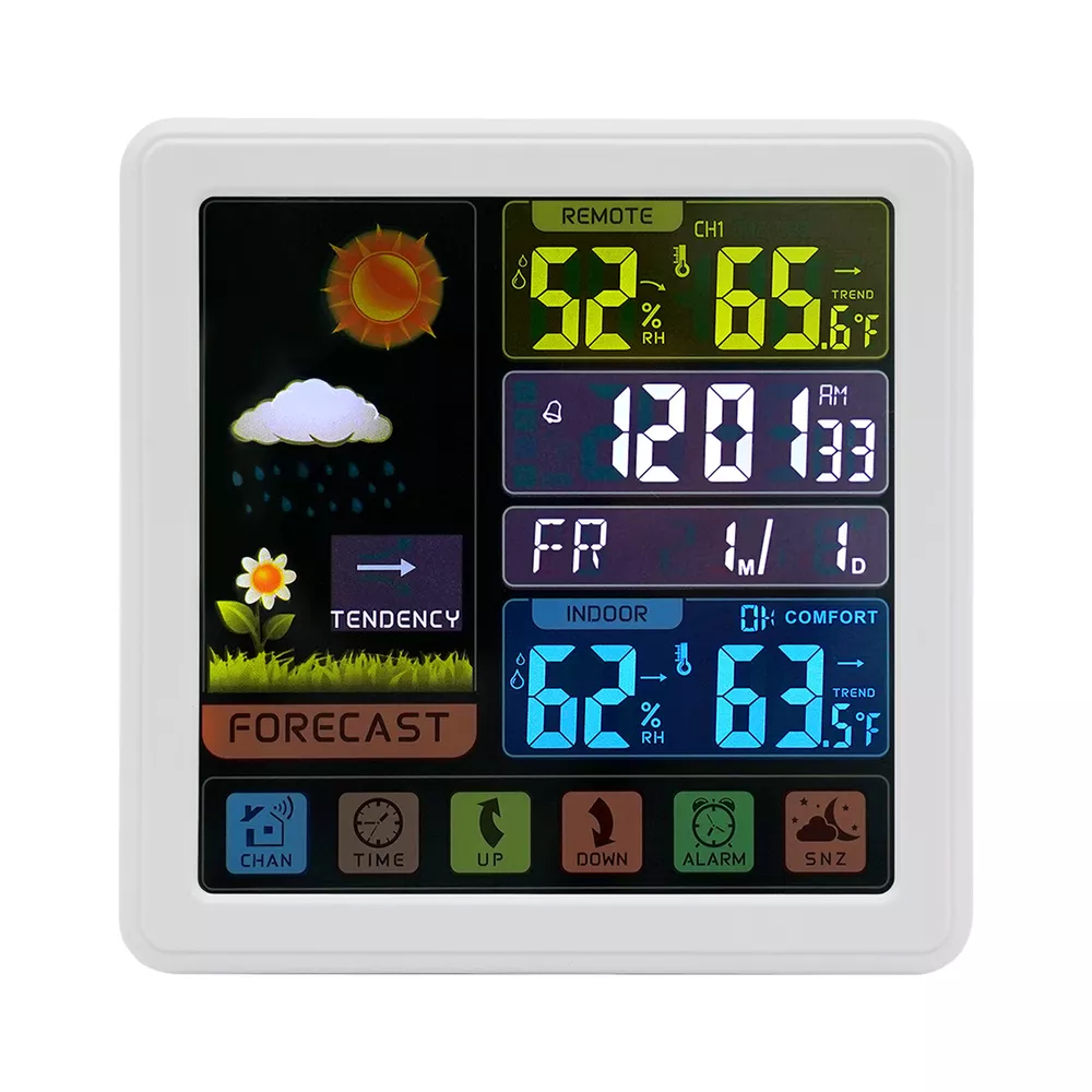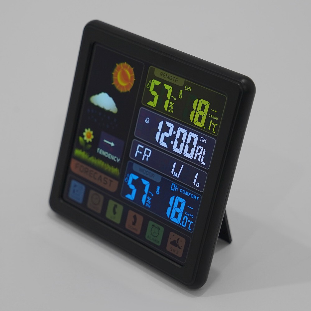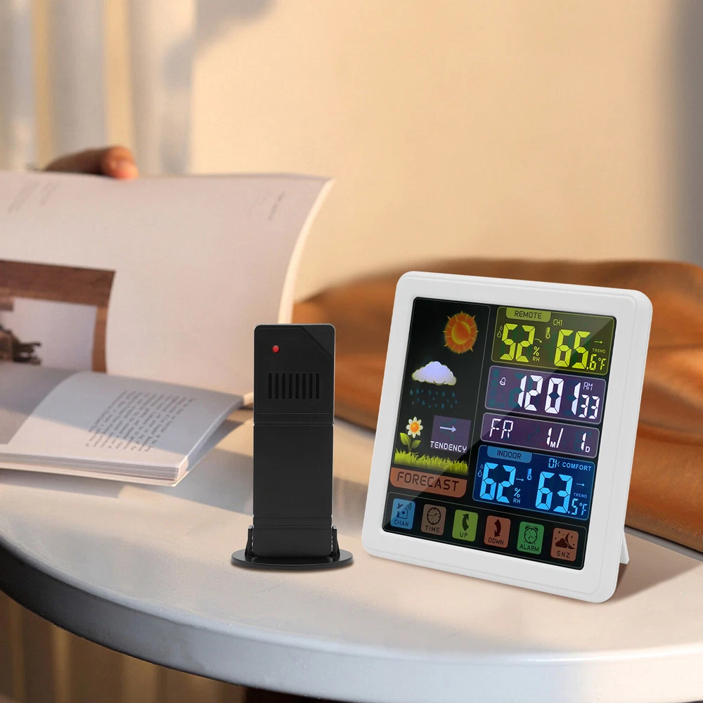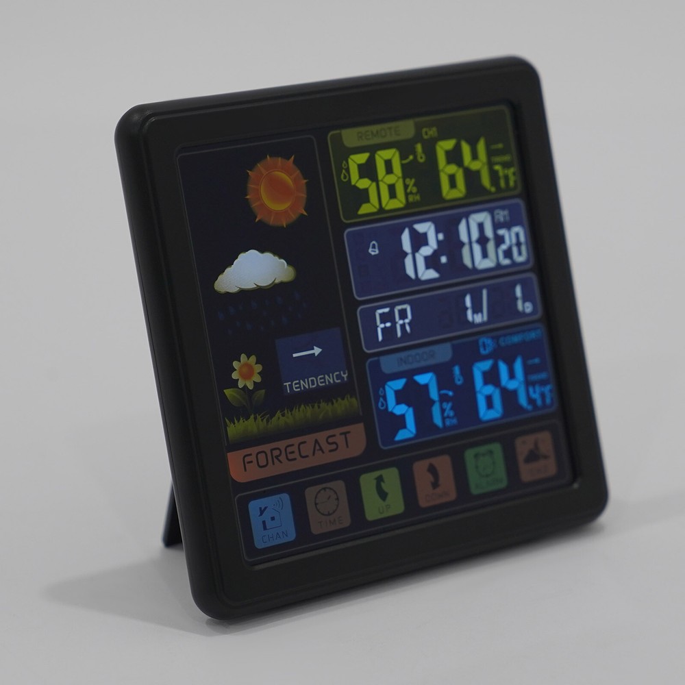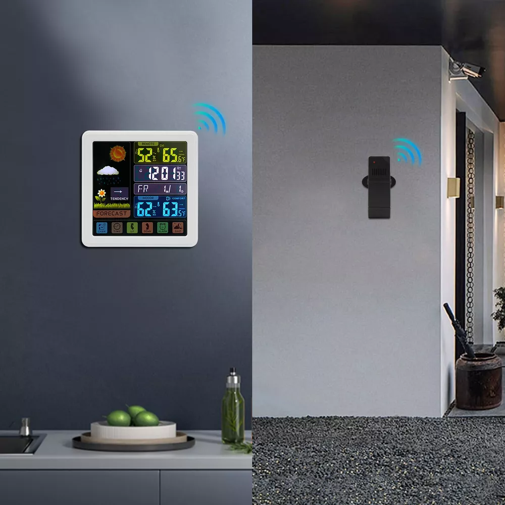 Specification Material: Plastic Color: Black / White Assembly Required: No Display Type: Digital USB Port Maximum Output: 5V 1A Sensor Battery Type: 2 * AAA ( Not Included ) Weather Station Battery Type: 3 * AAA ( Not Included ) Four-kind Weather Forecast: Sunny, Slightly Cloudy, Cloudy, and Rainy. 7 Languages of Weekday Display: EN - DA - ES - NE - IT - FR - GE Default Language: English Default Calendar: M-D (Month-Day) Cable Length: 1m/3.28ft Humidity Detection Range: 20%-95% Temperature Detection Range: Indoor Range: 0℃-50℃/32℉-122℉, Outdoor Range: -20℃-70℃/-58℉-158℉ RF Outdoor Temperature/Humidity Display: 3 Channels of RF Signal Package Included 1 * Weather Station 1 * Sensor 1 * Power Cable 1 * English Instruction Other Accessories for Assembly Digital Weather Station Indoor Outdoor Wireless Temperature Humidity Monitor LCD Digital Weather Station Indoor Outdoor Wireless Temperature Humidity Monitor LCD Description This weather station is designed with a touch screen to make it easier and faster to use. Its indoor and outdoor temperature format allows you to check all the weather information while lying in bed and know what to wear before you get up. With its calendar, alarm, and weather forecast, this product will be your caring butler! Specification Material: Plastic Color: Black / White Assembly Required: No Display Type: Digital USB Port Maximum Output: 5V 1A Sensor Battery Type: 2 * AAA ( Not Included ) Weather Station Battery Type: 3 * AAA ( Not Included ) Four-kind Weather Forecast: Sunny, Slightly Cloudy, Cloudy, and Rainy. 7 Languages of Weekday Display: EN - DA - ES - NE - IT - FR - GE Default Language: English Default Calendar: M-D (Month-Day) Cable Length: 1m/3.28ft Humidity Detection Range: 20%-95% Temperature Detection Range: Indoor Range: 0℃-50℃/32℉-122℉, Outdoor Range: -20℃-70℃/-58℉-158℉ RF Outdoor Temperature/Humidity Display: 3 Channels of RF Signal Calendar: 2001-2099 Year Display Type: LCD Sensor Transmission Distance: Open Distance: 100m/328.08ft; Effective Distance: 30m/98.43ft Gross Weight: 0.38kg/ 0.84 lbs Net Weight: 0.26kg/ 0.57 lbs Weather Station Size: 13.5*3*13.5cm/ 5.31*1.18*5.31 in Sensor size: 3.4*2*9.2cm/ 1.34*0.79*3.62in Package Size: 24*19*5cm/9.45*7.48*1.97 in Package Included 1 * Weather Station 1 * Sensor 1 * Power Cable 1 * English Instruction Other Accessories for Assembly Key Features High-quality Material: This product is made of high-quality plastic, with high hardness, corrosion resistance, anti-oxidation performance, and long service life. Wireless Sensors: The digital weather station with 3 channels, an effective transmission range of up to 98.43 feet and an open transmission range of up to 328.08 feet can monitor a wider range of weather. This high-tech RF sensing technology makes the measurement data more accurate. Multi-function: This product combines a calendar, alarm clock, weather forecast, temperature, and humidity detection functions into one. It also has a 5-minute nap function, making the alarm clock more humane. The child lock function prevents children from accidentally changing the setting. Flexible Installation: The hanging hole and foldable bracket on the back of the product make it placed directly on the desktop or hung on the wall. Multiple Charging Methods: The weather station can be powered by batteries (3*AAA) and a power cord (DC 5V), which provides more convenience for your work on the go. Easy to Use: The touch screen design allows you to adjust the data with just one click. The 1.34*0.79*3.62in weather station display with a backlight allows you to easily read data at all angles and distances, even at night. Ideal Gift: This product is an ideal gift for birthdays, Christmas, Mother's Day, Valentine's Day, Father's Day, or for people who love outdoor activities. Good Customer Service: Communication is the best way to solve problems. If you encounter any problem after purchase, please contact us in time before opening or unpacking the box. We will do our best to solve the problem for you. Details Tuyere: The multi-tuyere design makes the product's air intake area larger, thus making the measurement data more accurate. One-touch Conversion: This product can convert Celsius and Fahrenheit degrees and 12/24 hour system with one easy touch. Application This product is applicable to a nursery, office, incubator, greenhouse, garden, wine cellar, basement, animal aquarium, etc. Notes The batteries are not included in the package. Under natural ventilation conditions, the weather forecast will be very accurate. However, there may be errors indoors, especially in air-conditioned rooms. In order to obtain accurate humidity readings, it is recommended to install the outdoor wireless sensor in the shaded area of the wall facing north to avoid direct sunlight and radiant heat sources and pay attention to water and rain prevention. Please allow the slight color difference caused by the shooting light and the 1-3 cm error due to manual measurement, and make sure you do not mind before ordering. Payment Delivery details Terms of sales About us Contact us Payment We accept ebay payment 。 Fees such as import duties, taxes are not included in the item price or shipping costs. These charges are the buyer's responsibility. Delivery details Shipping: 2-9 working days to: USA Terms of sales We maintain high standards of excellence and strive for hundred percent customer satisfaction. Feedback is very important to us. We hope that you contact us immediately before you give neutral or negative feedback, so that we can address your concerns. It is impossible to address issues if we do not know about them! About us Your satis faction is our ultimate goal. We work hard to earn your trust and future business. Our certified technicians have tested each item before shipping. The unit comes with 1 year limited warranty on all manufacturing defects. a) If you receive a defective item, you may return it or ask for 