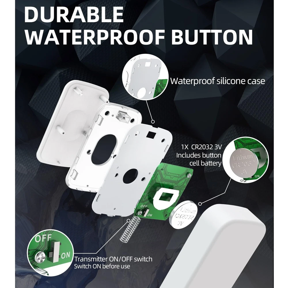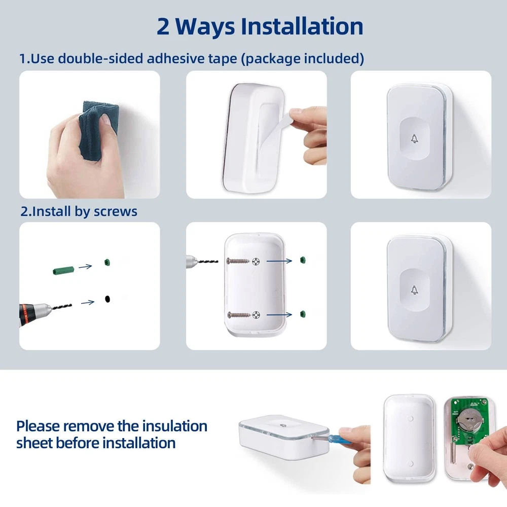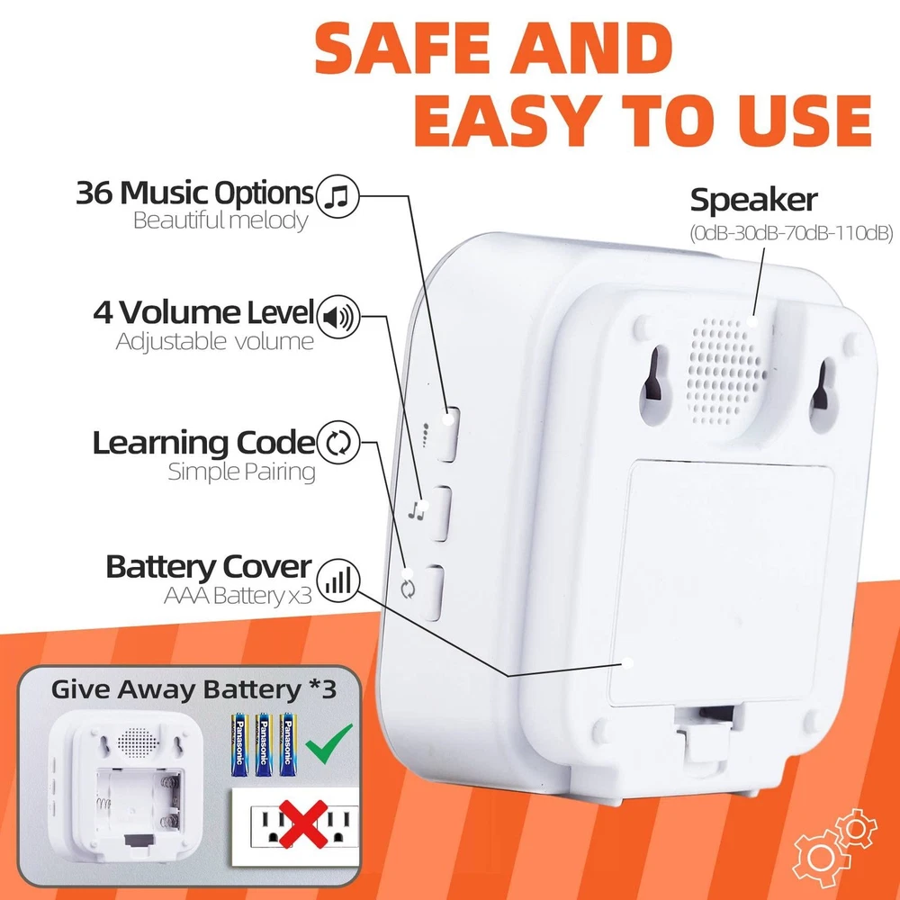 157 Wireless Doorbell(Battery Model): Battery Powered Receiver: The wireless doorbell kit comes with a battery-operated receiver, so you can place the receiver anywhere in the house. LED Flashing Light: The flashing indicator light provides you with a visual notification (this is a great feature for the hearing impaired). 4 Volume Level: You will be happy to know that the volume can be turned down or up, which is a good choice for different environment. 1000ft Working Range: Thanks to its long working area of 1200 feet (open area), no matter where you are, you will never miss the arrival of visitors. Selection of 36 Ringtones: You can choose the best notification method by switching the ringtone. Specification: Receiver voltage: 12V DC (included) Battery: CR2032 3V battery (included) Power consumption: <0.5W Volume: 0-110dB Range: 1000ft in open area Frequency: 433.92 MHz±200KHz Working temperature: -4° F~140 °F (-20°C-55°C) Package Includes: 1x Battery-operated Receiver 1x Transmitter 1x User Manual 1x Mounting Accessories 【Battery Operated Doorbell】battery wireless door bell is powered by 3 AAA batteries (included) so no electric outlet needs to be occupied. The receiver can be mounted onto the wall by screws and it is easy to stand the doorbell on a desk. You also can take it with you to the backyard, basement, garage or bedroom. 【WIRELESS DOORBELL WITH TOUCH BUTTON】The touch button is our new design of door bells ringer wireless. With the function of IP44 dustproof and waterproof, higher sensitivity and lower energy consumption, the push button can be installed indoors and outdoors. 【FLASHING LIGHT DOORBELL】Wireless doorbells for home has 36 Melodies and 4 levels of volume range (mute-low-middle-high). The built-in big LED indicator offer additional assistance for the hearing impaired doorbell. 【LONG OPERATING RANGE UP TO 1000FT】The strong wireless signal of doorbell wireless is up to 1000ft in open area, will not interfere with other equipment in your home or those of your neighbors. 【EASY TO INSTALL DOORBELL】Easily install 3 AAA batteries in the receivers and fix transmitter (pull out the insulating sheet inside) to the door frame. Please do not install too close to the metal or the machine like television, WiFi equipment, computer, etc.We control the quality of our products strictly before delivery. If there is a malfunction, please contact us as soon as possible to get a solution.