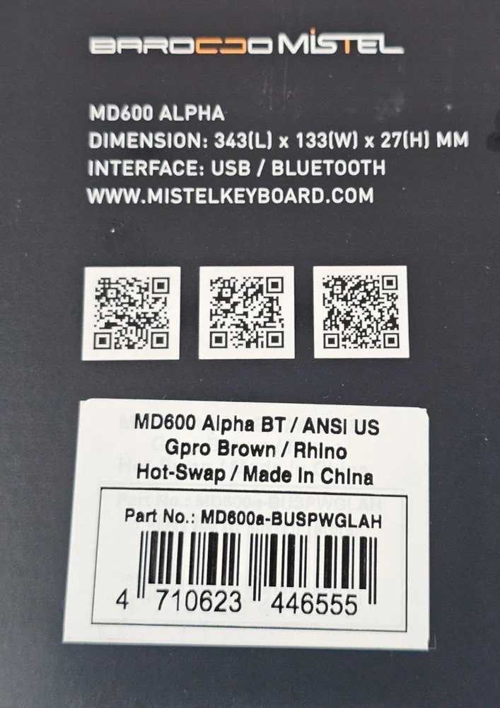 The BAROCCOMiSTEL MD600 Alpha BT is a 60% ergonomic split mechanical keyboard designed for seamless connectivity, comfort, and adaptability. With a unique Split-Alice layout, this keyboard is perfect for gamers, typists, and programmers seeking flexibility and precision. Key Features: Ergonomic Split Design – Adjust the keyboard to your preferred distance and position for optimal comfort. 60% Curvy Layout – Designed to match finger length and press distance, allowing relaxed finger positioning. Dual Mode Connectivity – Switch between Bluetooth and USB-C for both wireless freedom and wired responsiveness. Multi-Device Pairing – Connect up to 3 devices via Bluetooth, with easy switching between them. Programmable Macro Functionality – Customize key bindings to suit your personal workflow or gaming needs. Durable PBT Keycaps – Features double-shot PBT keycaps that resist fading and provide lasting stability. Adjustable Keyboard Angle – Magnetic rubber feet let you modify the angle for improved ergonomics. Additional Information: Device Compatibility : Laptop, PC, Gaming Console Battery Capacity : 2000mAh lithium battery (approx. 3.5 hours to fully charge) Key Switches : MX Mechanical (available in multiple variants) Polling Rate : USB=1000Hz, BT=125Hz Number of Keys : 64 (ANSI layout) Dimensions : 13.5 x 5.2 x 1.1 inches Quarter in photo used for scale.