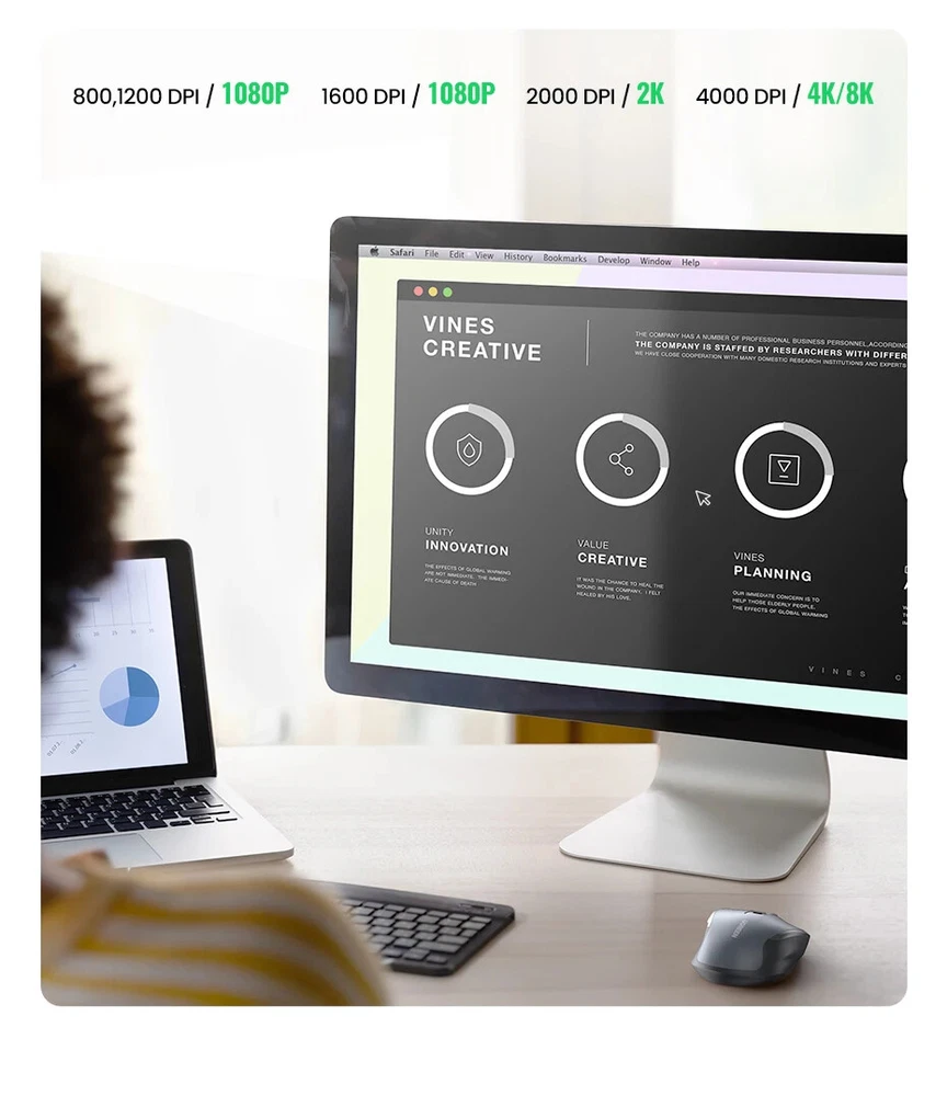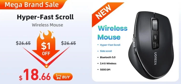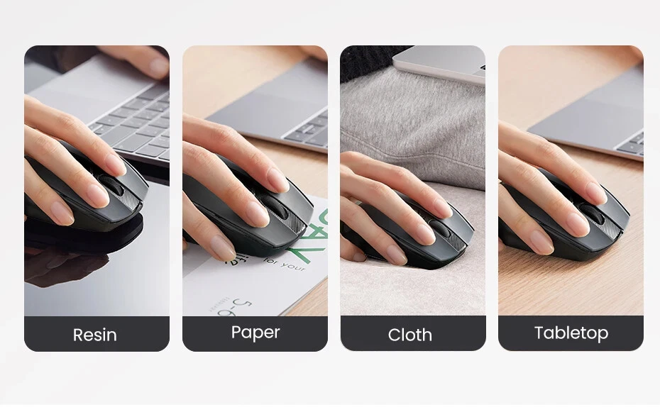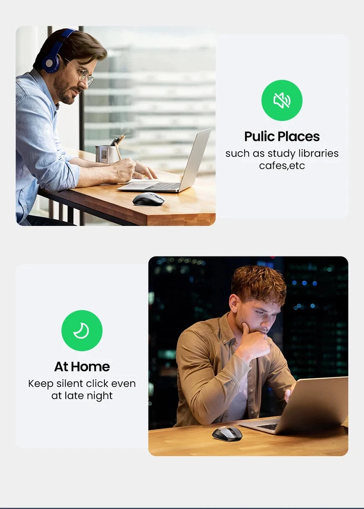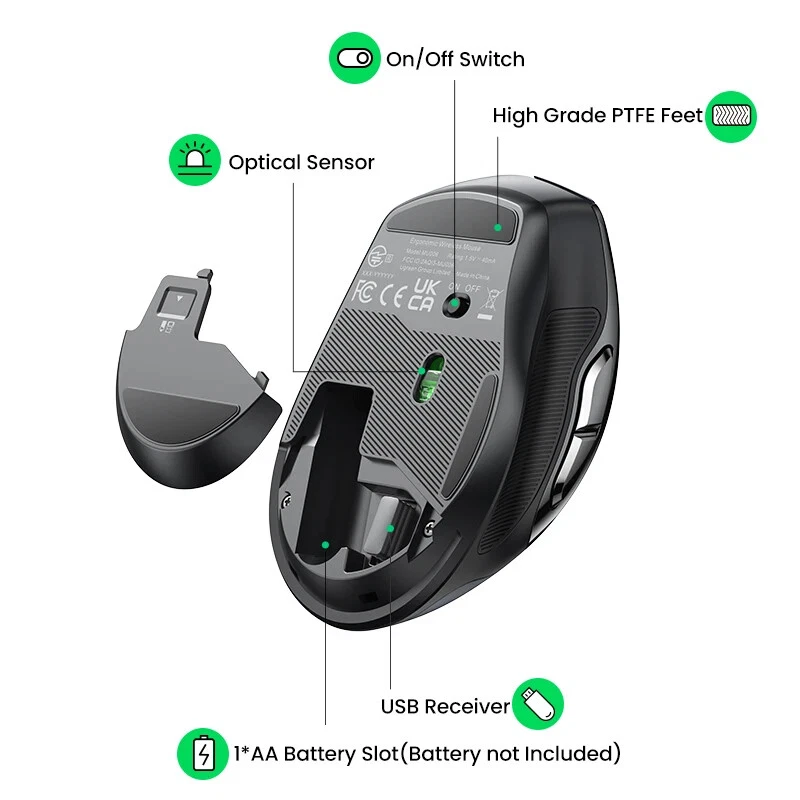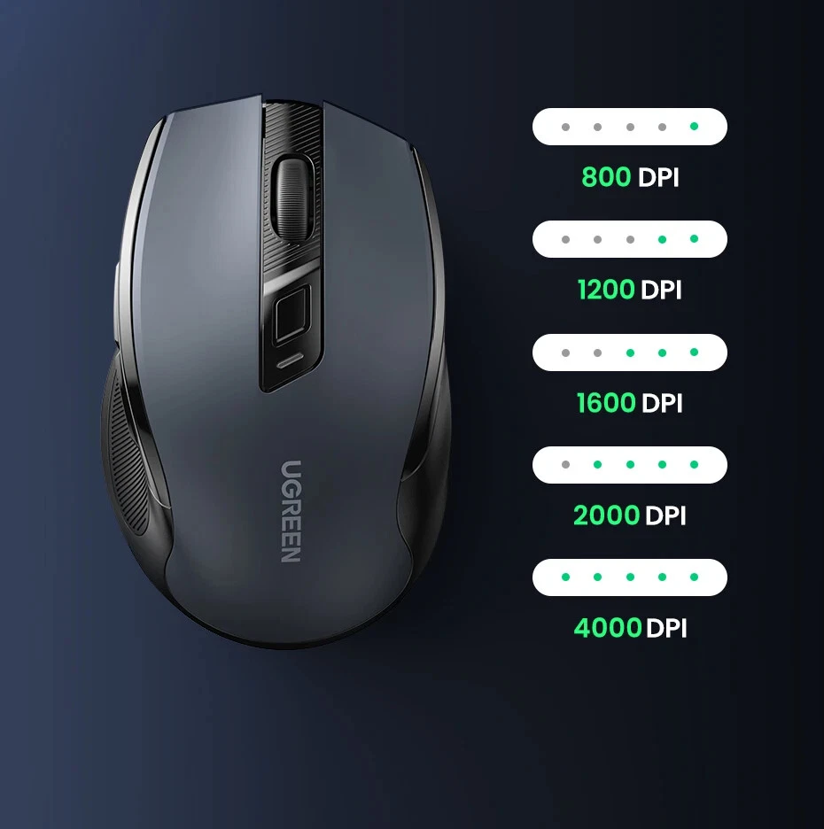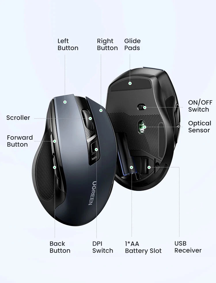 • 5-level Adjustable DPI 4000 max. • Full-size Ergonomic Shape • 6 Mute Buttons • 99% Silent Clicking • 2.4GWireless Transmission • 3 Million Clicks Long Lifespan 4000 DPI max. 5 Levels Adjustable DPI : The switch DPI levels of this wireless mouse among 800/1200/1600/2000/4000 to meet your special needs with higher sensitivity. Accurately restore the movements under high-speed operation, perfectly for 4K/8K HD Display. 6 Mute Buttons ►Left button ►Right button ►Middle button(Scroll wheel) ► Forward key ►Backward key ►Key for switching DPI/ Operation System Full-size Ergonomic Shape Natural Fit Designed to be extra slim, while still fitting naturally in the palm of your hand 99% Silent Clicking This silent wireless mouse for laptop with noiseless design, which is super quiet whether clicking a button, scrolling or moving the mouse, makes it an ideal computer mouse for office, conference room, cafe, library, bedroom. Universal Compatibility,No Driver Required Compatible with Windows 7/8.1/10/11,macOS 10.5 or later, Linux, Chrome OS... *Green light: Windows system · Blue light: macOS system 15m Long Range Transmitter 2.4G wireless connection, anti-interference signal transmission Display of Back Side For Surfaces Pad of Variety Material Using the new Blu-ray technology,Good tracking effect on surfaces of a variety of material, like Wood, Paper, Glass, Cloth 5-Level DPI Setting The default setting is 1600 DPI. Short press the DPI switch key to change, the DPI will be switched cyclically in the order of "1600/2000/4000/800/1200". LED blinks once : 800 DPI LED blinks twice : 1200 DPI LED blinks 3 times : 1600 DPI LED blinks 4 times : 2000 DPI LED blinks 5 times : 4000 DPI Conserve Battery Life with Sleep Mode Automatic Sleep Mode: The mouse automatically switches to sleep mode with 10 minutes unsue, which saves battery life enormously. 18 Months Battery Life: With the energy-saving technology, the battery life of the mouse reaches a maximum of 18 months. *Note: The battery is not included. Craftsmanship Details Silent Scroll: High quality, and keep quiet when scrolling Elegant Surface: Amazing gloss, and won't fade after a long time of use Installation Steps Attention:Battery is NOT included Product Specifications Brand : UGREEN Model No. : MU006 Product : Ergonomic Wireless Mouse Click button : 6 Mute buttons, 3 million times lifespan 5-level DPI : 800/1200/1600/2000/4000, the default setting is 1600 System : Windows 7/8.1/10/11,macOS 10.5 or later,Linux,Chrome OS" Battery : 1x AA battery (NOT included) USB Receiver : 2.4Ghz Wireless Distance : 15 m / 49.2 ft Operating Voltage : 1.5V Operating Current : 40mA Material: Plastic shell, silicone rubber Packaging: UGREEN retail box Packaging