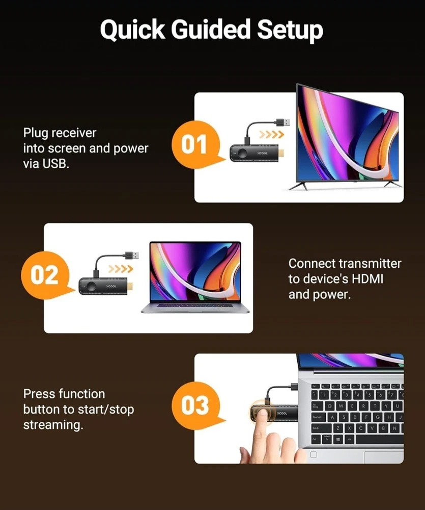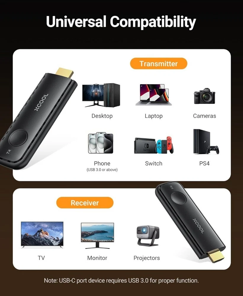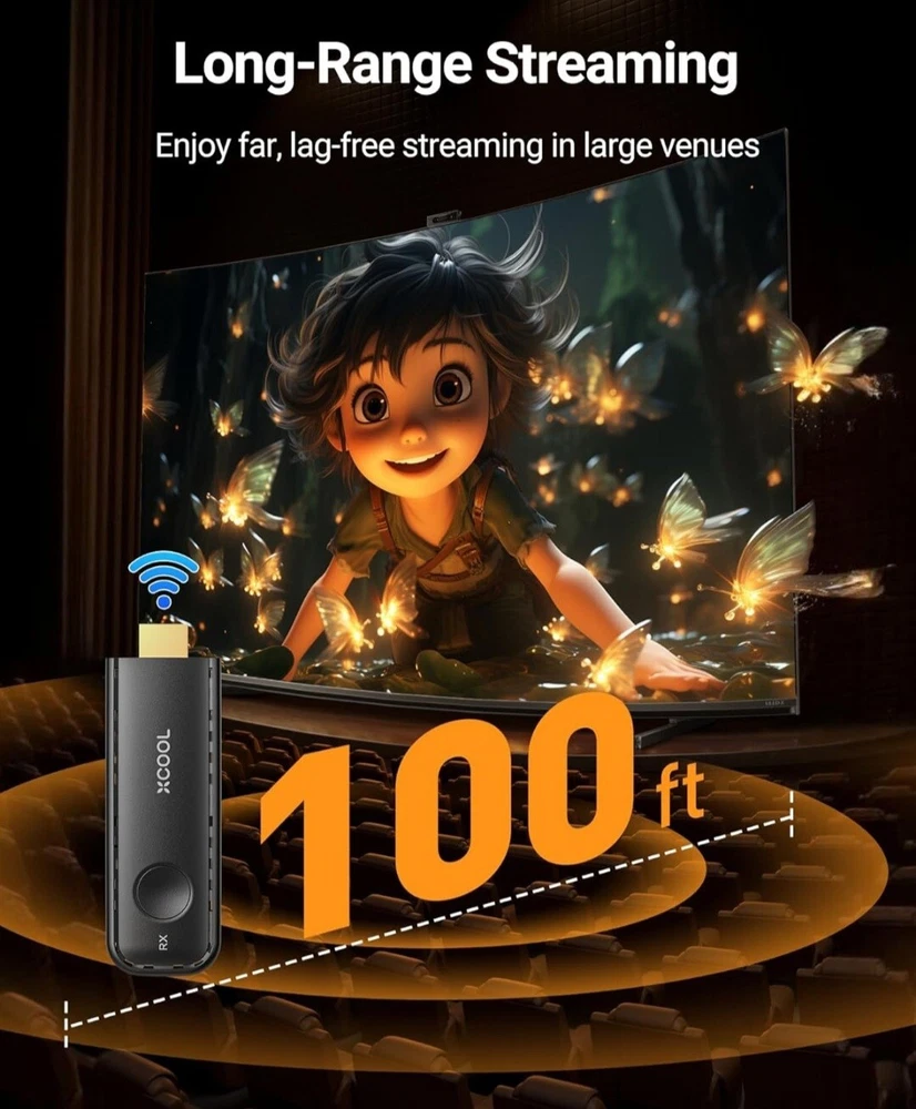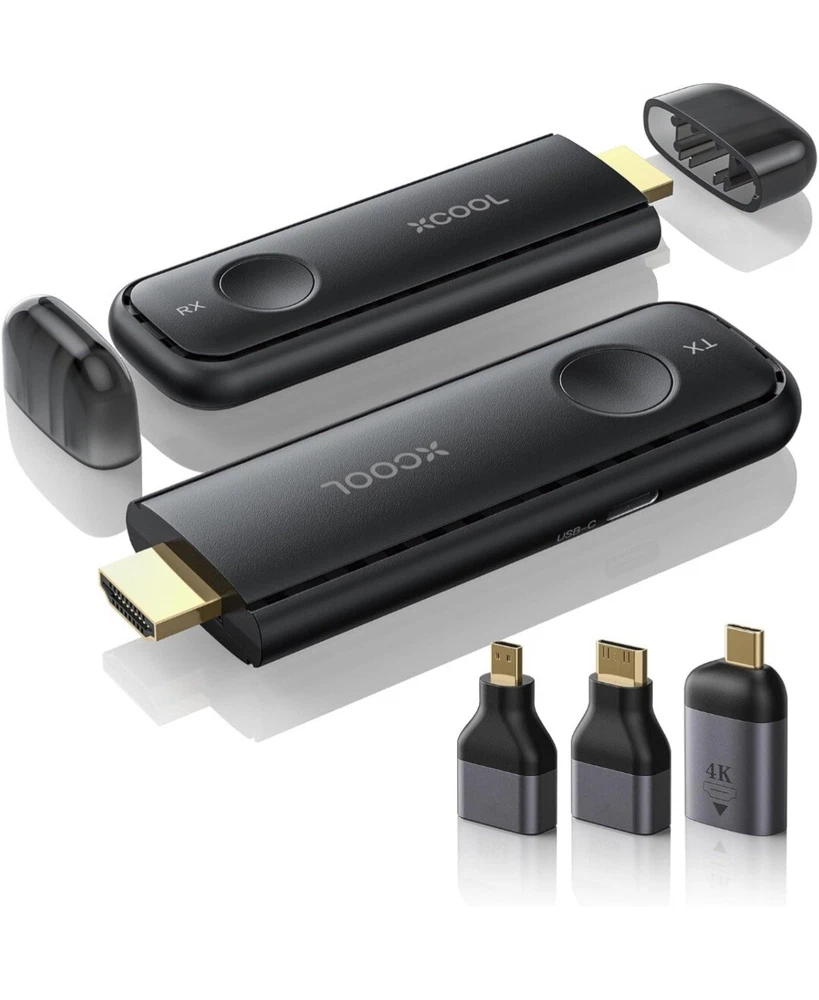 Brand new in the box. We are including a "copy and paste" below of the details/specifications from the manufacturer's listing for this specific item. Please note we found this information online. We are selling this item on consignment, which means we only have one on hand, and no other colors or sizes are available. We are not a licensed reseller or warehouse. ------------------------------------------------ Plug and Play to Stream Your Viewing: Experience simplicity with XCOOL's wireless hdmi transmitter and receiver. Everything you need is included in the box. Just plug in and stream from your laptop or camera to your TV or projector. Perfect for home theaters, sports, outdoor movies, presentations, gaming, and teaching. No apps or Wi-Fi required, and no more tangled cables or unstable connections. Please keep the transmitter and receiver uncovered for heat dissipation Crisp and Steady: XCOOL's hdmi wireless transmitter and receiver supports 2.4G/5G dual-frequency transmission, ESD static protection, and 1080P*60HZ resolution. It delivers a stable, synchronized audio-visual connection, allowing you to enjoy fluid, high-definition visuals on a big screen for a truly immersive and cinematic experience Travel Light, Stream Far: Compact and portable, XCOOL's hdmi sender and receiver wireless is your perfect on-the-go companion, allowing you to cast your screen anytime, anywhere. Whether for business meetings or home entertainment, it breaks down distance barriers with a range up to 100ft and ultra-low latency, delivering vivid, lag-free audiovisuals, no matter where you are Watch What You Love: Unlock a world of streaming possibilities with XCOOL's wireless hdmi sender and receiver. Effortlessly stream from devices like Macs, Windows, Android USB-C devices, cameras, to projectors, monitors, televisions and more. Please note that devices with a USB-C port must support USB 3.0 or above for the transmitter to function properly 3 Modes, Screen Your Way: Mirror Mode transforms small screens into larger, clearer displays for enhanced viewing. Extend Mode allows for a wider range and the ultimate multi-tasking experience. Privacy Mode offers one-click disconnect/reconnect for quick privacy protection and easy reconnection. The wireless hdmi transmitter receiver is an ideal solution for business meetings, large conferences, teaching, movies, gaming, or family gatherings. Connect with Ease: XCOOL's wireless hdmi extender offers two convenient connection options. Opt for the direct plug-in connection by inserting the HDMI receiver directly into your TV, or utilizing the extended connection with an HDMI extension. Please note that the device requires a minimum power supply of 5V2A