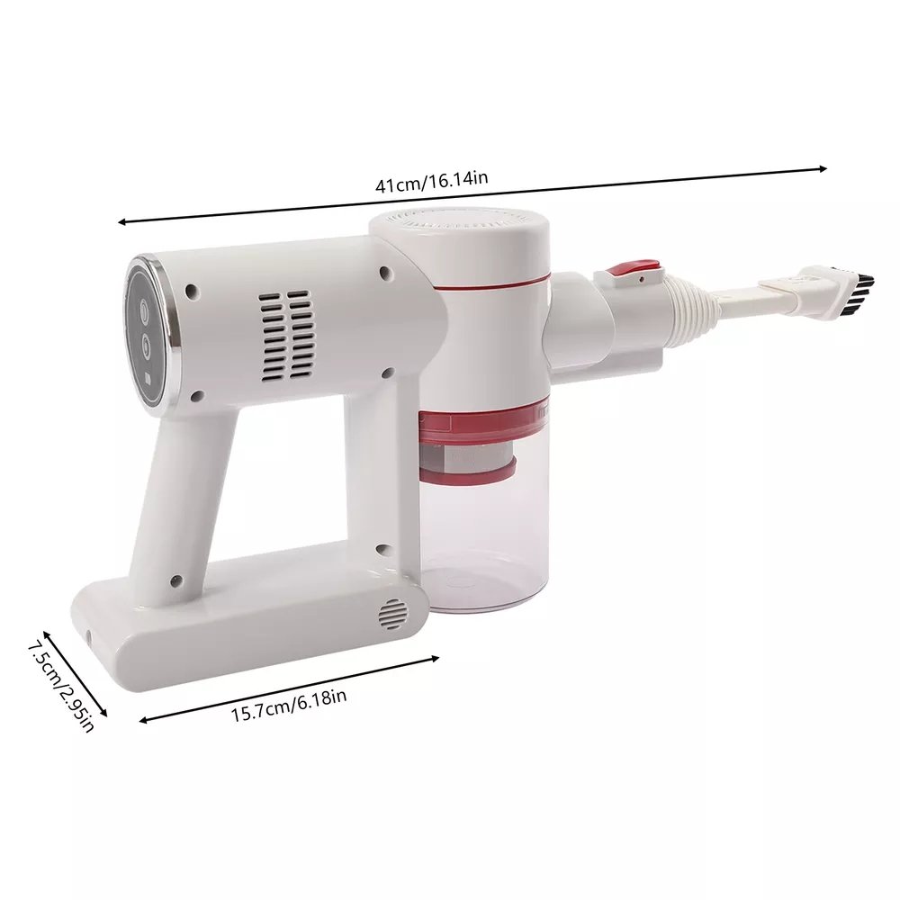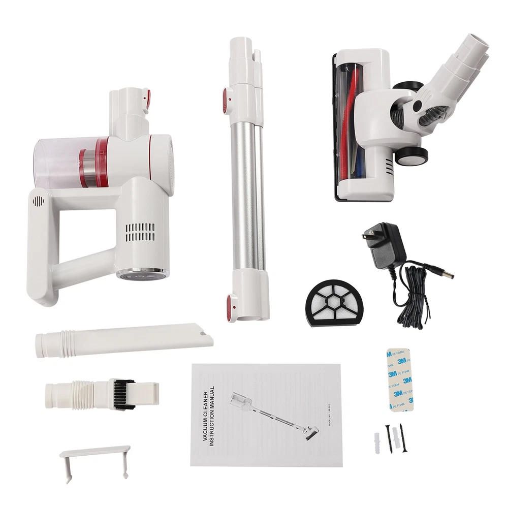 Wireless Handheld Vacuum for Hardwood Floor/Carpet Lightweight and Convenient Cordless Vacuum Cleaner, Wireless Vacuum, Handheld Vacuum for Hardwood Floor/Carpet/Pet Hair Description Bending down to do housework is very tiring and small corners are always difficult to clean. This cordless vacuum cleaner can ease your heavy housework. Made of two pure copper motors, it has high cleaning efficiency with low noise ( Max 68dB ). It has three lithium batteries and each one has a large capacity (2000mah), allowing it to continuously work for more than 15min or 30min under different modes. This cordless vacuum cleaner will be a good addition to your home. Key Features High-quality Material: This product is made of high-quality ABS, which is wear-resistant , waterproof , strong, durable, and not easy to deform. Powerful Suction: It uses two powerful motors and cyclonic duct design to provide strong suction power (9500PA) so that it can easily and quickly suck in fruit shells, paper dust, dust, etc, bringing you a new cleaning experience and saving you lots of time. Excellent Performance: This product uses two pure copper motors, which have strong power, high efficiency, high load capacity, and long-lasting range, providing you with excellent performance. With flexible 180°swivel sideways and 90°up and down, it glides under furniture and cabinets easily to eliminate dust and debris that is hard to reach. Also, it produces low noise (Max 68dB), providing you with a quiet environment. Multi-layer Filtration: Cyclone filtration at the air inlet filters airborne dust, then HEPA filtration and steel filter screen can block fine dust as small as 0.3 microns and lock it in the filter to avoid secondary pollution and ensure good air quality. Lightweight and Convenient: This product is designed to be wireless , which makes it easier for you to flexibly clean the corners in the living room, bedroom, and other places. The lightweight design ( 1.82kg/4.01lbs ) allows you to use it effortlessly with one hand. Women and the elderly will not feel fatigued after using it for a long time. Large Capacity: The dust collection cup has a large capacity of 0.8L/ 0.2gal to store dust, which can avoid air pollution and reduce the cleaning frequency of the machine. Meanwhile, the clear design allows you to view the dust volume for timely cleaning. Long Endurance: The three lithium batteries can support this product to work continuously for about 30min under strong mode and 15min under standard mode on a full charge. It can clean to a maximum area of 120㎡, which can avoid frequent charging to save you lots of time. Snap-on Design: The water tank adopts a snap-on design. After installing the water tank, the brush head can capture dust and hair as well as kitchen air-dried soy sauce and vinegar stains at the same time, avoiding the labor of kneeling to wipe, while reducing the long exposure to absorbing acid and alkali solvent rags to avoid skin aging, roughness, and other injuries to hands. Easy to Operate: The button on the top allows you to turn the machine on or off with just a touch, which is very convenient and quick. Flexible Movement: The two directional wheels at the bottom of the product can facilitate the movement of the product, which makes it easy to clean all corners of the room and can save you a lot of energy. Easy to Install: This product is simple in structure and complete in the package with a detailed instruction manual. You only need a few simple steps to install it, which is very time-saving and labor-saving. A Great Gift: The modern style and good practicality make it a great gift. You can present it to the elders to ease the housework. Protective Packaging: In order to prevent the product from being damaged and bumped during transportation, we fill the package with anti-collision protection foam to protect your products to the maximum extent possible. Guaranteed Customer Service: We are committed to providing quality products and services. If you have any questions, please feel free to contact us. We will reply as soon as possible and solve the problem. Details Ergonomic Handle: The handle is ergonomic and comfortable to hold, which can reduce the fatigue of your hands and arms, and provide you with a pleasant experience. Wall Bracket: It allows you to hang this product on the wall for easy storage. Heat Dissipation Holes: There are heat dissipation holes on the product, which can dissipate heat in time and prolong the service life of this product. Cleaning Brush: It has dense bristles and is suitable for cleaning irregular object surfaces such as curtains, keyboards, and chandeliers. Crevice Nozzle : It is suitable for window slots, sliding door slots, and other furniture with narrow edges and small corners. LED Headlights: It is equipped with LED headlights to easily track dust and debris in dark places. Application It is ideal for cleaning the home, garage, workshop, and vehicle projects. Specification Model: LM-001 Color: White, Silver Housing Material: ABS Style: Modern Plug Voltage: 110V Rated Voltage: 100-240V Power: 150W Number of Gears: 2 Vacuum Suction: 9500PA (Strong Gear), 5000PA(Standard Gear) Power Type: Plug-in, 3*2200mah Lithium Batteries(3.7V) Fully Charge Time: 4h Duration of Use On a Full Charge: 30min(Standard Gear), 15min(Strong Gear) Plug: American Standard Number of Wheels: 2 Wheel Type: Directional Wheel Number of Motors: 2 Motor Type: Pure Copper Motor Motor No-load Speed: 40000rpm Dust Collection Cup Capacity: 0.8L/0.2gal/27oz Brush Head Rotation Angle: Max 270° Rod Rotation Angle: Max 180° (Horizontal), Max 90° (Vertical) Noise: Max 68dB Maximum Clean Area: 120㎡/1291ft² Assembly Required: Yes Net Weight: 1.82kg/4.01lbs Gross Weight: 2.68kg/5.91lbs Package Size: 44.5*19*22.5cm/17.5*7.4*8.8inch Product Size(L*W): 23*8.5cm/9.05*3.35inch Height Range: 87-110cm/34.25-43.31inch Package Included 1* Machine Body 1* Telescopic Tube 1* Floor Brush 1* HEPA Filter 1* Crevice 
