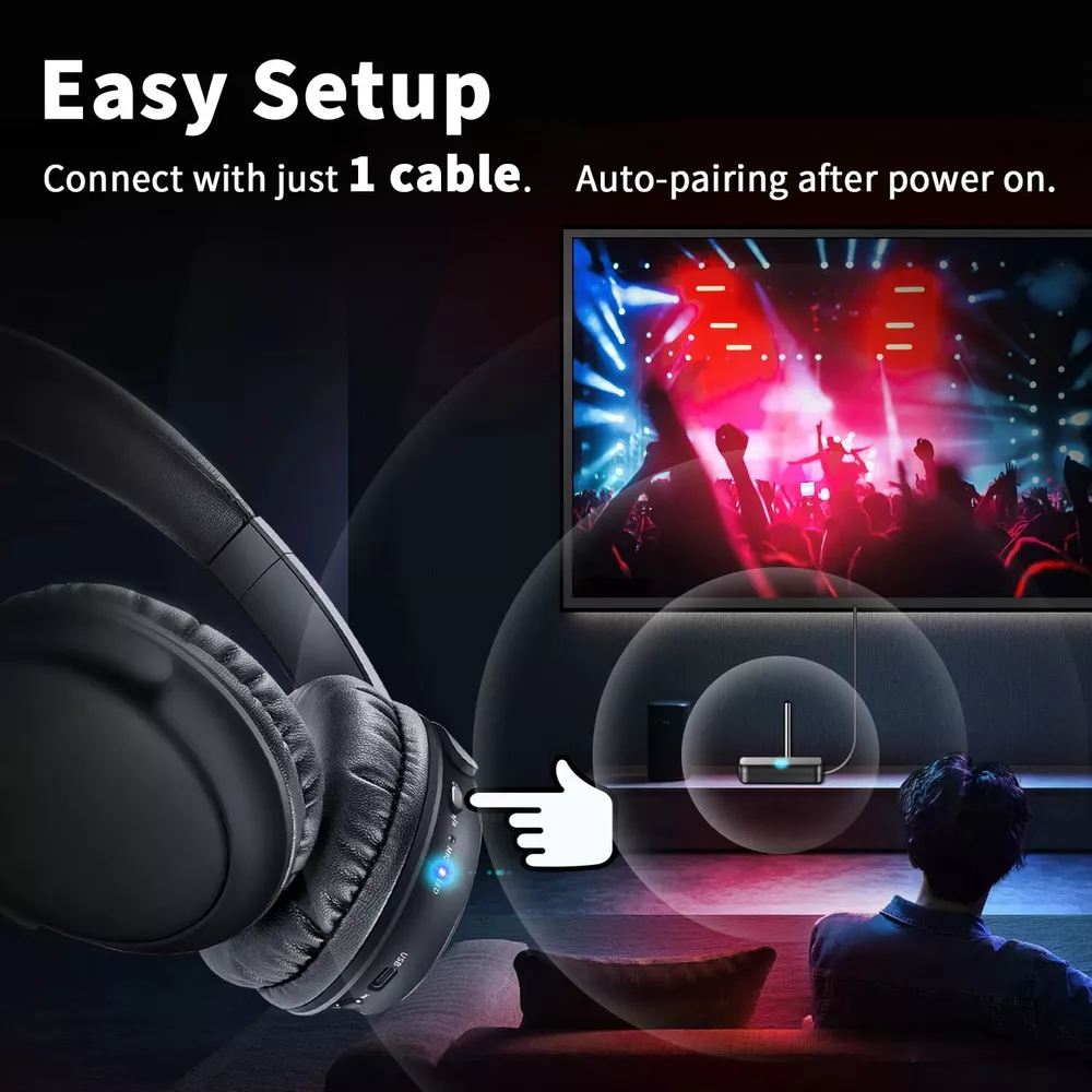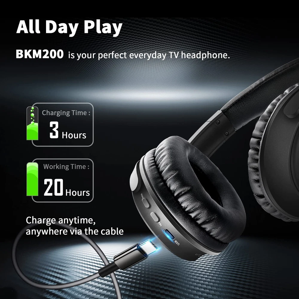 Recommended Uses: Devices with optical, coaxial, RCA or AUX audio OUTPUT, include: TV, Set Top Box, TV Box, , PC, , , MP3, iPod, VCD, Hi-Fi Stereo System, VCR, CD player etc. When using the transmitter the TV internal speakers might not work or become muted. This is TV dependent. BKM200 Headphone Specification: Weight & size: about 5.29oz /150g, 7.09in/180mm Headphone model: Wireless Bluetooth Support profile: Apt-X, HSP, HFP, A2DP, AVRCP Work time: about 15H Charging time: about 3H Standby time: about 300H Battery specifications: Rechargeable Li-ion Battery 3.7V; 300mAh Secure paring: 33ft / 10M Audio standard: 40mm, 32Ω, 110dB speaker Main function: Hi-fi Full Bluetooth decode, stereo voice, led indicator light, foldable design Transmitter Specification: Chip: Qualcomm CSR8670 Chipset Audio codec: A2DP, aptX, aptX-LL, SBC,AAC(APTX, APTX LL, AAC will need license cost) Support ports: Optical, Coaxial, RCA and 3.5mm AUX Operation range: Class I, 100-165ft/30-50M Input voltage/ current: DC 5V/ 500mA Size: 3.6x2.3x0.8in/91x57x21mm (Not including the antenna) Support dual link: can connect with pairs of wireless headsets at the same time Clearing pairing history: Double click power button What's in the box? Bluetooth Headphone Bluetooth Transmitter USB Android cable USB Type-C cable 3.5mm-3.5mm audio cable RCA audio cable Coaxial cable Optical Digital cable Charger 【UP TO 165ft/50m】Especially with the help of ANTENNA and Qualcomm new Bluetooth technology allows strong walls penetrability, up to 165ft / 50M wireless range, little static sound and few interferences of cutting out, ensuring constant perfect audio and image synchronization without delay. 【EASY SET UP】Simply plug the transmitter into a power source and TV’s audio output port, power on the headphone, they’ll auto-connect each other successfully within 3 seconds, and you should be good to go. with 99% of TVs on the market, supports OPTICAL / COAXIAL / 3.5mm AUX / RCA audio output. NOT with streaming video. 【MELODIOUS VOICE, FULL OF RICH LAYERS】Bluetooth 5.2 matching 40mm driver maximize clarity breadth, and balance, you the punch bass, clear human voice and crisp treble performance without distortion, let you enjoy high fidelity immersive stereo sound. 【CHARGING CONVENIENCE】Another level of charging convenience, charge the headphone anytime anywhere via the included Type-C cable and USB adapter. No need to put it back on the charging base away from the sofa. 【LONG-WEAR COMFORT & FEW SOUND LEAKAGES】Ergonomic design, stretchable earband and premium protein earmuffs offer you a comfortable wearing experience for long time use. The high-quality durable earmuff material will not damage after using for more than years. 90℃ rotating earmuffs fit different heads snugly, providing better sound protect, few sound leakages.