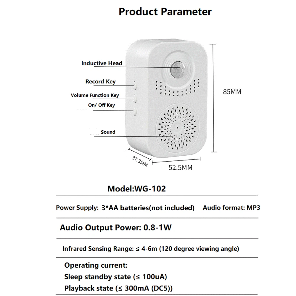 Product Description Welcome Infrared Chime Doorbell Wireless 3-Level Adjustable Volume Door Bell g Welcome Infrared Chime Doorbell Wireless Adjustable Volume Door bell with Recording function Specifications: Color: White Size: 85*52.5*37.3mm Power: 3*AA batteries (not included) Material: ABS plastic Volume: 3 volumes adjustable Operating current: Sleep standby state (≤100uA) and Playback state (≤300mA) Features: Sensor: Sensor , no wiring is required. Convenient: Detect movement you will know anyone entering your setting area. Household Supplies: sensor convenience. Applications: Door suitable for home, business shops, stores, hotels, factories, doorway entrance place requiring either guest saluting function. Automatic.Automatic induction broadcasting,induction distance 4~6 meters. How to record: Long press the recording button to record,you can record what you want to say. Package Includes: 1x Doll Bell(Not included 3* AA Batteries) 1x Sticker Shipping Returns Contact Us Payment 1. Items sent from US warehouse. 2.Receiving time = Processing time + Shipping time 3. Processing Time: Around 1-2 business Days 4. Shipping Time: 3-5 business day it may have a little delay during some holiday (such as Christmas),any problem ,please feel free to contact 1. 30 days warranty from the purchased date. Please contact us via email before returning the defective item. 2.Our warranty does not extended to any product that are physically damaged or that are not under normal operating conditions as result of misuse or improper installation on the buyer/user's part. 3.Return items should include the original packaging and all accessories. buyers MUST contact us for the returning address. 4.In all cases, buyers pay shipping fees at their own cost to return products for exchange or refund. We will be responsible for the postage of replacements. Refund will be made upon receipt of the returned item. Pls contact us if you have any problems,we will try our best to solve for you We accept all verified payment from eBay. Shipping 1. Items sent from US warehouse. 2.Receiving time = Processing time + Shipping time 3. Processing Time: Around 1-2 business Days 4. Shipping Time: 3-5 business day it may have a little delay during some holiday (such as Christmas),any problem ,please feel free to contact Returns 1. 30 days warranty from the purchased date. Please contact us via email before returning the defective item. 2.Our warranty does not extended to any product that are physically damaged or that are not under normal operating conditions as result of misuse or improper installation on the buyer/user's part. 3.Return items should include the original packaging and all accessories. buyers MUST contact us for the returning address. 4.In all cases, buyers pay shipping fees at their own cost to return products for exchange or refund. We will be responsible for the postage of replacements. Refund will be made upon receipt of the returned item. Contact Us Pls contact us if you have any problems,we will try our best to solve for you Payment We accept all verified payment from eBay. You may also like TV Remote Control Controller For Bose Solo 5 TV Soundbar System 535 AUX1 CM525 18.99 USD Storage Case Travel Carrying Bag For Bose SoundLink 3 SoundLink III Speaker 20.0 USD 4Pcs/Set Tires & Wheels Rims For Tamiya TT01 TT02 XV01 HPS HPI 1/10 RC Car aa 22.77 USD Repair LCD Screen Hinge Flex Cable For Canon PowerShot G7X Mark II G7 X II G7X2 12.75 USD Echo Recoil Starter Assembly A051001312 A051001311 Pe-225 Srm-255 Pas-255 17.84 USD 1.99 USD 37mm Watch Dial With Hands For ETA 6497 ST3600 Watch Movement 5 Colors Optional 16.99 USD powered by