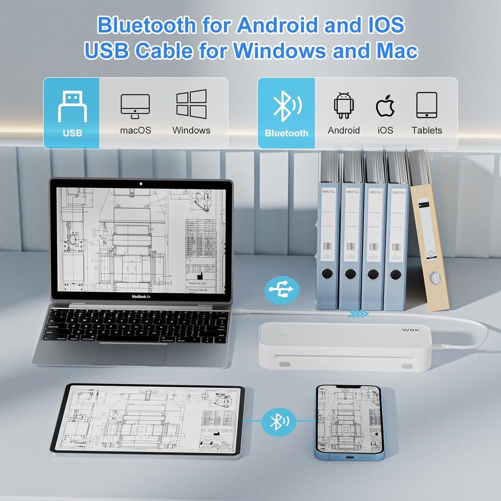 About this item (Travel-Friendly Printer) This sleek, lightweight portable wireless printer is designed for travel, weighing just 1.4 pounds and roughly the size of two smartphones. Easily slip it into your briefcase or backpack for printing anytime, anywhere during trips, business outings, office use, school activities, or even in your car. It also makes a perfect gift for friends and family. (Exceptional Print Quality & Durable Battery Life) Enjoy sharp and precise prints with this compact travel printer. Equipped with a 2600mAh battery, it provides up to 3 hours of uninterrupted printing and can produce up to 360 pages on a single charge. This thermal printer delivers clear photographs, images, design drafts, and text documents, ideal for busy professionals and active students alike. (Economical & Ink-Free Printing) Utilizing advanced thermal technology, this compact wireless printer requires no ink, toner, or ribbons, eliminating issues like clogging and cleaning. Simply use thermal paper for a more efficient and budget-friendly printing experience. (Note: This thermal printer is designed exclusively for thermal paper.) (Seamless Bluetooth Integration) The portable label printer connects smoothly with both iOS and Android devices via Bluetooth. It also works as a space-saving printer for laptops and desktops. For computer use, it connects through a USB cable, enabling printing on the go anytime and anywhere. Download the mobile printing app and install the necessary drivers for setup. (Compact Design & Robust Compatibility) It saves space and keeps your workspace organized, whether mobile or in a vehicle. Supports two methods for loading thermal paper and can print various document types. Compatible with multiple paper sizes, including standard letter sizes and 2", 3", and 4" thermal paper rolls. Product dimensions: 1.9 x 10.4 x 3.2 inches