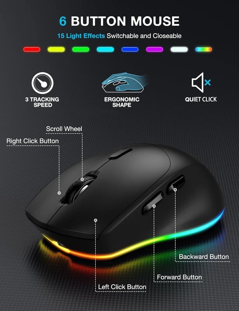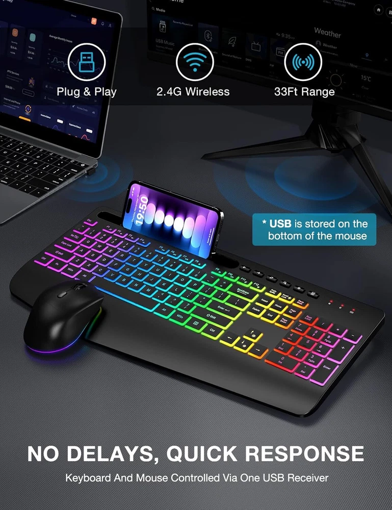 Product Description 54%+ WRIST SUPPORT: The wireless keyboard is equipped with an extra-large wrist rest with a widest edge of 2.8'', which can increase wrist support by 54% and provide you with the most ergonomic Cushioning power and height. This helps prevent common problems like wrist pain that come with long-term computer use. FIND YOUR COLOR: The wireless keyboard and mouse feature color backlit. And both the keyboard and mouse can quickly switch/turn off the backlight with one step. In addition, our cordless combo has 7+1 backlight colors, and the keyboard has 3 backlight modes to choose from, which can help you work better at night and use light effects to improve the atmosphere at work space. DEVICE HOLDER FOR MULTITASKING: The full-size keyboard is designed with a phone and tablet holder. Accommodates phones and tablets under 11.9 inches, this allows you to multitask on other devices while using our wireless keyboard and mouse combo and never miss anything important again. ENERGY SAVING & RECHARGEABLE: The mouse and keyboard combo has a built-in rechargeable battery and a smart sleep mode, this not only benefits the energy saving but also your wallet in the long run. The keyboard and mouse will enter sleep mode after 90 seconds of inactivity and can be awakened by pressing any button or key. EFFICIENT HOTKEYS & MOUSE: In addition to the regular F1-F12 shortcut hotkeys, our keyboard and mouse set equips you with 6 one-touch hotkeys on the wireless keyboard. Which paired with our 6-button mouse with 3-level tracking speed and forward/backward functions, can greatly improve your smoothness and efficiency of your page browsing at offcie/home/school/college work. LESS NOISE, MORE FOCUS: Don't worried about disturbing your family when typing or clicking anymore. Our soft membrane gaming keyboard ensures consistent transmission force for each keystroke, significantly reducing typing noise by 95%. And wireless mouse features silent micro motion technology, making its clicks almost completely silent. NOTICE: USB-C dongle is not included, keyboard mouse combo can't connect to tablet or phone. About Us We are a reputable seller with many years of experience selling on eBay. Our goal is to provide high-quality products and excellent customer service. Shipping Items will be shipped within 1-3 business days when we received payment. (Orders are not processed on weekends & holidays) Tracking information will be sent once item is shipped. Delivery time depends on destination and other factors Item is shipped to ebay address. Leaving correct address can minimize delay. For international shipping and shipping to Guam, Hawaii and Alaska, Please contact us before placing the order. International buyers please note: Import duties, taxes and charges are not included in the item price or shipping charges. These charges are buyer’s responsibility. We will try our best to reduce the risk of the custom duties. Local pick-up is unavailable at the moment. Contact Us We reply any email messages within 1 business / working days(off-duty at weekend). If you do not get a response from us, then please check your junk or spam mailbox. Our Business hours: Mon-Fri 9:00-18:00, UTC/GMT +8 hours. Please contact us either by clicking "contact seller" in the "purchase history" section or simply click "ask a question" at the bottom of this page. If you are unsatisfied with our item or service, please contact us before leaving any feedback. We are committed to resolve all issues in a friendly and satisfactory manner.