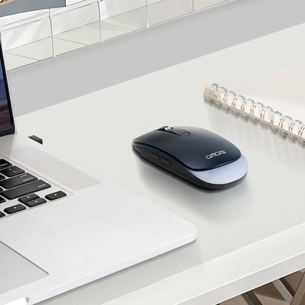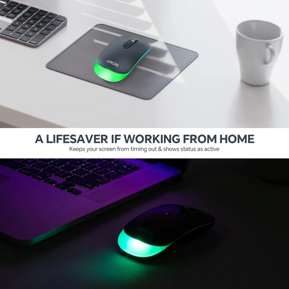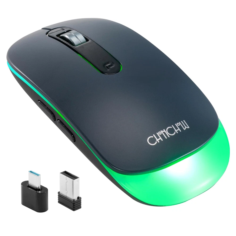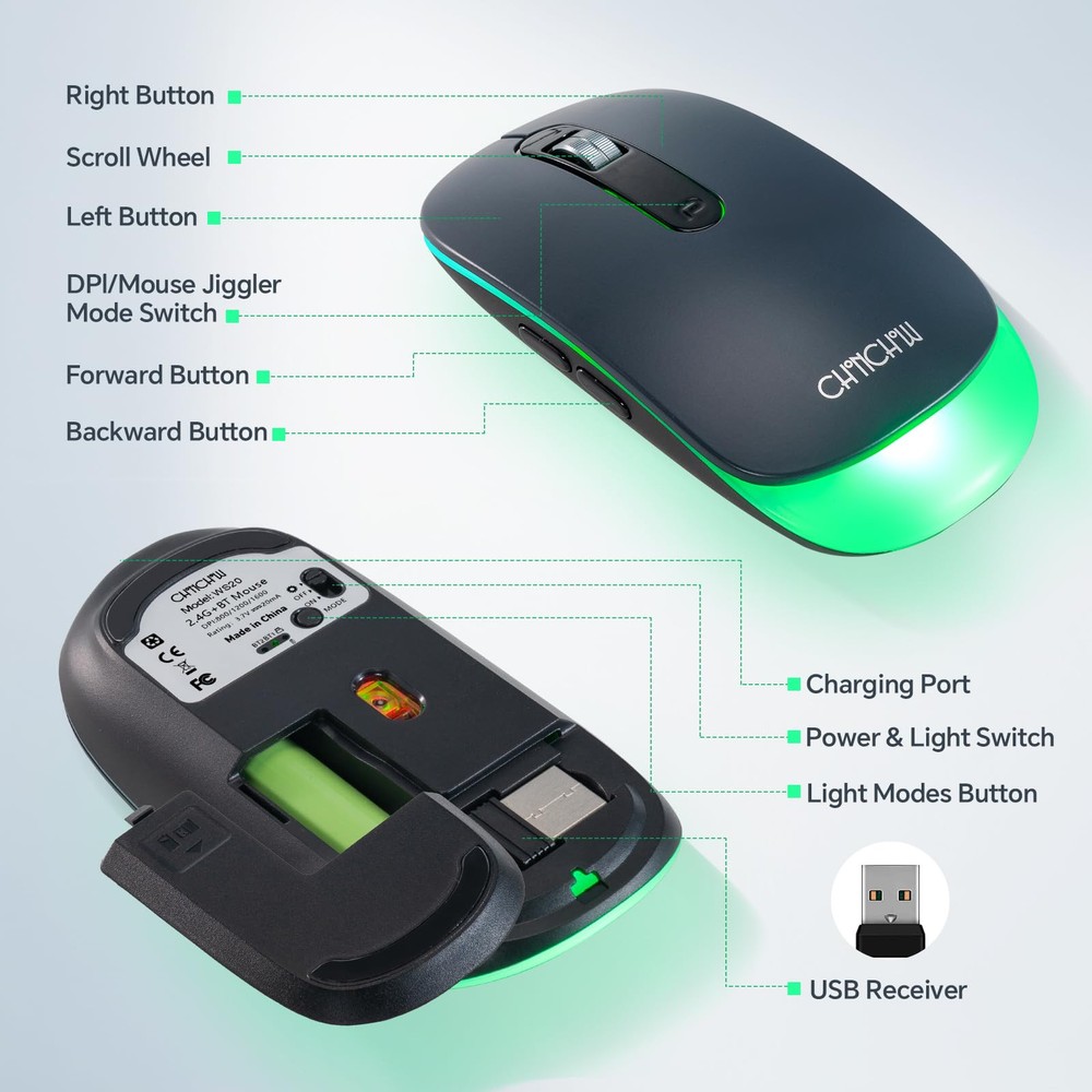 Rechargeable Big Battery Mouse -- Works continuously more than 50 hours if you don't need the backlight. That means that you just need one mouse during your one month business trip. And even thought it goes to enpty, you can charge it backup with one USB-C cord which can be found wherever. With the worst situation, you just need to buy one normal AA battery to exchange to use temporarily. Multi Connect Method Mouse -- Support 2.4G usb receiver/ bluetooth method and packed with C-adapter can patch USB-A and C jack. Works for almost all Laptop/Tablet/Desktop/Phone and smart TV. Rechargeable Big Battery Mouse -- Works continuously more than 50 hours if you don't need the backlight. That means that you just need one mouse during your one month business trip. And even thought it goes to enpty, you can charge it backup with one USB-C cord which can be found wherever. With the worst situation, you just need to buy one normal AA battery to exchange to use temporarily. Ultra-silent Click -- Without extra sound, all buttons has the silent switch. Control the voice under 15dB. Even you use next to the bed, you are not the bothering. Easy Cycle and Soft Backlight -- Not to the real game device, it has easy outlooking and relaxed LED backlit. Not the cool shape. It is not the metal feelling and give us room to dream. Wide Compatible -- This slim wireless mouse is compatible with Mac Windows 7/8/10 for PC laptop tablet in office with C-adapter cord and manual.Use without any level of difficulty.