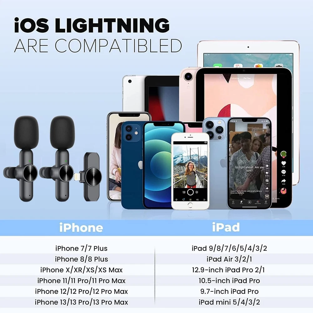 - Brand New - Never Used - Questions: Feel free to ask any Questions - BOX: Never Opened - DESCRIPTION: • 🎤【Wireless Lavalier Microphones for Phone】 This dual wireless lavalier microphone set built-in noise reduction chip, real-time auto-sync technology, and 2.4G signal transmission with ultra low latency (0.009s), the sound picking-up follows the picture in real-time. Lapel microphone wireless can easily cope with various noisy environments and truly restore human voices. (You can also use one mic and receiver set). * 🎤【Omnidirectional Mic with Noise Reduction】 With intelligent technology chip, the omnidirectional condenser lavalier mics pick up sound from all angles, and offer stable full-band 48KHz CD quality. It’s built with a sponge windscreen to reduce wind noise and plosives, AI algorithm intelligent noise reduction module can accurately filter all kinds of noise and has strong anti-interference ability. It can easily cope with various noisy environments and truly restore human voices. * 🎤【Plug AND Play】 No Bluetooth, No APP needed! Just plug the Lightning connector into the Phone, and clip the mini microphone onto the shirt, and it starts working in One Second. 2 packs of lav mic allow two people to get involved in a video recording together, providing efficiency and convenience for a team worker. Suit for Vlog, Interview, Live streaming, YouTube, TikTok, Podcast, Instagram, Online video tutorial, and Singing recording, etc. * 🎤【Long Working Time & Effective Distance】 Wireless microphone transmitter has built-in rechargeable battery with working time up to 8 hours. 65ft barrier-free effective distance & 0.009s delay in transmission allow you to move around. * 🎤【Compatible with iOS Devices】 The upgraded lapel mic is compatible with iOS system and can be use with iPhone and iPad. Without usb c type interface connected to your mobile phone, it can not be used with android devices. - OFFERS: Reasonable offers are considered, LOWBALLERS, Best price and Lowest askers will be ignored - all sales final/no refunds/ no exchanges/ no returns - Disclaimer: I do not own the brand's trademarks, logos, pictures, or products posted. I do not intend to infringe on copyright. I find such content available on the internet. Contents are considered fair use. -Wireless Lavalier Lapel Microphone for iPhone iPad - Professional Cordless Clip On Lav Mic, Plug-Play Auto Sync Noise Reduction Mini Microphone for Video Recording Interview Vlog YouTube Live Stream
