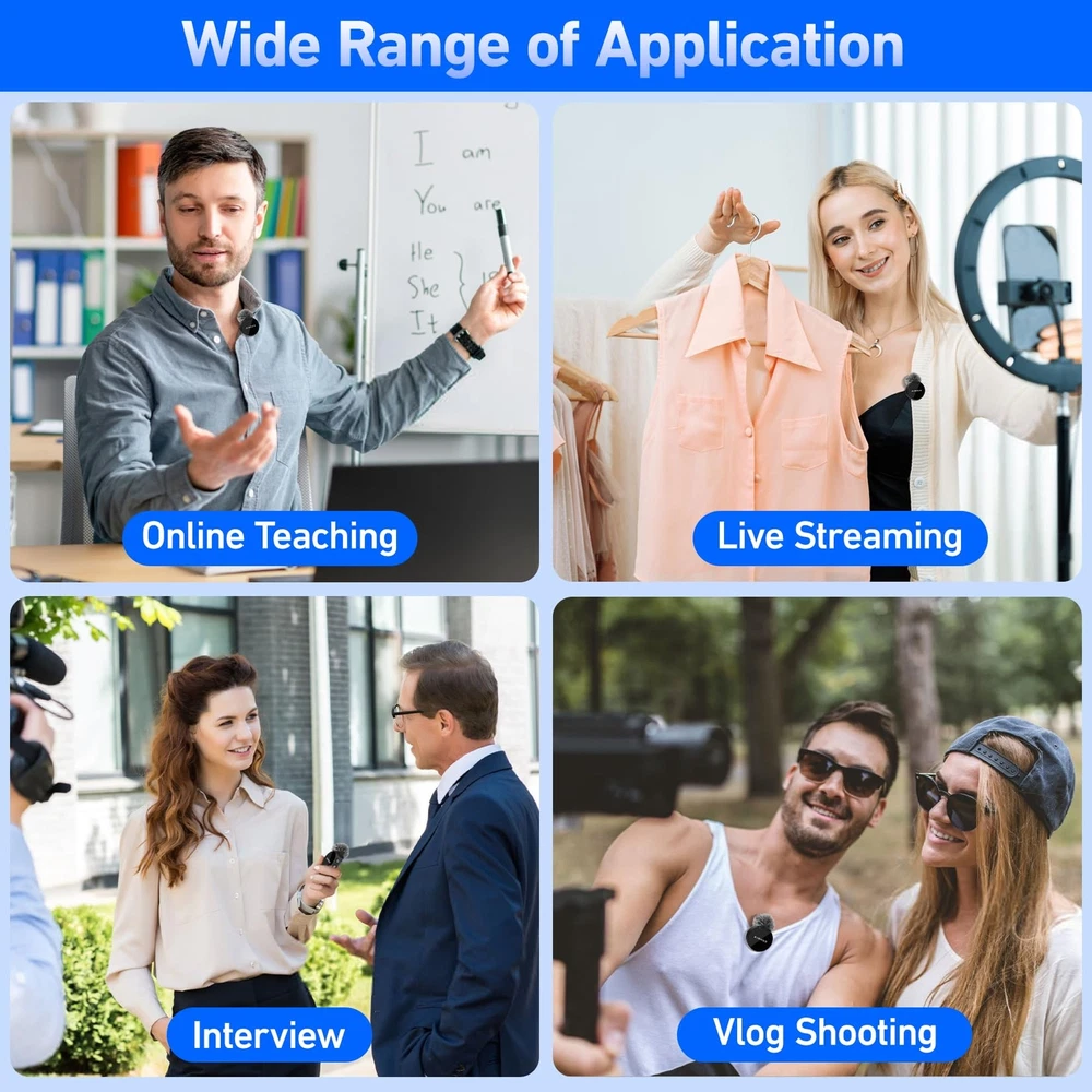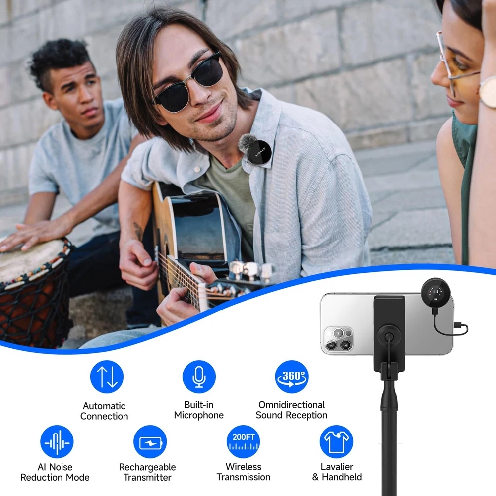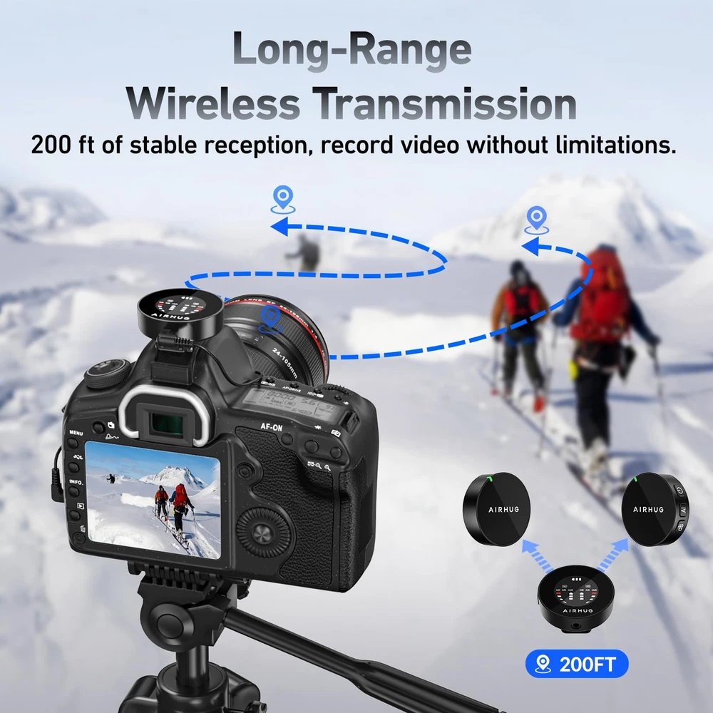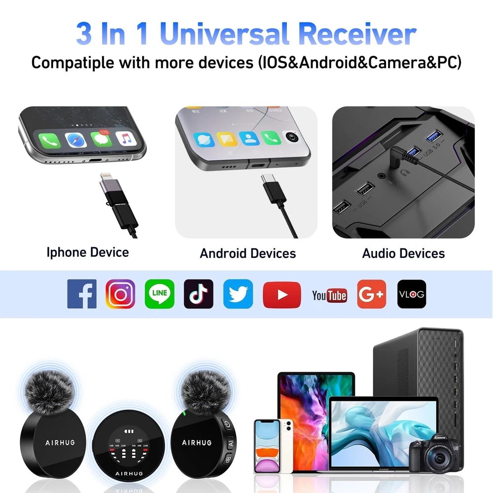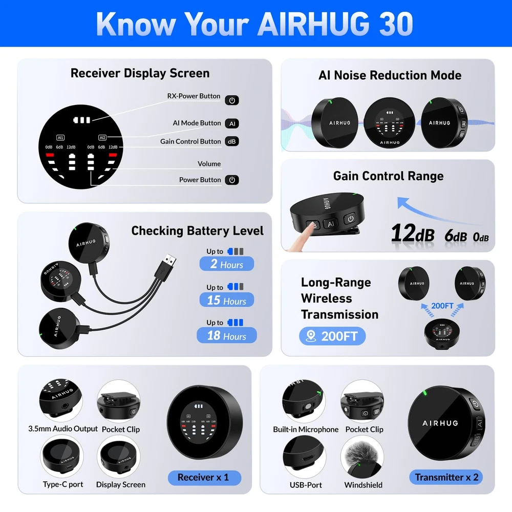 30 is a mini wireless lapel microphone Set with 2 transmitters (TX) and 1 receiver (RX). 【Universal Compatibility, Easy Switching】- This wireless lavalier microphone comes with 2 transmitters (TX) and 1 receiver (RX), which can be easily connected to a variety of devices, including smartphones, tablets, computers and cameras. Seamless switching between USB-C digital output and 3.5mm output to meet various needs. It is compatible with iOS,Android,Windows and Mac. 【Auto Pairing】- When you turn on the power of the receiver and transmitter, they will automatically pair. Plug and play mini microphone, no delay effect, make work more efficient. 30 is very easy to carry. The clip on the receiver can clip on the USB-C cable when you use it for the mobile phone. 【200 ft Wireless Range】-200 feet of stable reception, unlimited video recording. This feature is great for recording interviews, weddings or live broadcasts and other outdoor scenes. The wireless microphones adopt a convenient clip-on design that can be firmly fixed on clothes or hats for hands-free recording. Its wireless function allows you to move freely without being bound by recording equipment. 【Care Gain Levels】- The gain control of AlRHUG 30 lapel microphone largely ranges 0dB,6dB, 12dB. It ensures the mini mic captures a strong enough sound signal. When your audio signal may be too quiet or weak at different environments,you could place extra gain levels added to the microphone to make it louder. Transmitter Gain adjustment feature is particularly suitable for outdoor, such as travel vlog, outdoor sports short videos and motorcycle riding volg, etc. 【Pick up your voice any time,adjust Gain Levels】If you mind the transmitter appearing in your video, you can put it in your pocket. At the same time, adjust the gain level from 0dB to 6dB or 12dB. Even if the transmitter is a certain distance away from the sound source, the 30 transmitter still can pick up our voice very well. 【18H Long Battery Life】Charge for 2.5 hours and use for 18 hours. Only a short charging time is needed to get a full 18 hours of use time, which allows you to plan activities more effectively. Whether you use it for work, entertainment, or personal tasks, you don't have to worry about finding a power source during the day. The 32-bit float ensures clear audio. 【AI Noise Reduction Mode】- When you perform one-click AI noise reduction for the 30, the microphone provides excellent sound quality and clarity, which is great for professional recording, vlogging, and youtube production. Its advanced noise reduction technology ensures that your voice is clearly conveyed. Lavalier mics can minimize or eliminate unnecessary background noise or interference. You don’t even need to perform noise reduction on the sound of the post-production video. 【Non-AI Mode】-The non-AI noise reduction mode of the 30 wireless lav mic is very helpful to you. When you need to pick up the original background sound you want, the non-AI noise reduction mode of 30 can clearly record every sound byte, which meets your needs very well. It is very suitable for eating shows, pet short videos, cooking recording videos, etc.