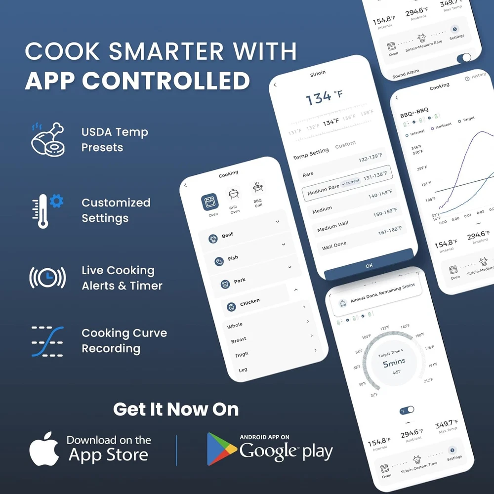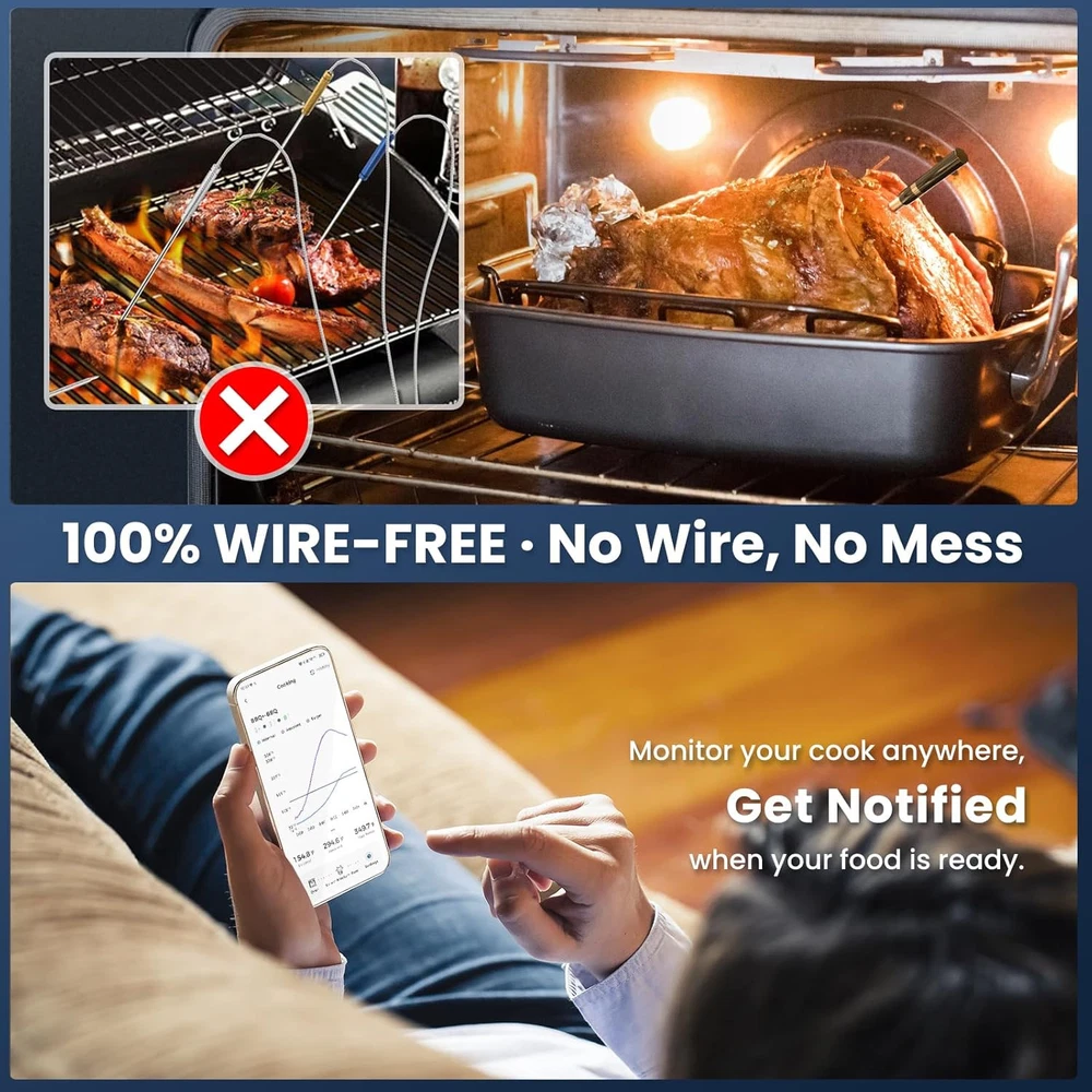 Wireless Meat Thermometer for Grilling and Smoking, CP10 New Gen 500FT Black Product Details Package Dimensions : 7.32 x 2.52 x 2.36 inches; 9.91 ounces Item model number : CP10 Batteries : 1 Lithium Polymer batteries required. Manufacturer : IDIAK Country of Origin : China Brand: IDIAK Special Feature: Waterproof, Alarm, App Companion, Fast Refresh, High Accuracy Color: Black Age Range (Description): Adult Included Components: CP10 Hub, Wireless Meat Thermometer Probe, User Guide, Type-C Cable Outer Material: Plastic Specification Met: FDA, CE, FCC, RoHS Display Type: Digital Connectivity Technology: Remote App Product Care Instructions: Wipe Clean [Unique Design Concept]: The unique design of the wireless meat thermometer CP10's charging hub, fashioned to resemble a Time Capsule, symbolizes more than just a tool for precise temperature measurement; it represents a vessel for preserving cherished culinary moments through time.The Wireless probe handle adopts a Four-Clover Design, making it an excellent gift for husband, father, wife, or any friends who enjoy food. [Truly 100% Wireless Freedom]: Our kitchen thermometer allows you to be completely free from tangled wires and connects using innovative wireless technology, you can easily monitor the temperature of your roast within a 500FT range. The smart wireless meat thermometer is suitable for barbeque, ovens, stoves, smokers, grills, air fryers and more! Enjoy the fun of grilling meat freely. [Dual Sensors and Accurately Reading]: Two sensors simultaneously monitor the temperature internal the meat and the ambient, accurate readings in 3 seconds, precise temperature control ensures that every piece of meat you cook is perfectly done, say goodbye to the embarrassment of overcooked or undercooked meat. Cook your favorite foods like a master, such as chicken, steak, fish, turkey, pork, brisket and more. [Smart APP]: The iDiAK APP is preset with USDA temperatures or customize it yourself. Choose the food or temperature you need to cook and you will be alerted on both your phone and the hub when the target temperature is reached, giving you more time to do what you want to do. Plus the APP comes with a customized timer and temperature chart. [Ready to Use Fast Charging]: As long as the hub has batteries installed and Type-C plugged in, the wireless meat probe can be charged even when the hub is turned off. The probe can be used for over 3 hours with just 5 minutes of charging or over 48 hours with 2 hours of charging. No more worrying about running out of power.