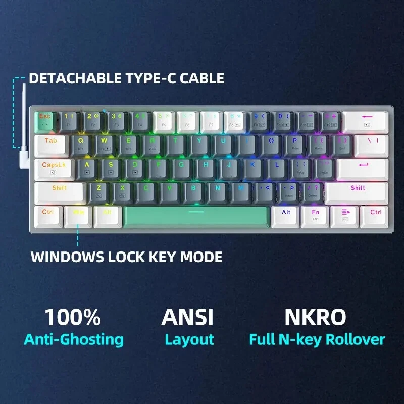 • Wireless Bluetooth Connectivity : Experience seamless gaming with the MACHENIKE K500-B61W's wireless Bluetooth connectivity, allowing you to play your favorite games without any wires. • 60% ANSI Layout : The 60% ANSI layout of this keyboard offers a compact and efficient design, perfect for gamers who value space and convenience. • Hot-swappable Tri-mode RGB : This keyboard features hot-swappable tri-mode RGB, allowing you to customize your gaming experience based on your preferences and needs. • ABS Plastic Keycup Material : Made with durable ABS plastic keycup material, this keyboard is designed to withstand intense gaming sessions, ensuring long-lasting performance. • Multicolor Backlight : The MACHENIKE K500-B61W boasts a multicolor backlight feature, adding a stylish touch to your gaming setup and enhancing visibility in low-light conditions. • WEEE Certified : As a WEEE certified product, the MACHENIKE K500-B61W meets high standards of safety and environmental friendliness, making it a reliable choice for environmentally conscious gamers. FILE K500-B61W MINI 60% FORM FILE K500 SERIES WIRELESS MINI EDITIONED SPECIFICATION * Hot-swappable: 3-pins key switch hot-swappable * Connectivity: wired USB-C / 2.4GHz / Bluetooth * Lighting: Full 16.8m RGB Backlit * Keyswitches: HUANO Red/Brown Switch * Size : 60% Form Factor * Keycaps : Doubleshot PBT + abs keycaps * ANTI-GHOSTING KEYS: N-Key Rollover(NKRO) FEATURES * Doubleshot PBT+ABS Keycaps with printed Secondary Functions * Tri-mode connectivity with Wired USB/ 2.4GHz / Bluetooth ensures seamless integration , plug and play * Full key are hot-swappable with 3-pin keyswitches * Dynamic RGB backlighting. * 100% Anti-ghosting keys & N-key rollover MINIMAL FORM. MAXIMUM JOY. Meet the K500-B61W WIRELESS – a high-performance 60% RGB gaming keyboard that’s easily customizable with wireless freedom to deliver top-tier gaming experience in any setup. 60% FORM FACTOR Our 60% wireless gaming keyboard is ideal for minimalist or smaller setups where desk space is a premium. Its compact build also means it travels well and is easier to position when gaming—allowing you to play more comfortably. HOT-SWAPPABLE KEYSWITCHES K500-B61W WIRELESS has a full-key hot-swappable PCB allowing the users to change the switches to their liking. Switch it up with most compatible 3-pin keyswitches. DYNAMIC RGB BACKLIT With RGB backlit, the entire color spectrum and a range of dynamic lighting effects are at your command. Driver support allow you to create a keyboard that's uniquely yours. GO WIRELESS. TRI-MODE CONNECTIVITY. The K500-B61W WIRELESS feature versatile triple connectivity options for seamless integration, offering wired, Bluetooth, and USB-C connections. EZ FUNCTIONS Unlock efficiency through streamlined actions with versatile key combinations, enhancing overall productivity and user experience. WHAT‘S YOUR CHOICE TROUBLESHOOTING : If you are unable to connect your keyboard with other devices or it can not be used normally in Bluetooth or 2.4G mode, please try the following steps: 1, Please use the brand’s Bluetooth adapter, using other adaptors may cause compatibility issues. Refer to the instructions that came with the adaptor for installation details. 2, Before connecting the keyboard, make sure you have correctly installed the Bluetooth adapter, and that the computer’s Bluetooth device has been properly activated. 3, If you can’t connect, disable or delete the original keyboard connection in the Bluetooth device selection bar, and then re-pair according to the aforementioned steps. 4, Make sure that the computer’s Bluetooth device has not changed. If changed, you must re-pair it again. 5, If your computer’s Bluetooth device is also connected to other Bluetooth terminals, make sure that the speed of the Bluetooth device is adequate. 6, If there is an anomaly in 2.4G mode, follow the steps to re-pair the keyboard and device (pull out the 2.4G receiver and insert it into another valid USB port). 7, Check if the keyboard has a low battery indication. If so, charge the keyboard as per the instructions given in the manual. 8, Ensure that the keyboard is used within a working range of 10 meters. Safety Guidelines 1, Avoid Spills: Keep liquids away from your mechanical keyboard as spills can damage the circuitry. 2, Don’t Pull Out the Cable Forcefully: When disconnecting, pull on the plug rather than the cord to avoid damage. 3, Regular Cleaning: Dust and debris can affect performance. Regular cleaning can prolong the life of your keyboard. 4, Be Mindful of Noise: Mechanical keyboards can be louder than regular ones. Be considerate of your surroundings when typing. 5, Protect the USB Connector: When not in use, unplug and store the keyboard properly to protect the USB connector. 6, Software Updates: Keep the keyboard software up to date to ensure optimal performance. 7, Avoid Dropping: Mechanical keyboards are sturdy, but harsh impacts can still cause damage. 8, Understand Your Keyboard Layout: Mechanical keyboards can have different layouts. Make sure you’re familiar with it for optimal use. USER MANUAL: